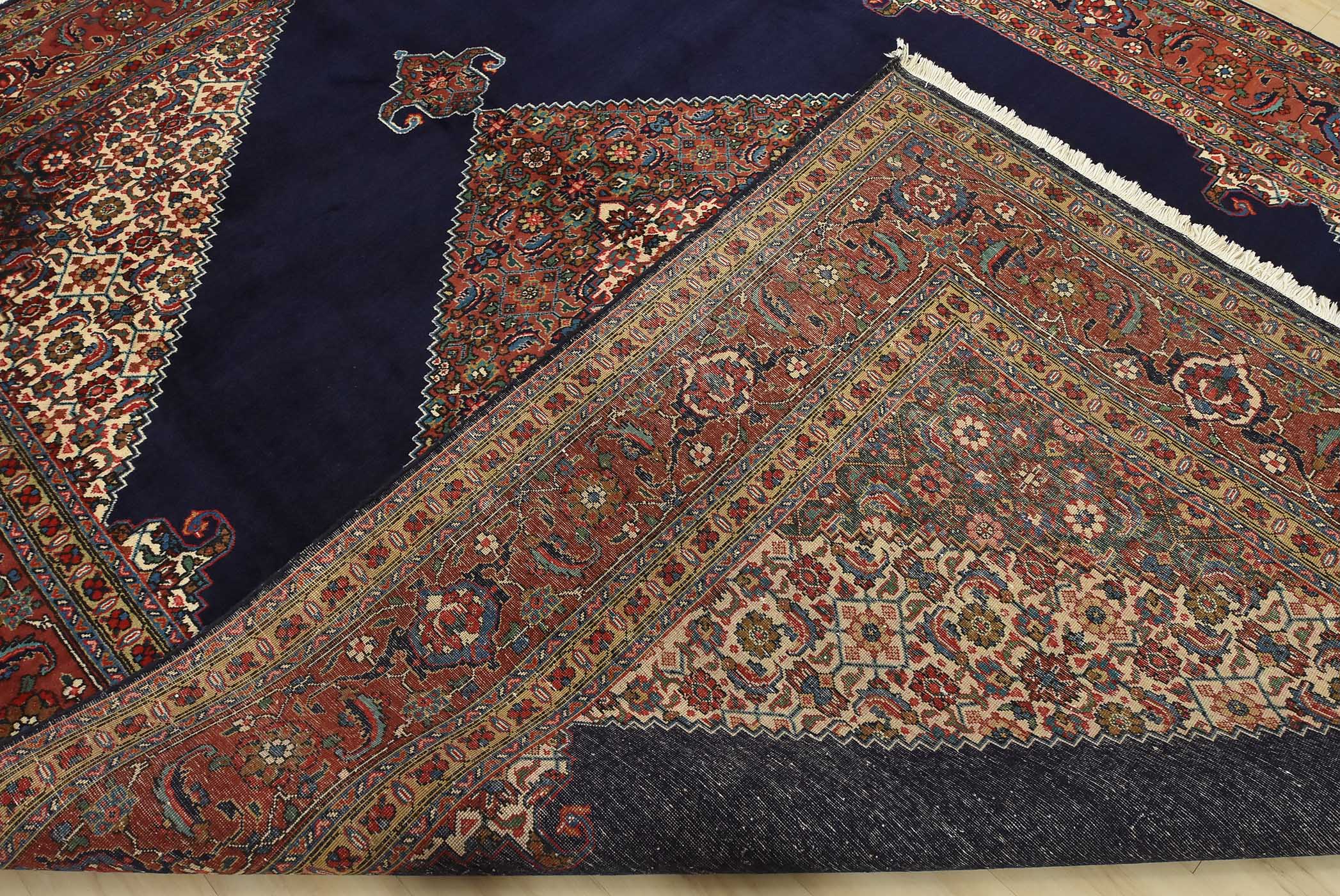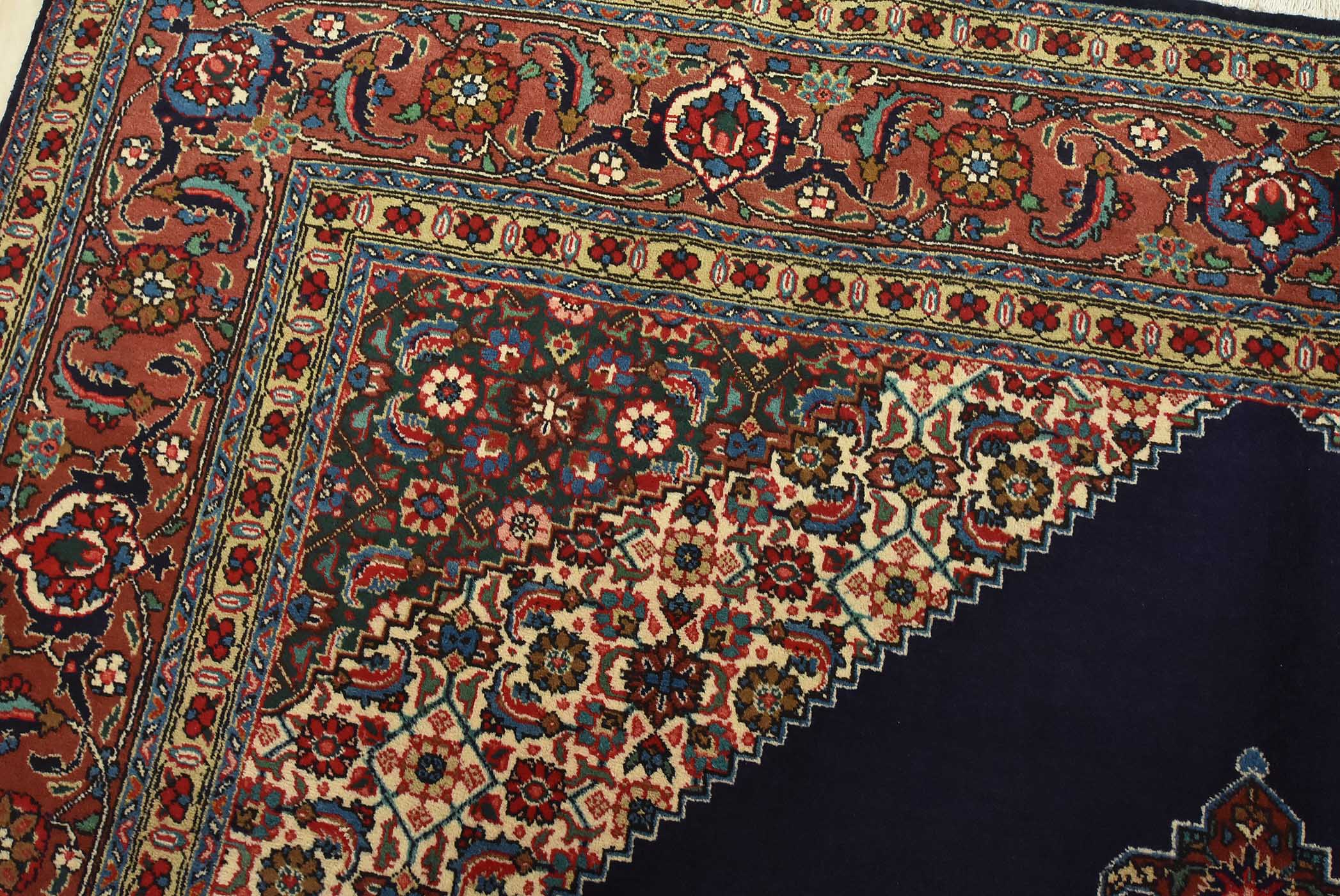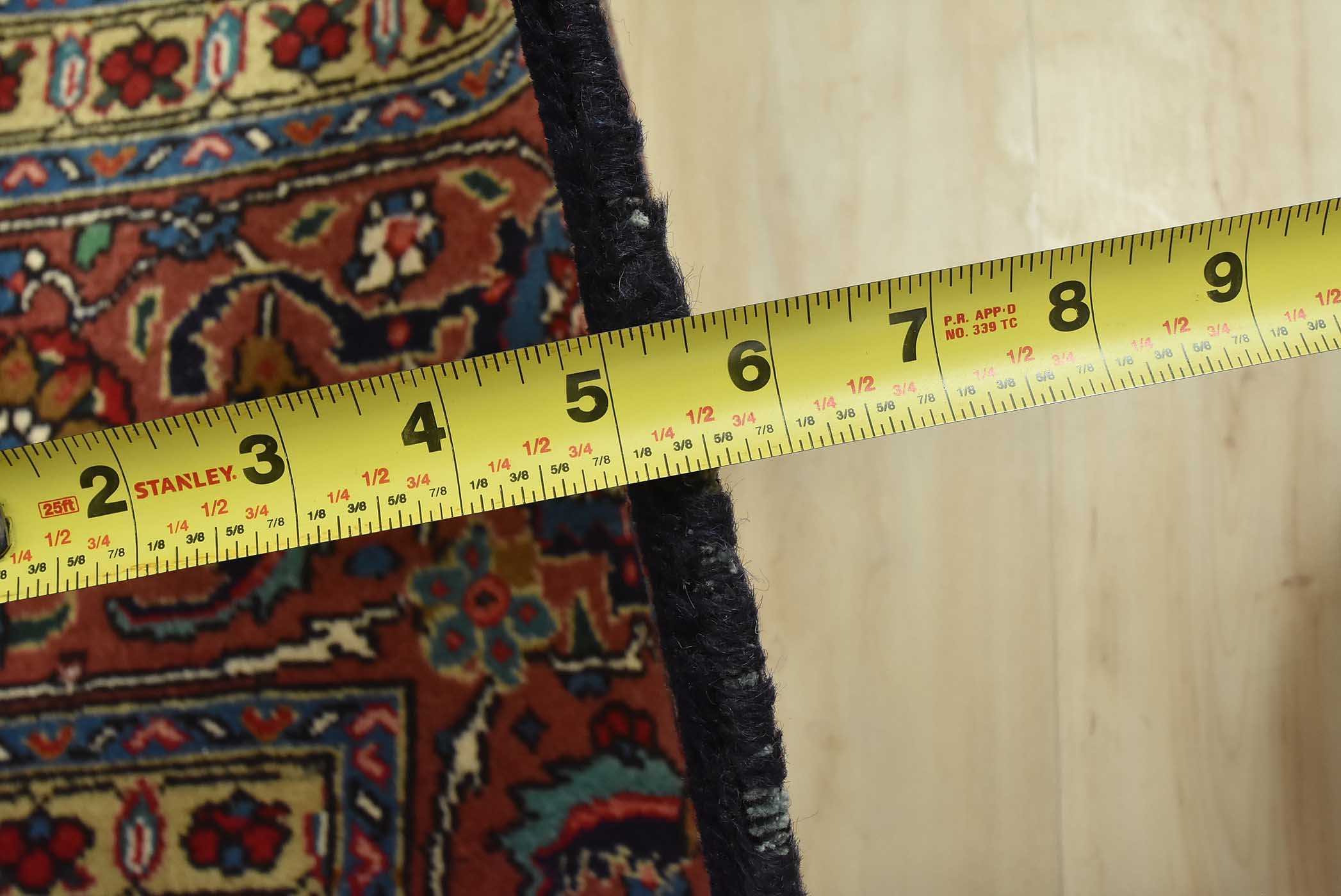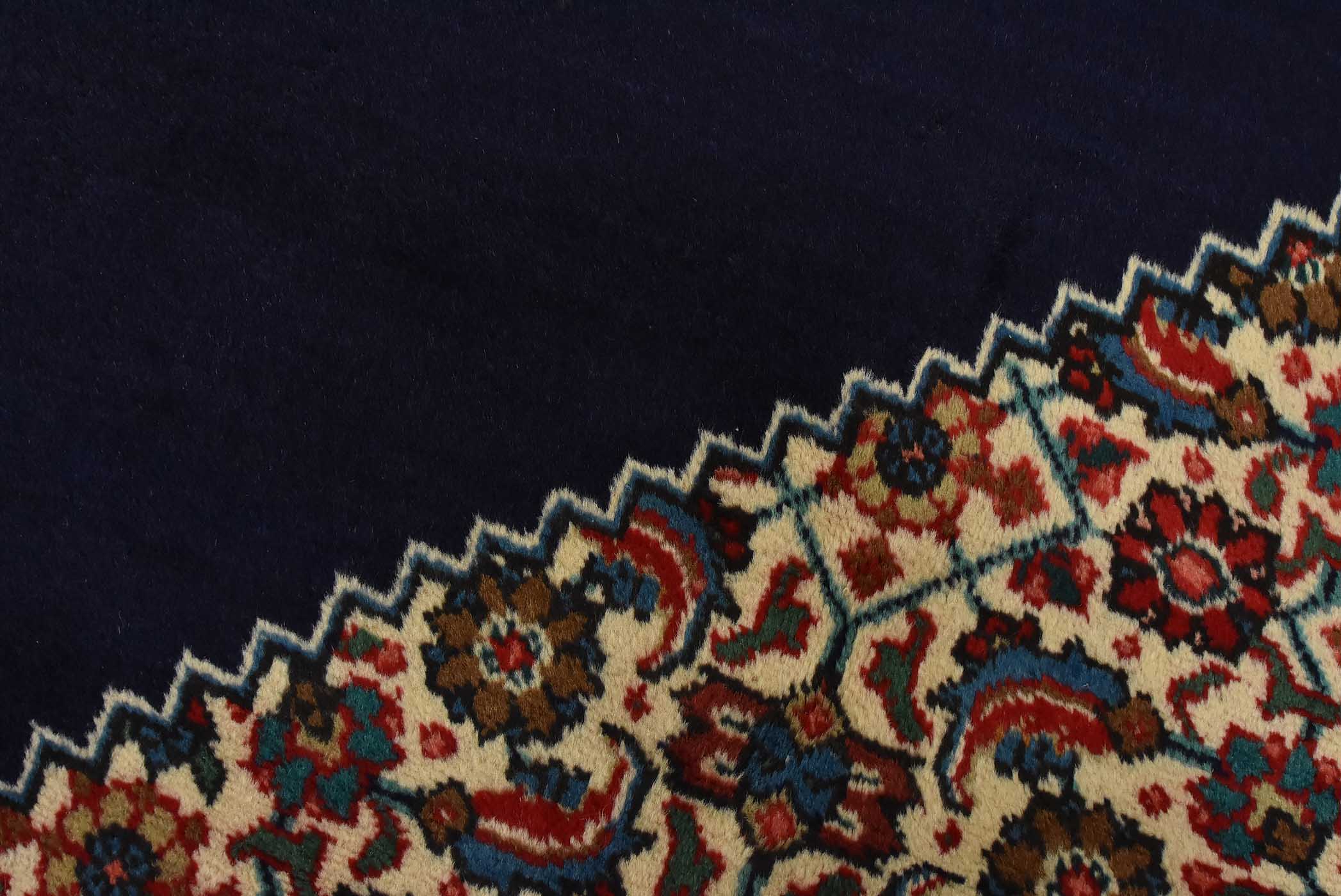 An authentic vintage traditional Tabriz rug hand-knotted with fine wool and natural dyes. This oriental rug features a central medallion adorned with a Herati pattern set against a blue background. The wool pile shows some minor wear; please refer to the photos. Otherwise, the rug is in very good condition.