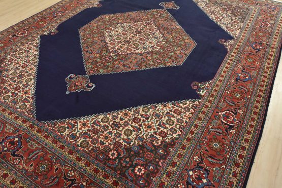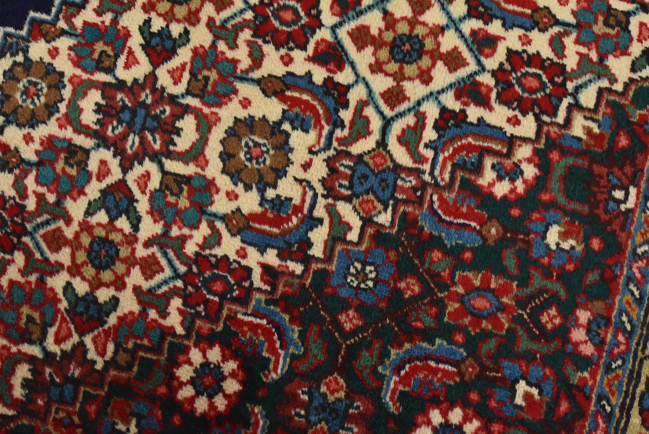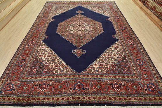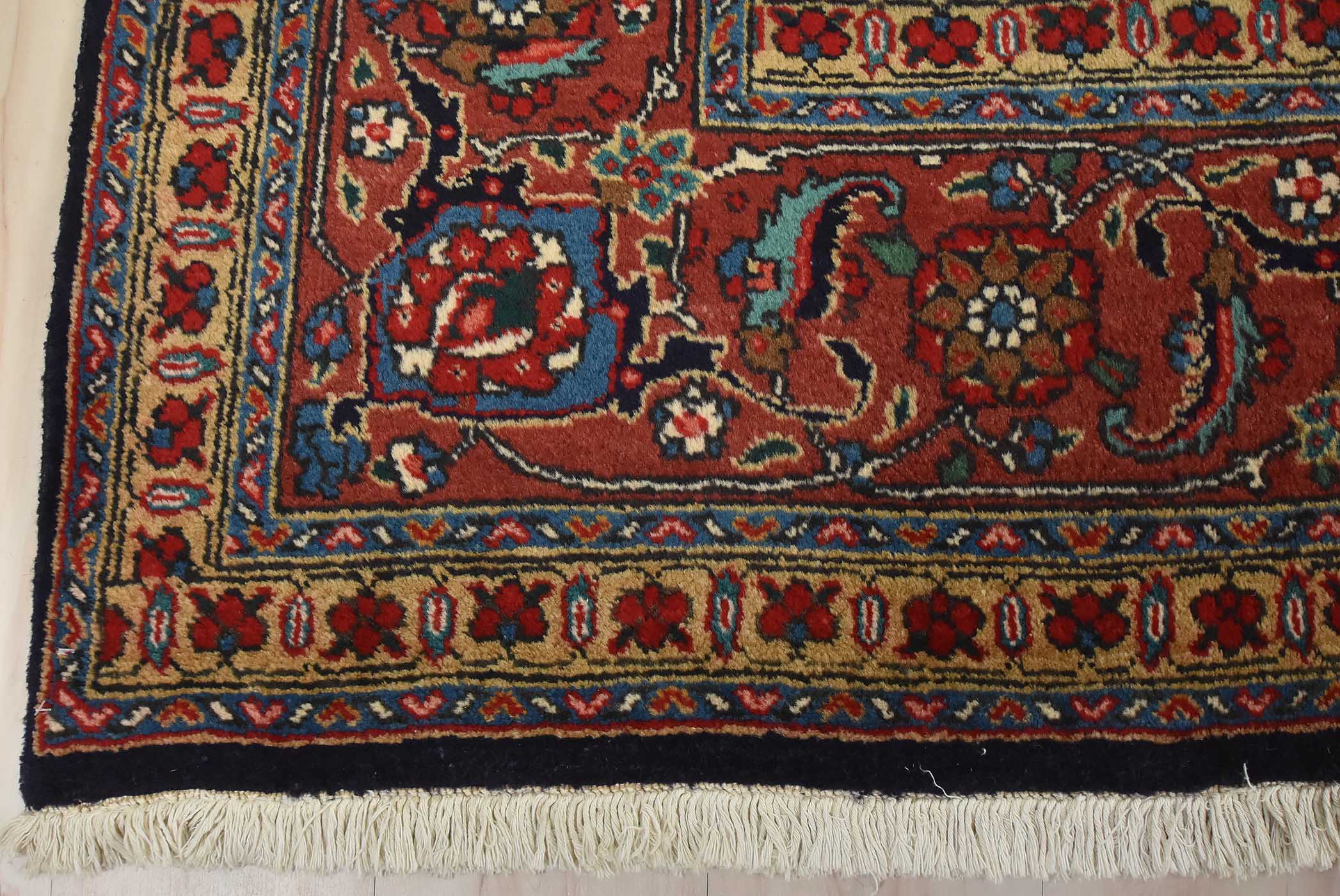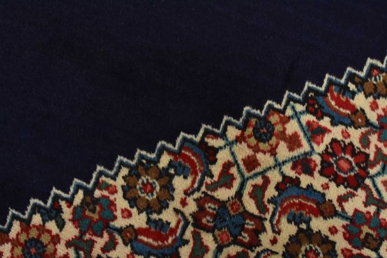 An authentic vintage traditional Tabriz rug hand-knotted with fine wool and natural dyes. This oriental rug features a central medallion adorned with a Herati pattern set against a blue background. The wool pile shows some minor wear; please refer to the photos. Otherwise, the rug is in very good condition.