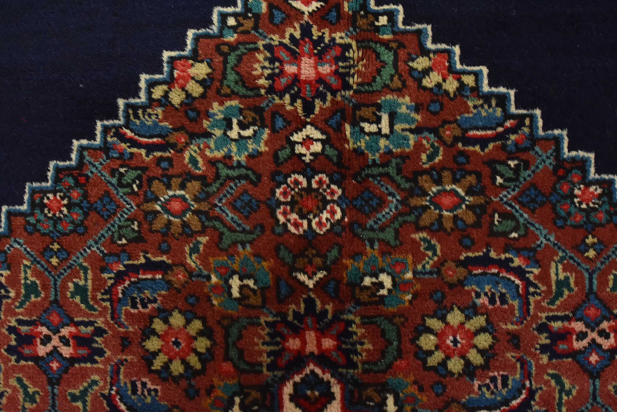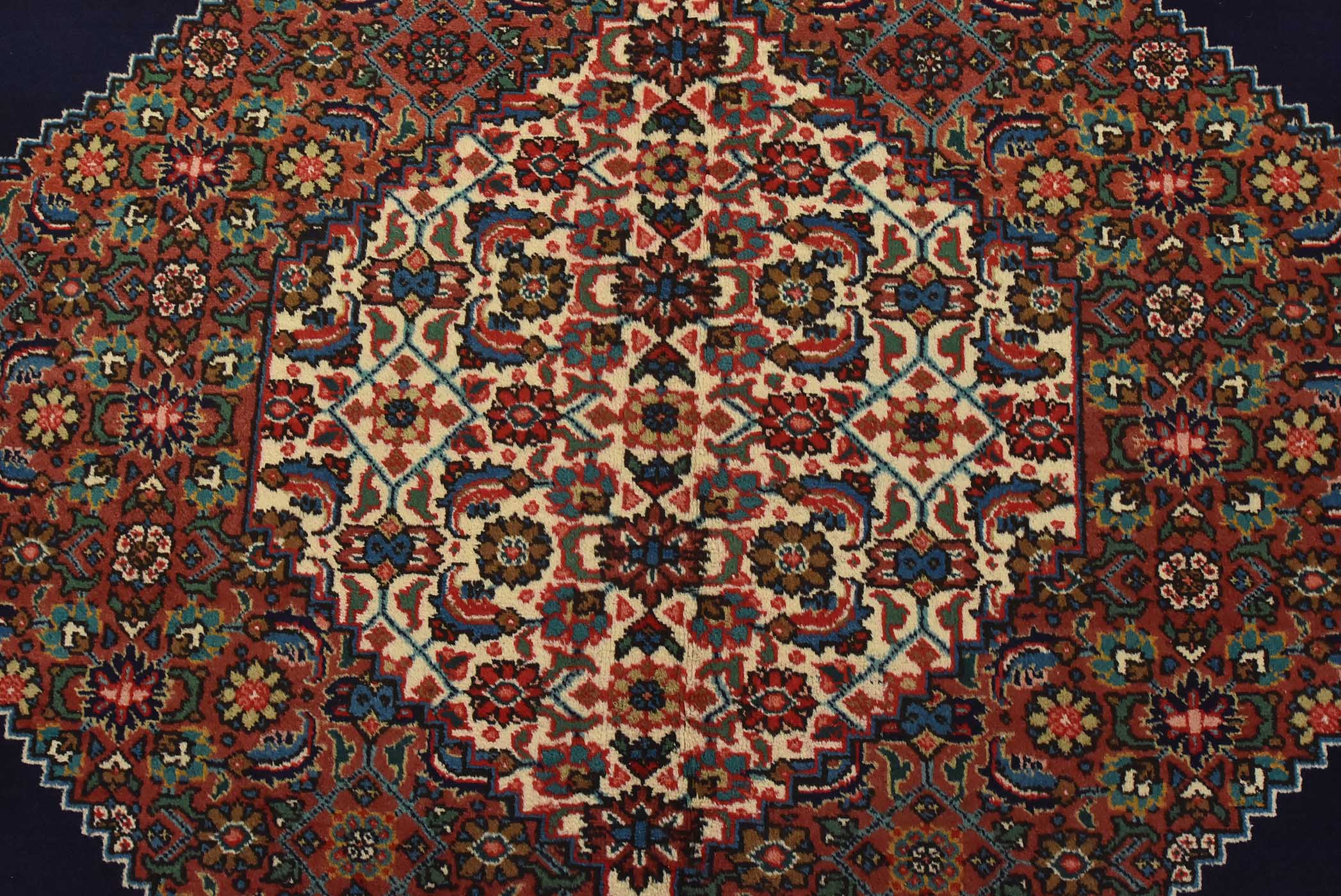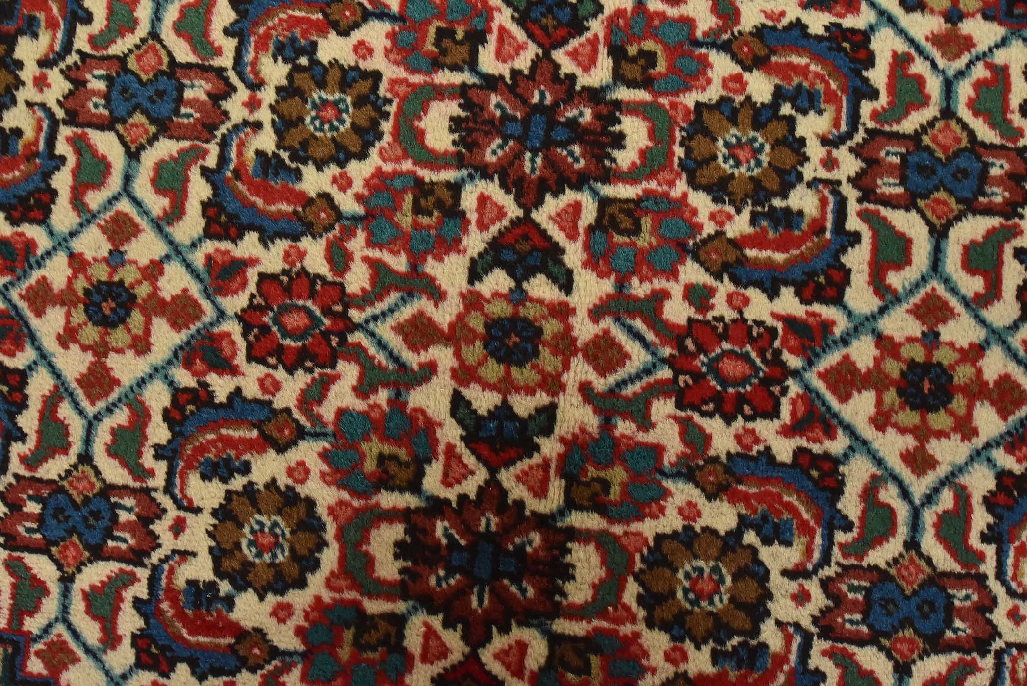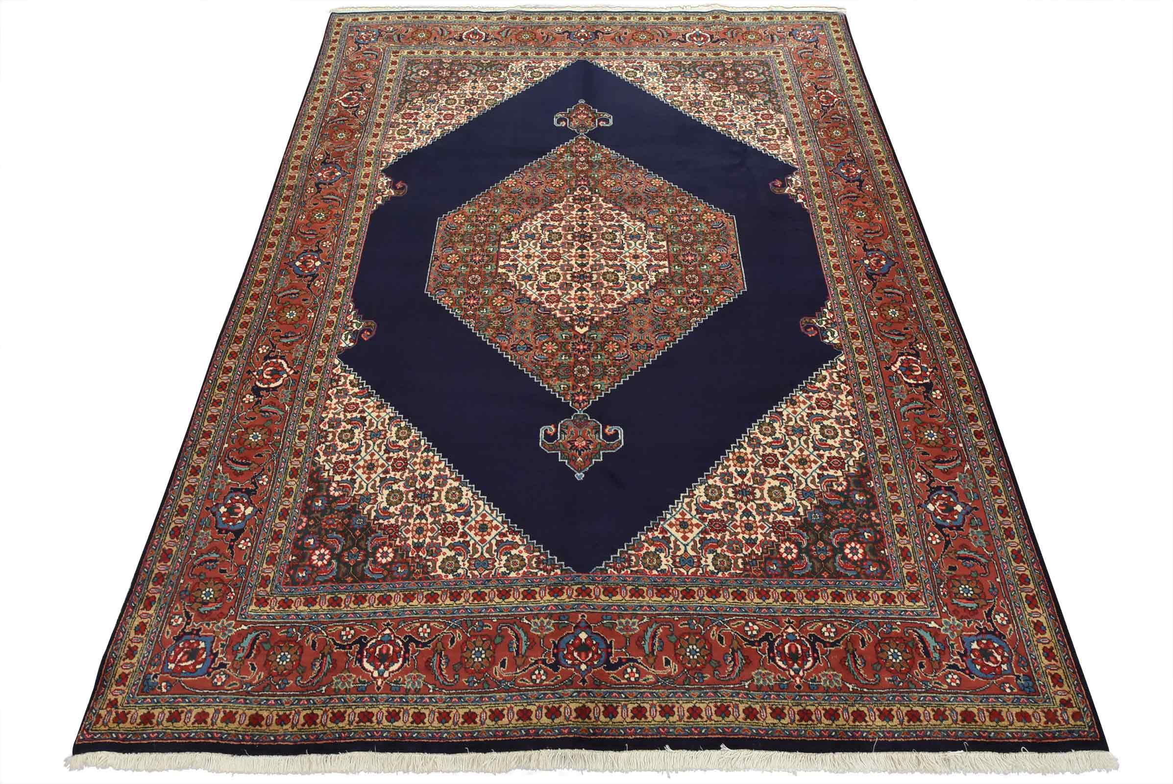 An authentic vintage traditional Tabriz rug hand-knotted with fine wool and natural dyes. This oriental rug features a central medallion adorned with a Herati pattern set against a blue background. The wool pile shows some minor wear; please refer to the photos. Otherwise, the rug is in very good condition.