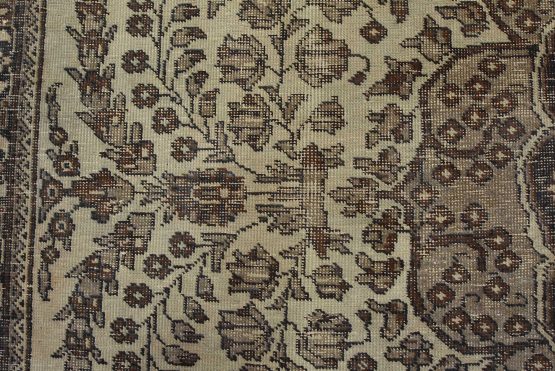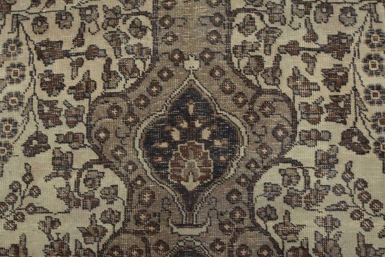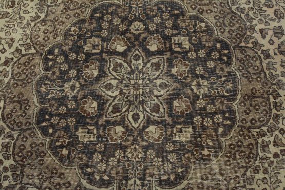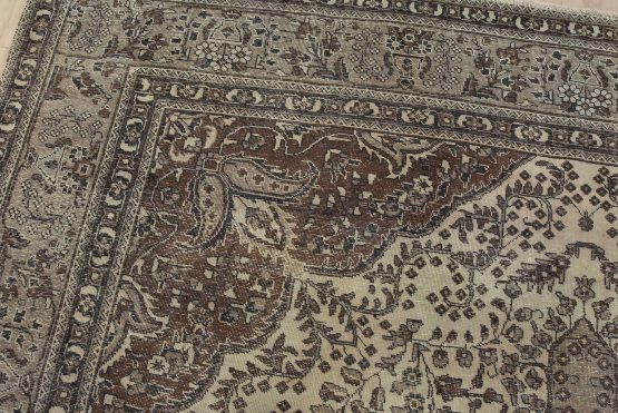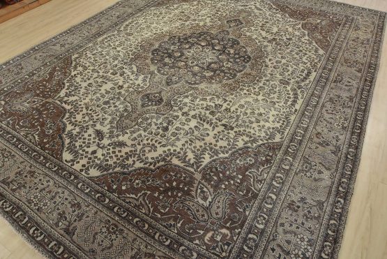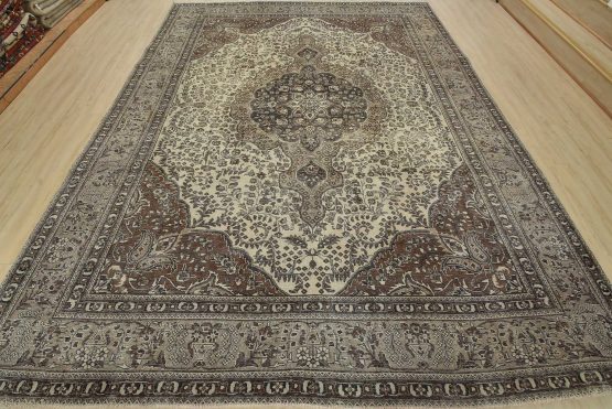 An authentic vintage traditional Tabriz rug hand-knotted with fine wool and natural dyes. This oriental rug features a central medallion surrounded by a floral design set against an ivory background. It has a low wool pile, is worn and distressed, and has minor imperfections (see photos). However, it is in very good condition.