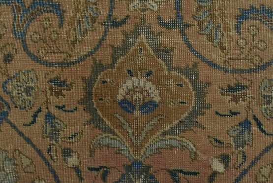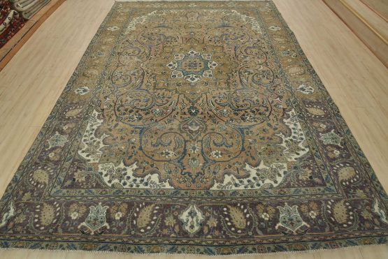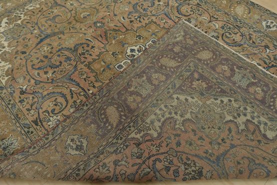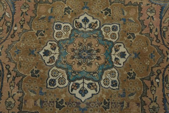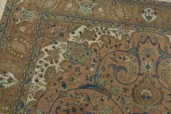 An authentic vintage traditional Tabriz rug hand-knotted with fine wool and natural dyes. This oriental rug features a central medallion surrounded by curvilinear floral designs set against a pink background. It has a low wool pile, is worn and distressed, and has minor imperfections (see photos). However, it is in very good condition.