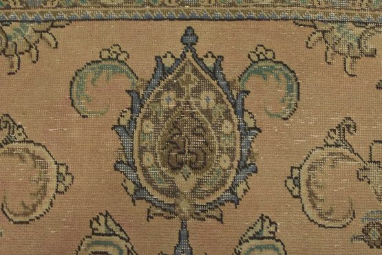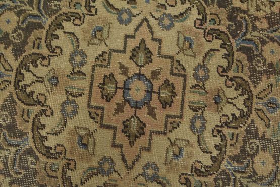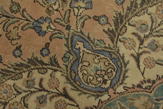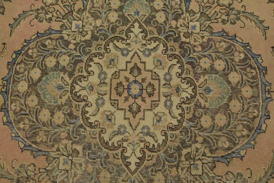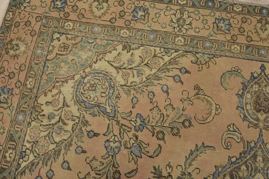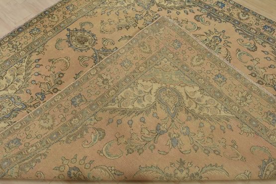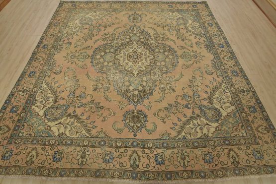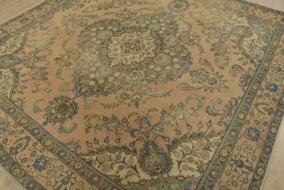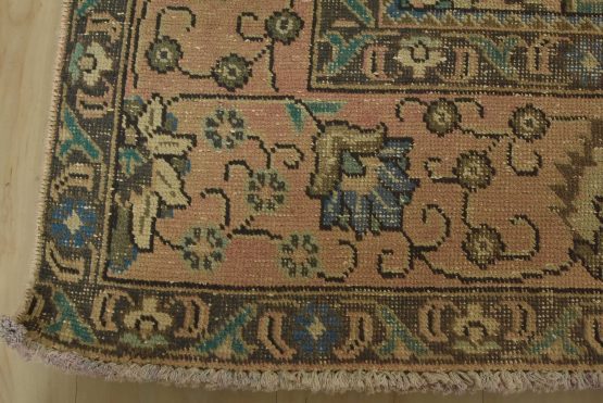 An authentic vintage traditional Tabriz rug hand-knotted with fine wool and natural dyes. This oriental rug features a central medallion surrounded by a floral design set against a pink background. It has a low wool pile, is worn and distressed, and has minor imperfections (see photos). However, it is in very good condition.