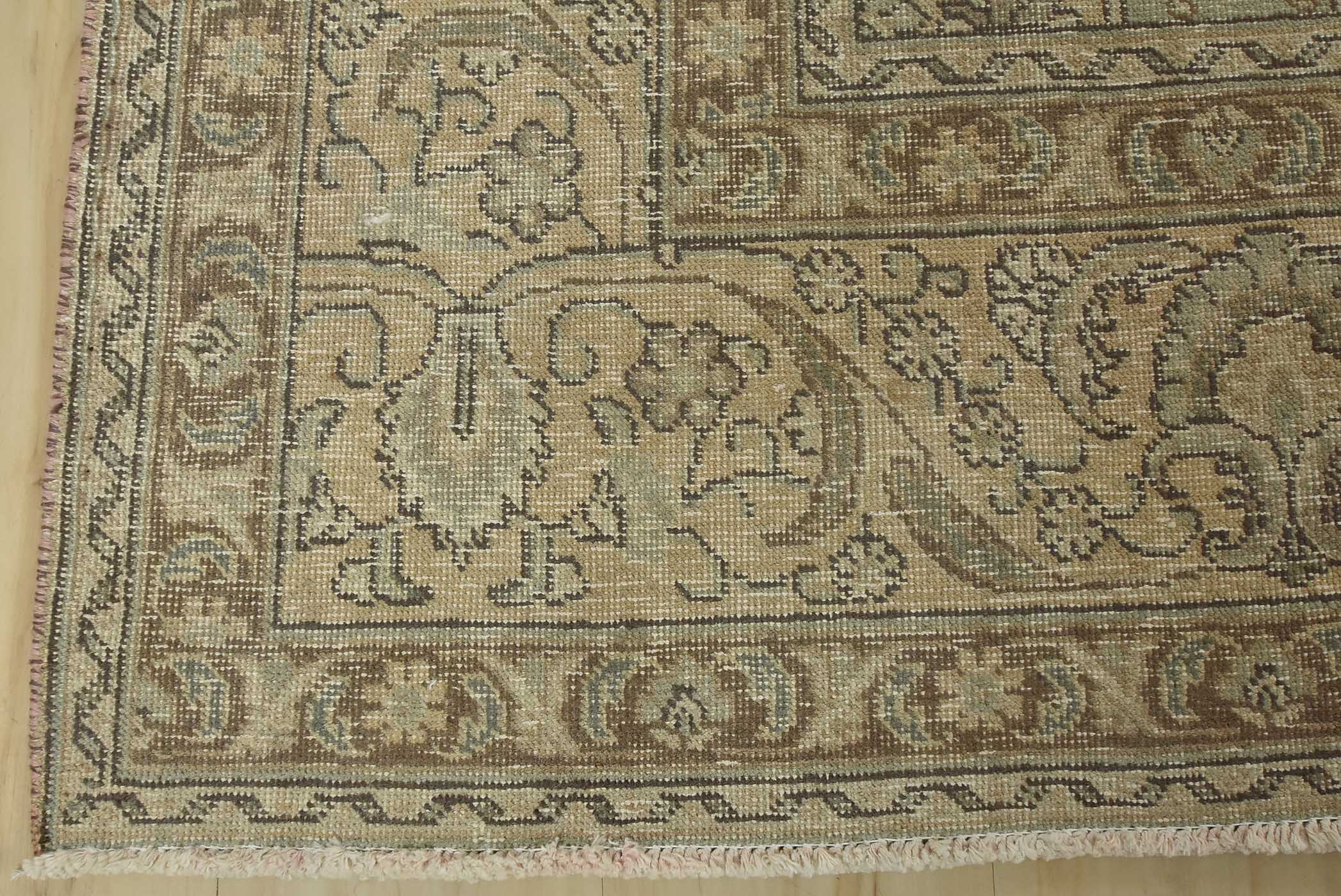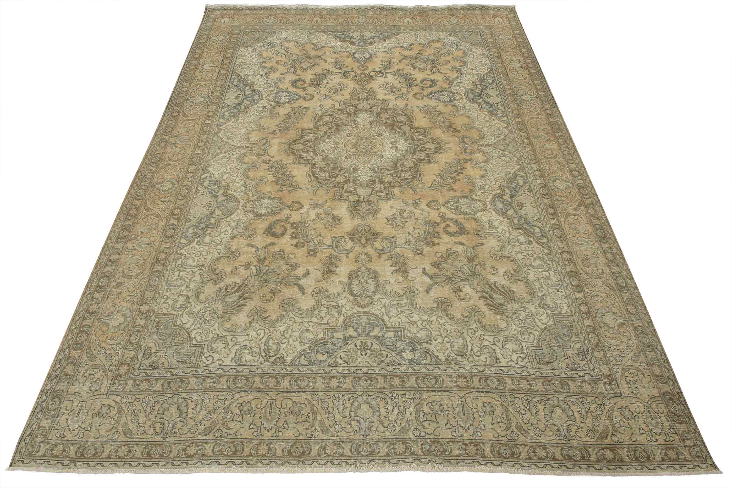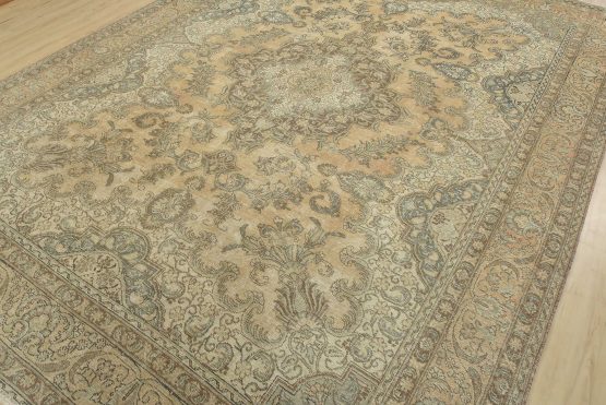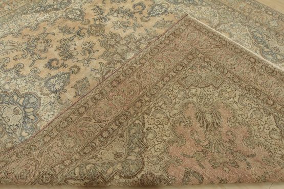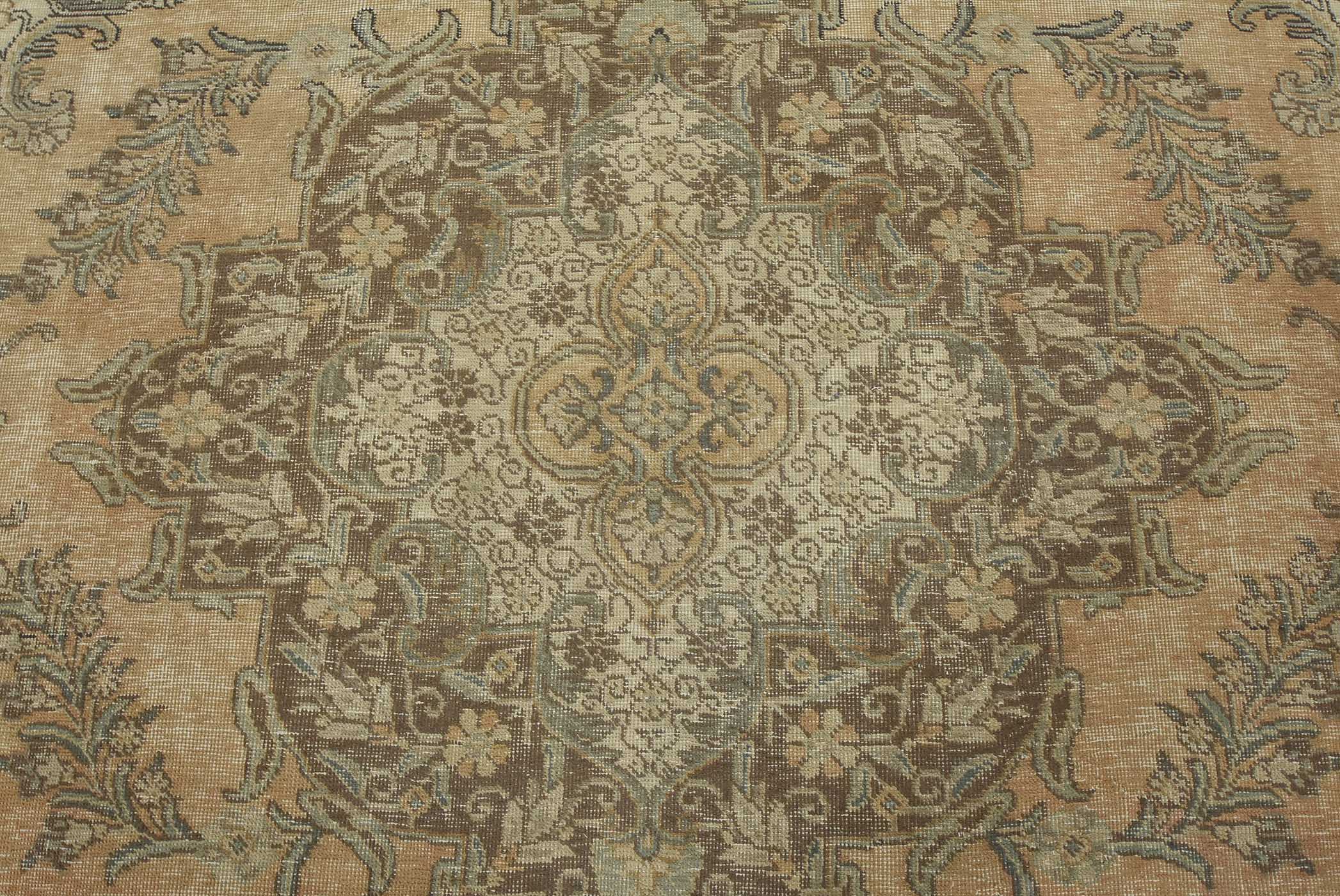 An authentic vintage traditional Tabriz rug hand-knotted with fine wool and natural dyes. This oriental rug features a central medallion surrounded by botanical designs set against a pink background. It has a low wool pile, is worn and distressed, and has minor imperfections (see photos). However, it is in very good condition.