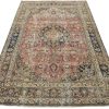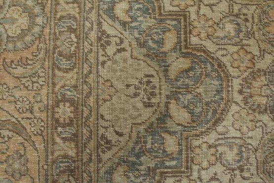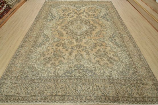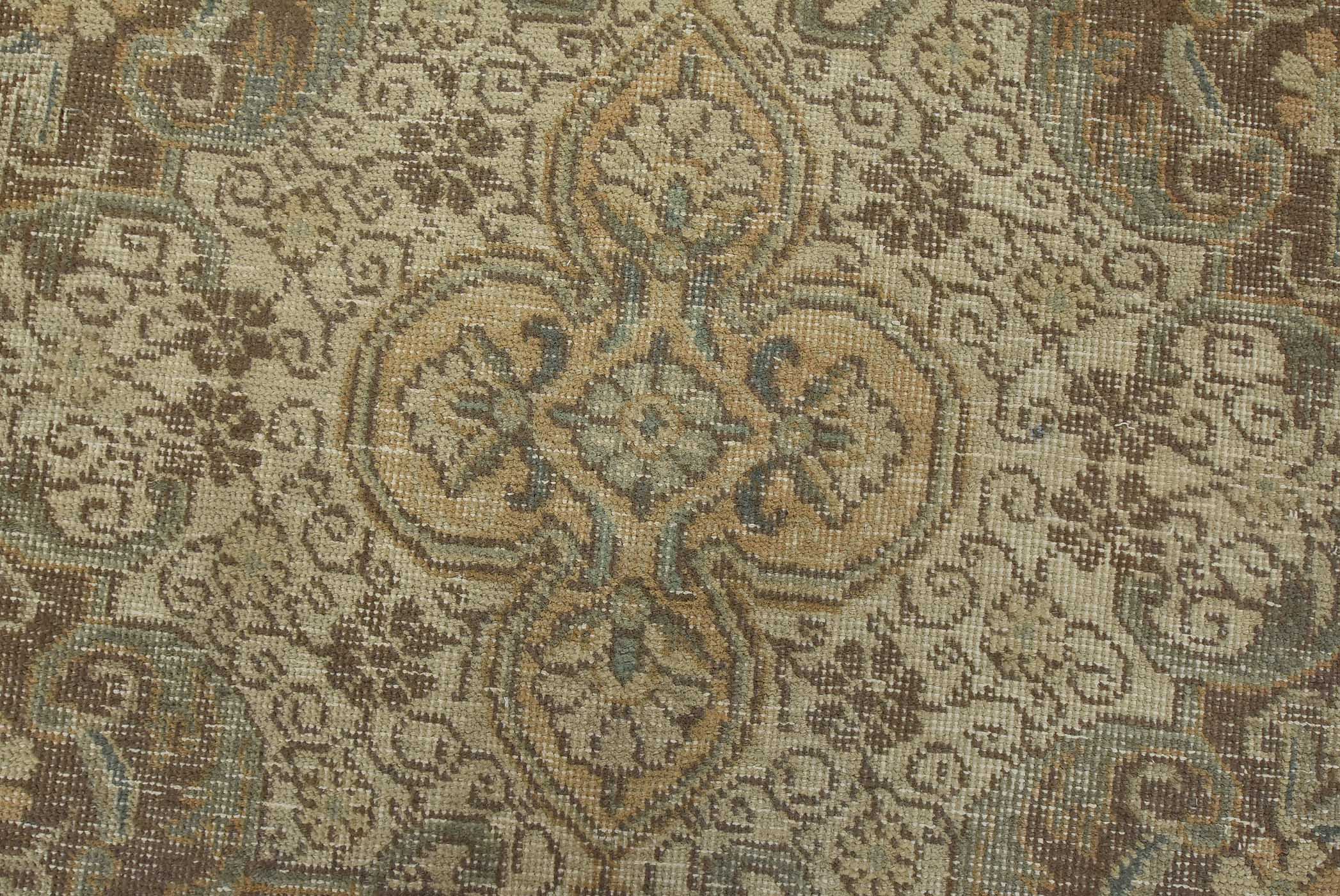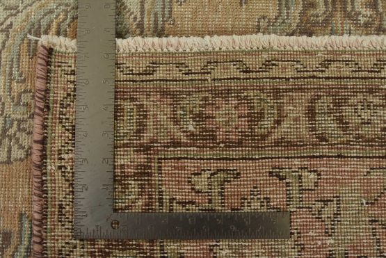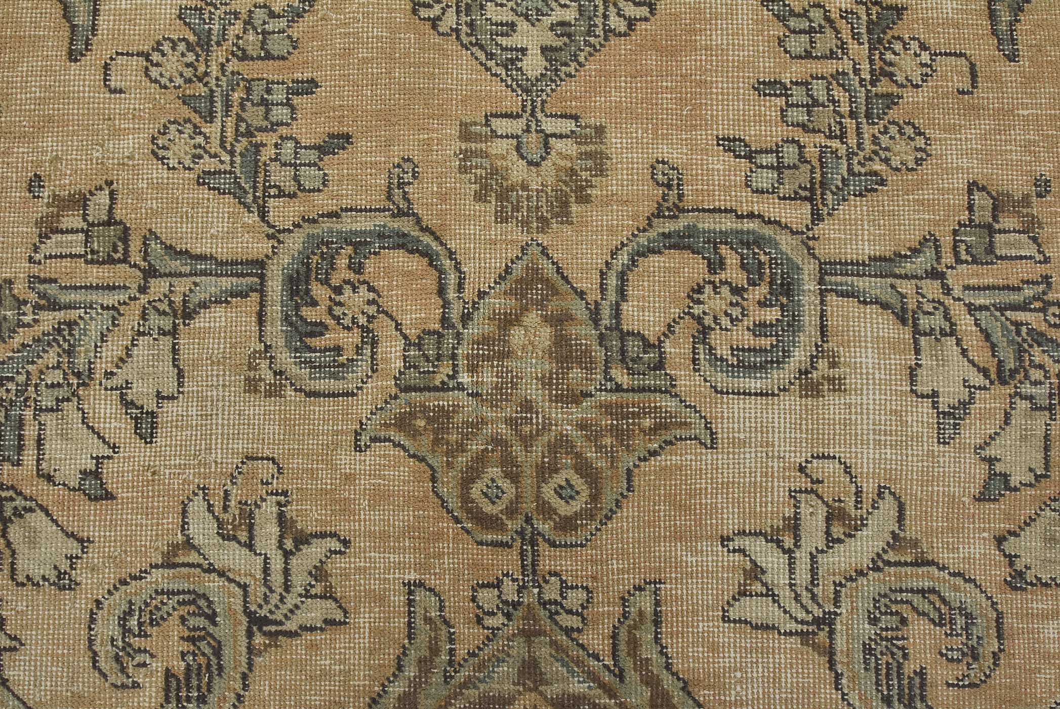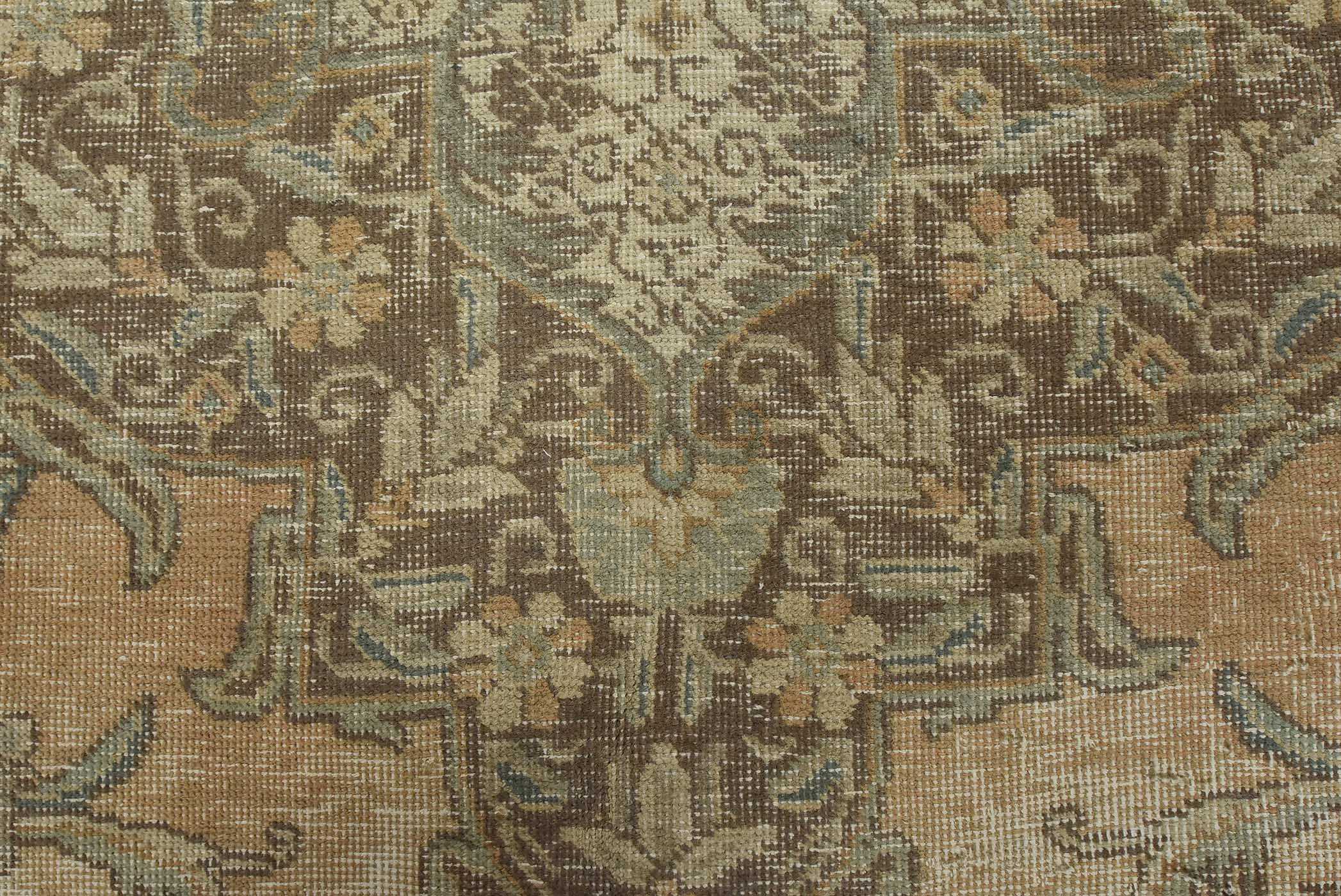 An authentic vintage traditional Tabriz rug hand-knotted with fine wool and natural dyes. This oriental rug features a central medallion surrounded by botanical designs set against a pink background. It has a low wool pile, is worn and distressed, and has minor imperfections (see photos). However, it is in very good condition.