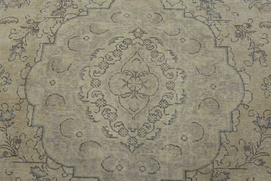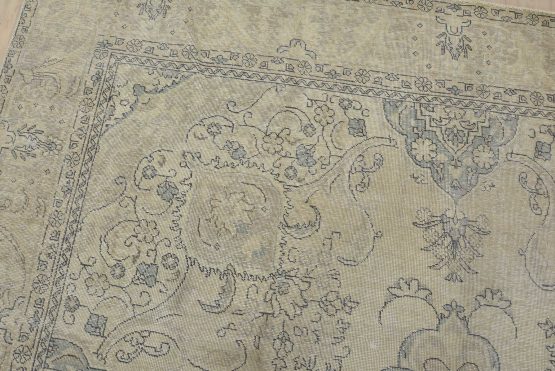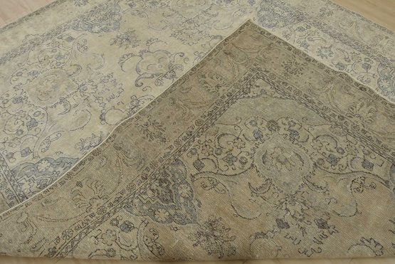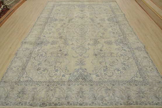 An authentic vintage traditional Tabriz rug hand-knotted with an all-wool pile on a cotton foundation. This oriental rug features muted colors with a central medallion surrounded by floral designs set against a beige background. It has a low wool pile, is worn, distressed, and has minor imperfections (see photos). However, it is in very good condition.