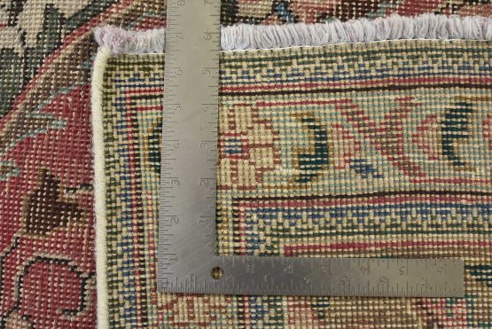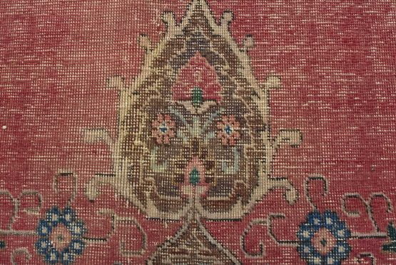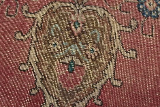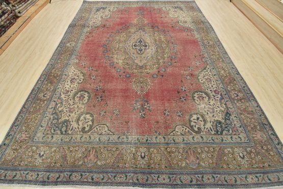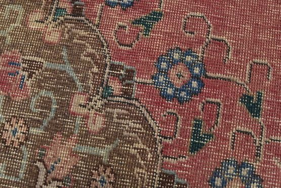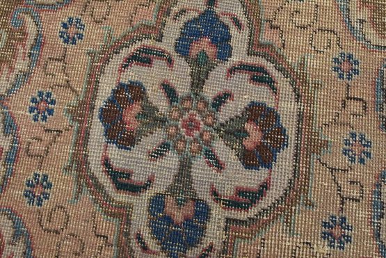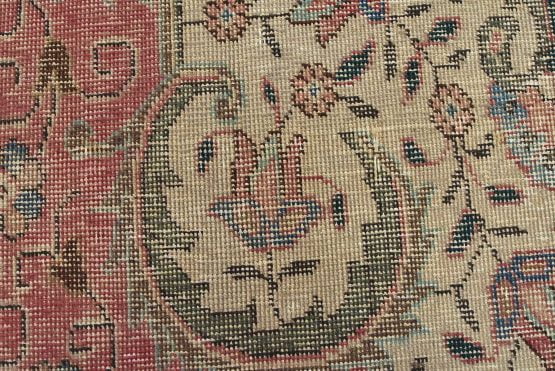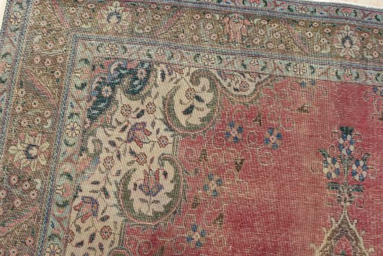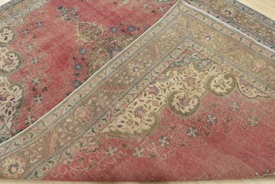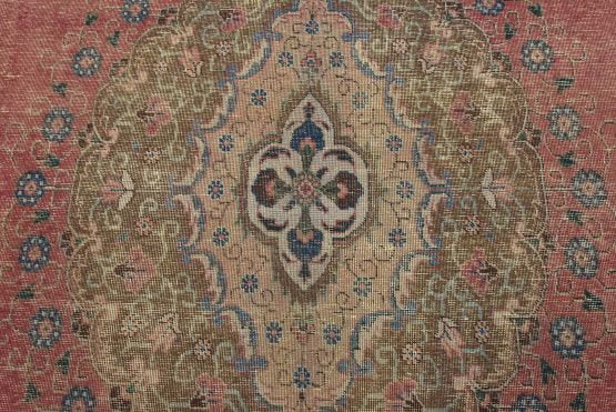 An authentic vintage traditional Tabriz rug hand-knotted with fine wool and natural dyes. This oriental rug features a central curvilinear medallion surrounded by a small floral pattern set against a pink background. It has a low wool pile, is worn and distressed, and has minor imperfections (see photos). However, it is in very good condition.