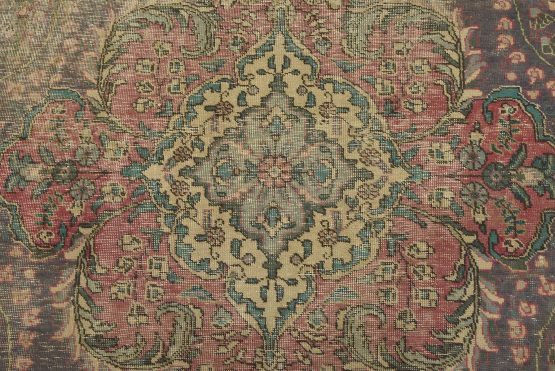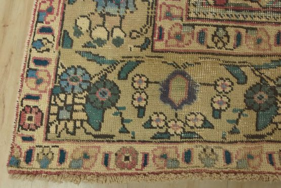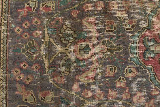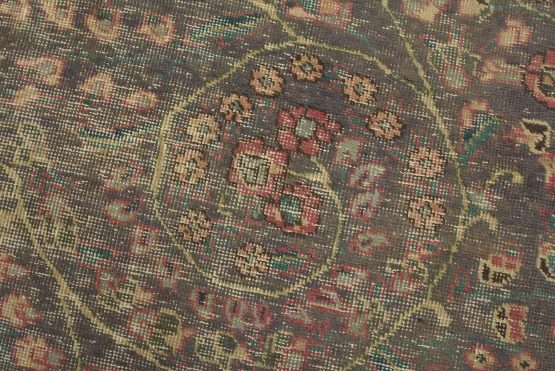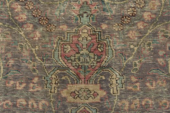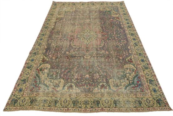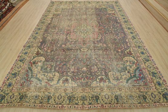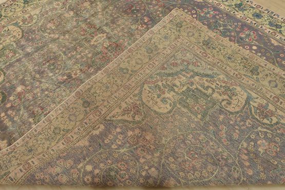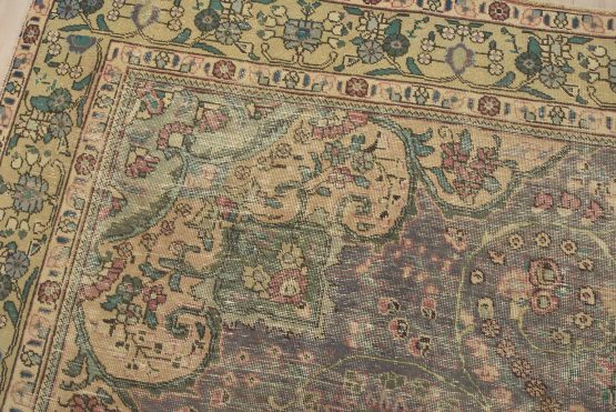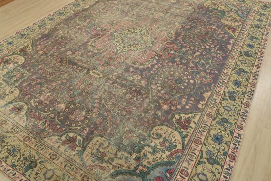 An authentic vintage traditional Tabriz rug hand-knotted with fine wool and natural dyes. This oriental rug features a central medallion surrounded by a botanical design set against a violet background. It has a low wool pile, is worn and distressed, and has minor imperfections (see photos). However, it is in very good condition.