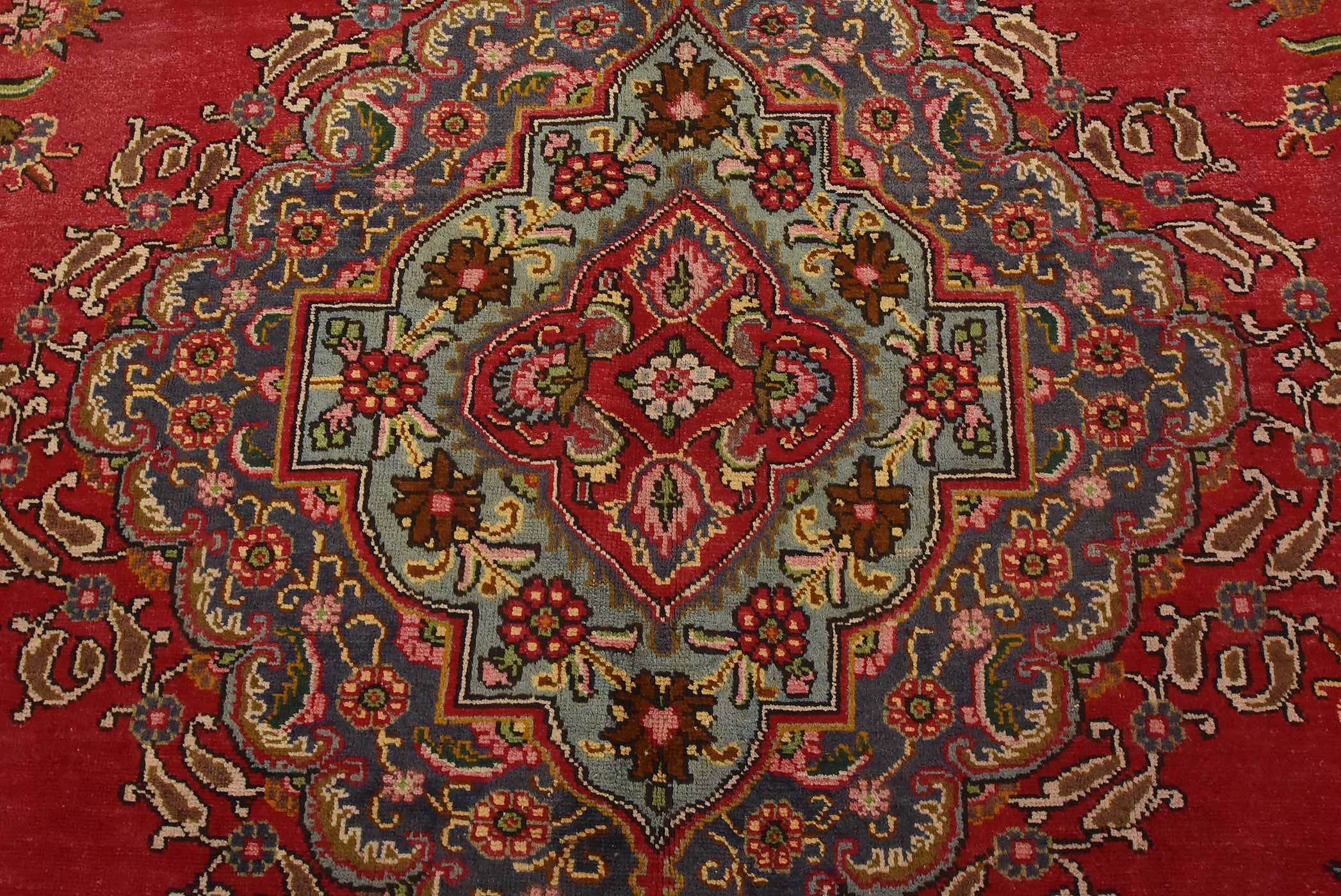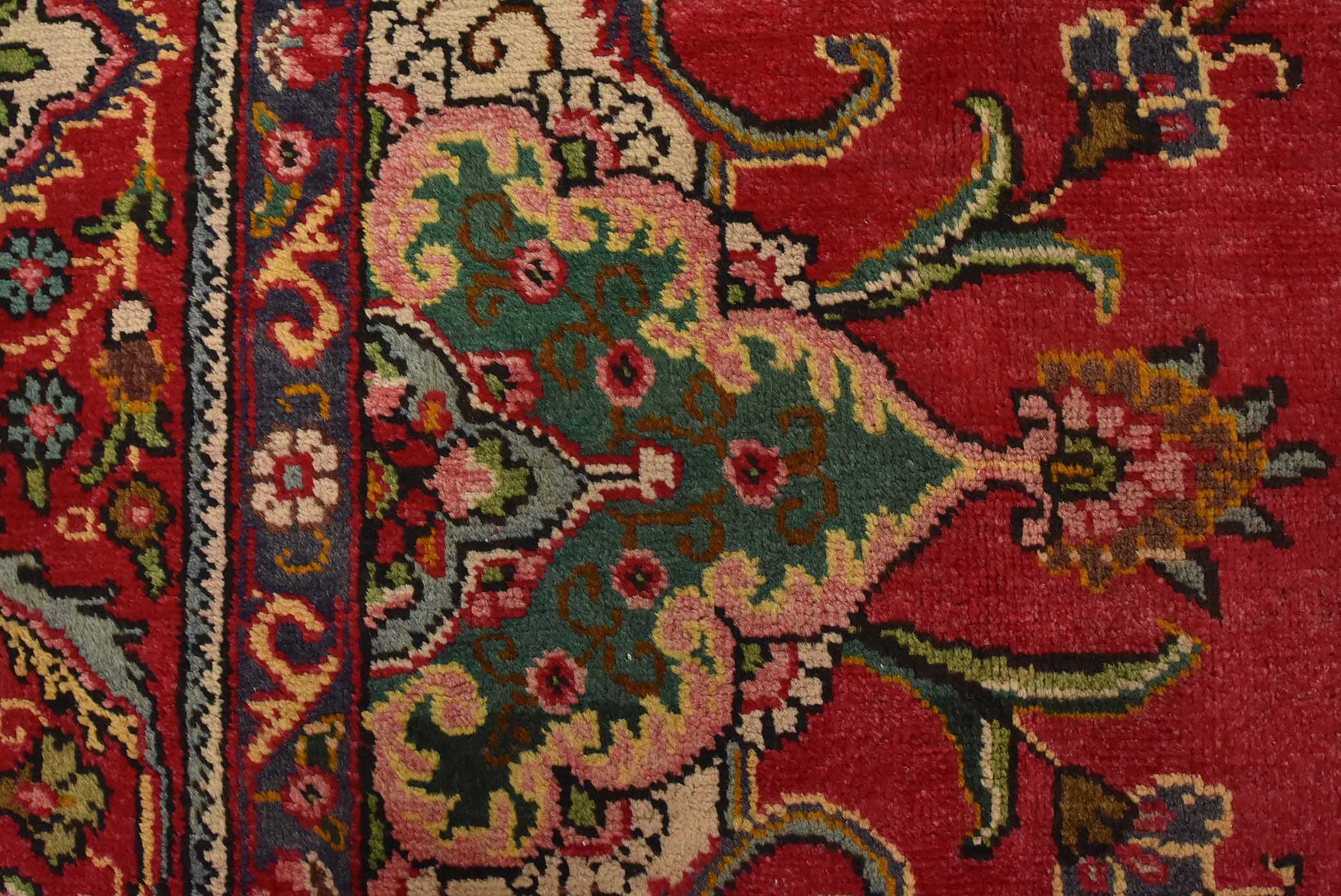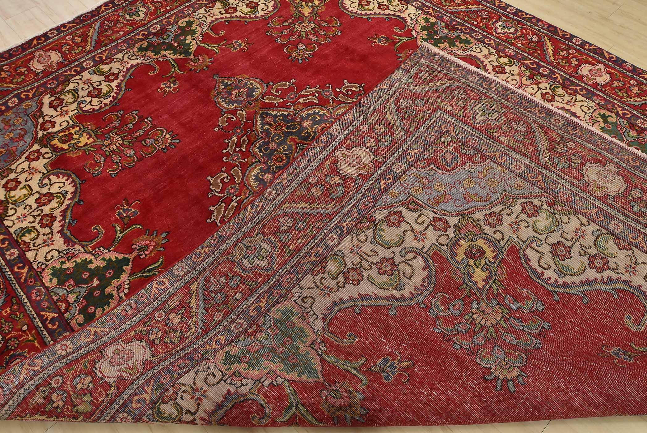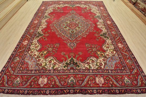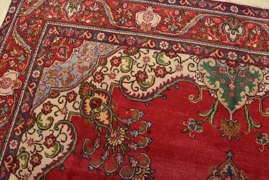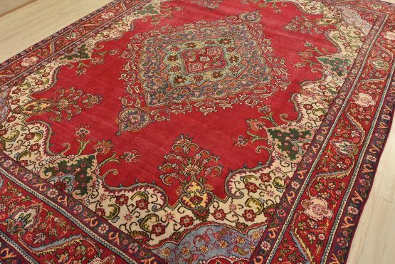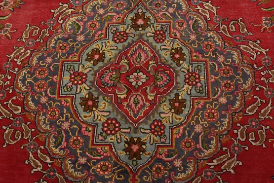 An authentic vintage traditional Tabriz rug hand-knotted with fine wool and natural dyes. This oriental rug features a central medallion surrounded by floral motifs set againts a red background. The wool pile shows some minor wear; please refer to the photos. Otherwise, the rug is in very good condition.