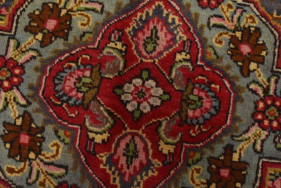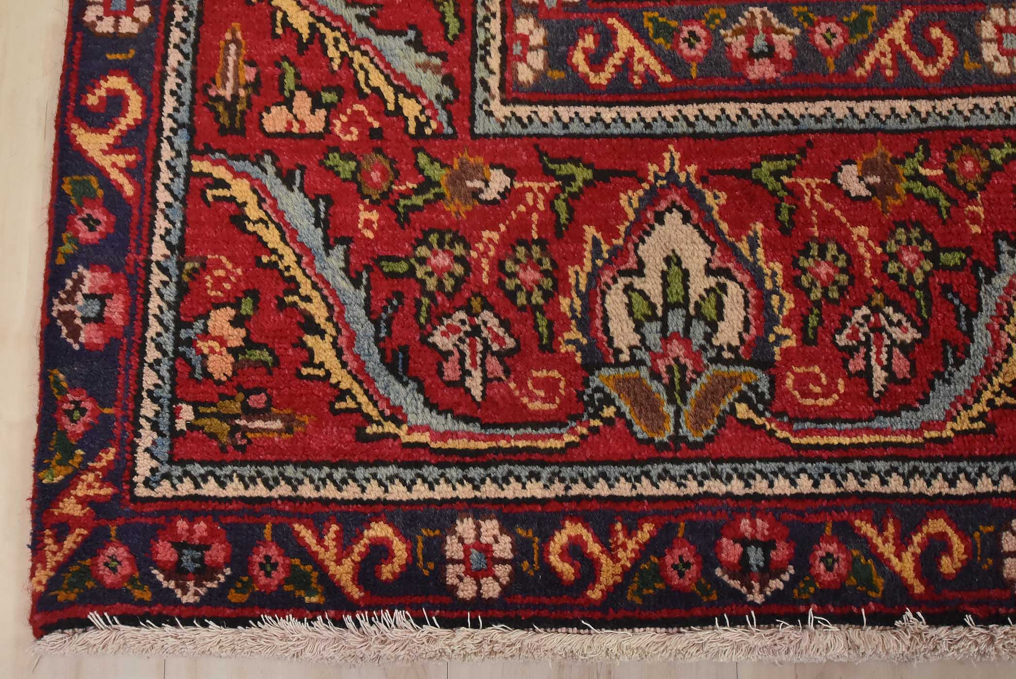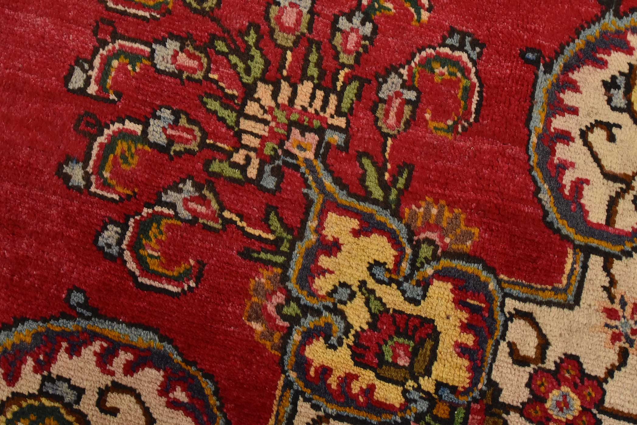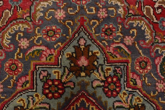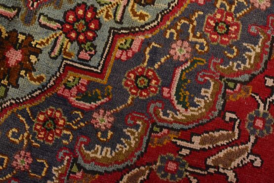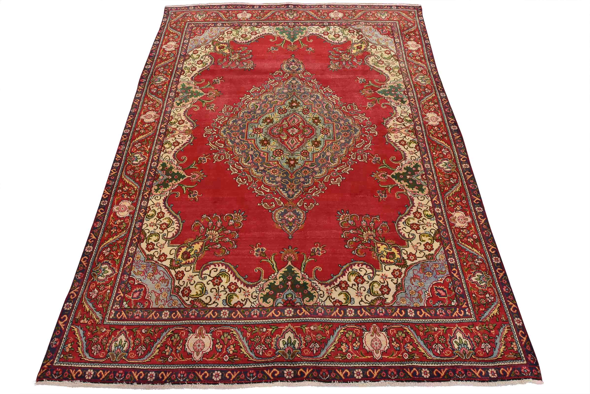 An authentic vintage traditional Tabriz rug hand-knotted with fine wool and natural dyes. This oriental rug features a central medallion surrounded by floral motifs set againts a red background. The wool pile shows some minor wear; please refer to the photos. Otherwise, the rug is in very good condition.