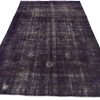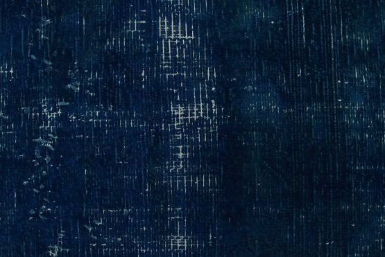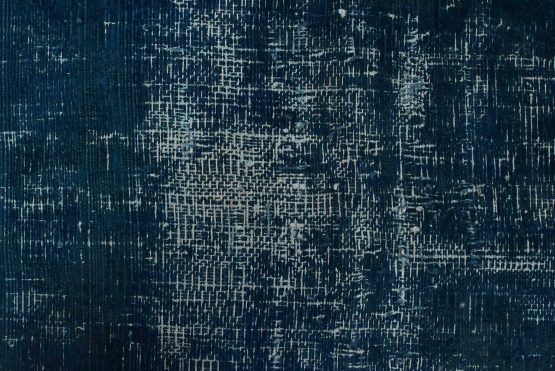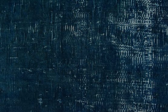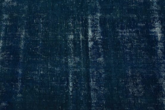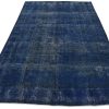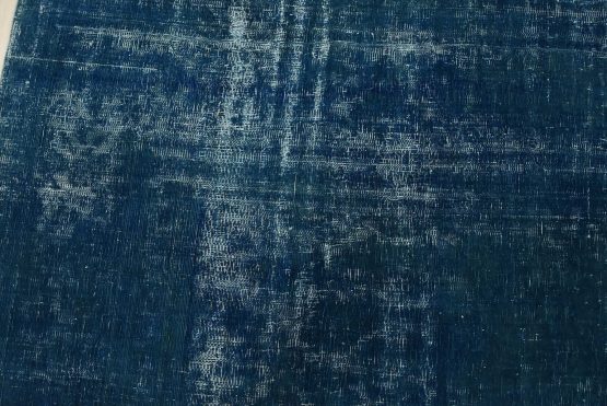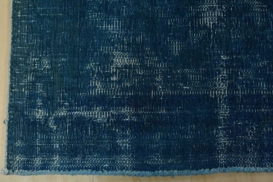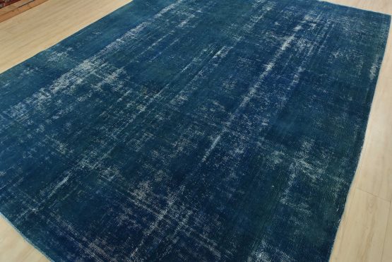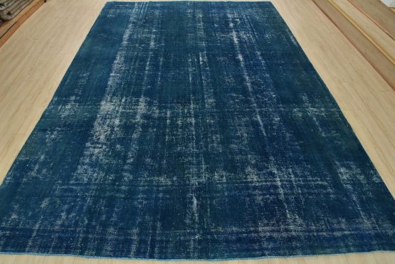 An authentic vintage Overdyed Tabriz rug hand-knotted with an all-wool pile on a cotton foundation. This oriental rug features a muted border with a distressed blue background. It has a low wool pile, is worn and distressed, with threadbare areas and minor imperfections (see photos). However, it is in very good condition.