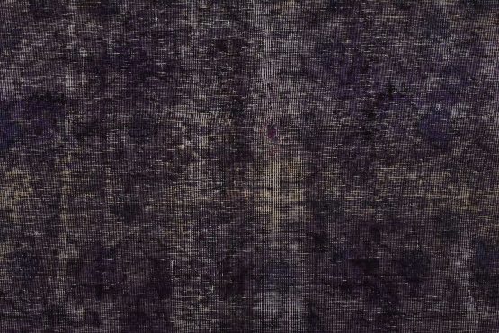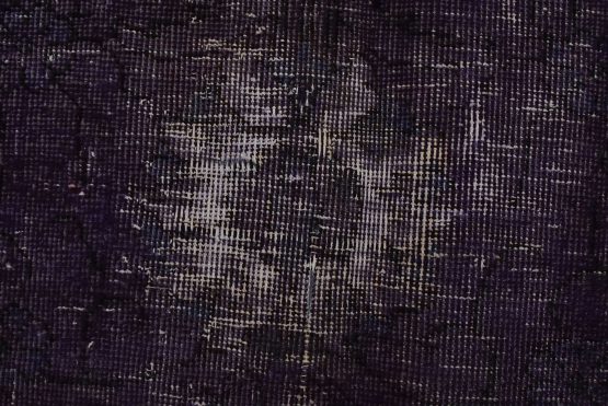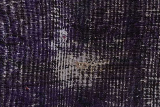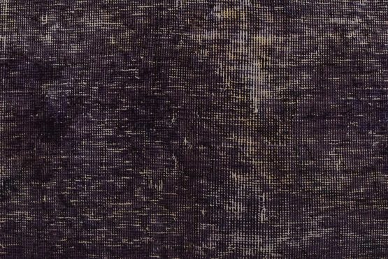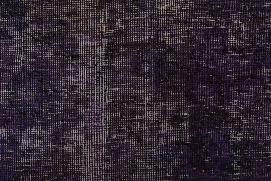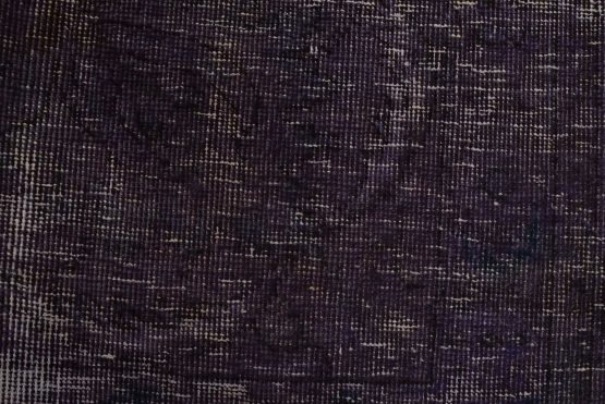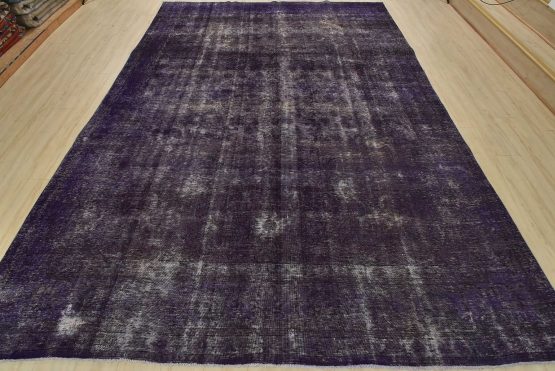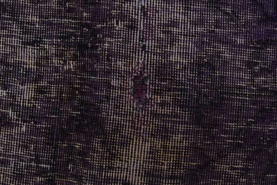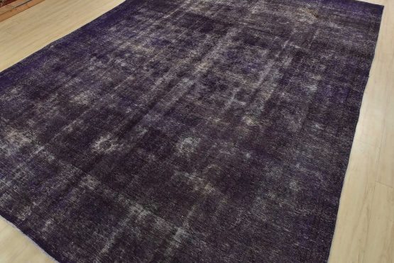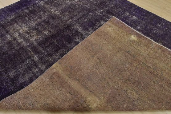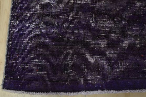 An authentic traditional semi-antique Overdyed Tabriz rug hand-knotted with an all-wool pile on a cotton foundation. This oriental rug features a muted floral design set against a purple background. It has a low wool pile, is worn and distressed, and has minor imperfections (see photos). However, it is in very good condition.