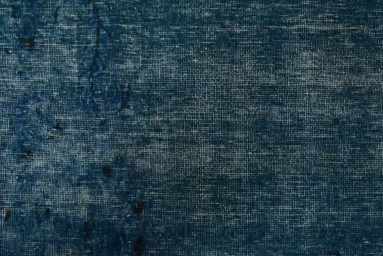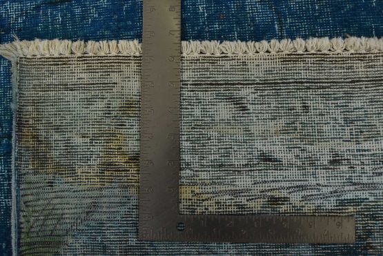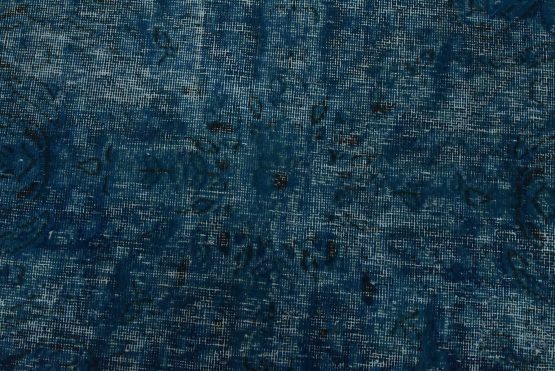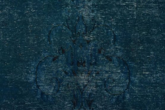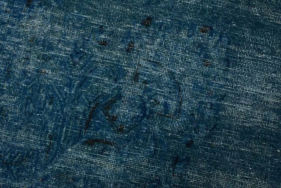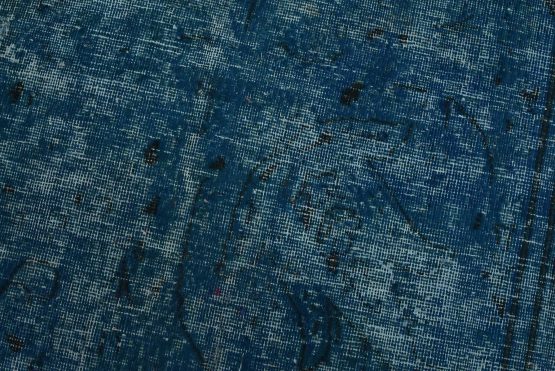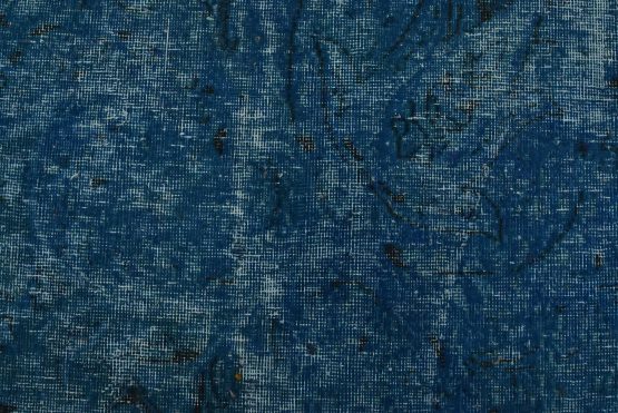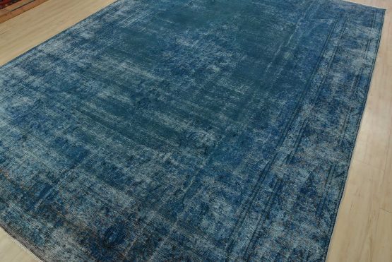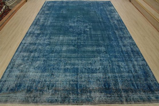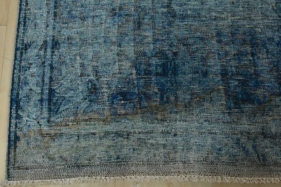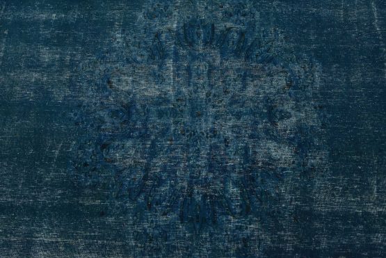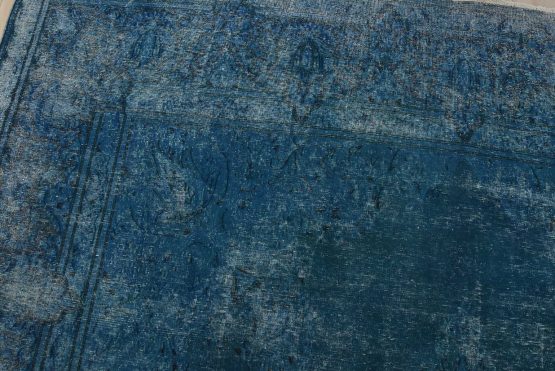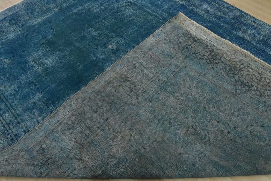 An authentic vintage traditional Overdyed Tabriz rug hand-knotted with an all-wool pile on a cotton foundation. This oriental rug features a muted central medallion set against a blue background. It has a low wool pile, is worn and distressed, and has minor imperfections (see photos). However, it is in very good condition.