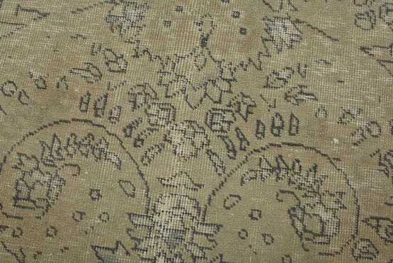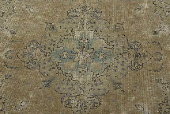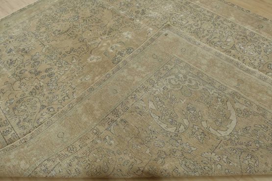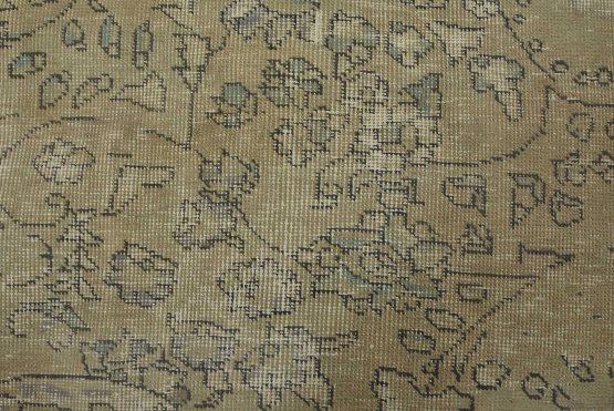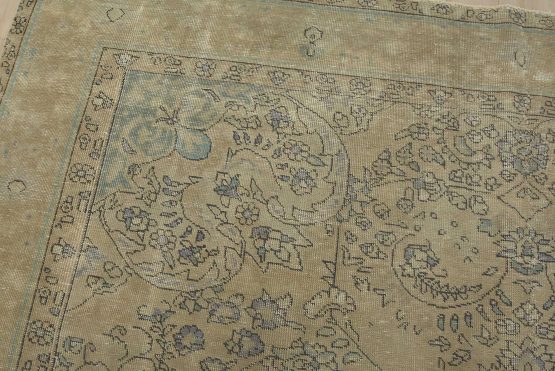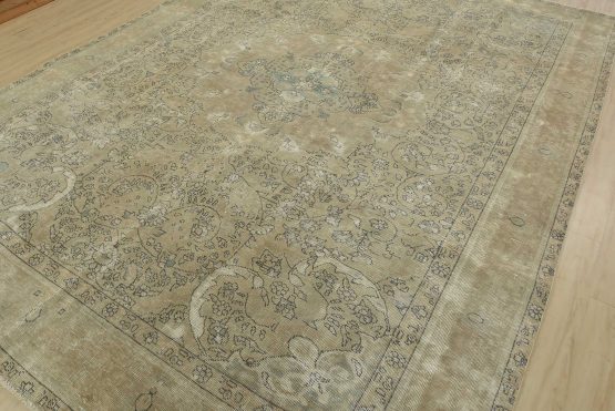 An authentic vintage traditional Tabriz rug hand-knotted with an all-wool pile on a cotton foundation. This oriental rug features a muted central medallion surrounded by a muted botanical design set against a beige background. It has a low wool pile, is worn and distressed, and has minor imperfections (see photos). However, it is in very good condition.