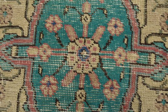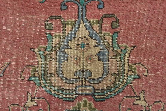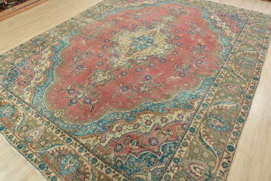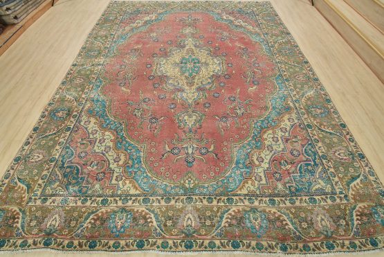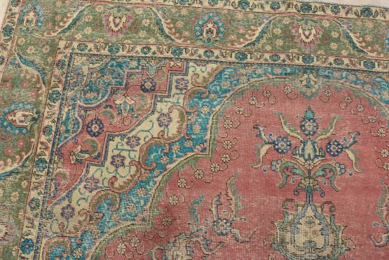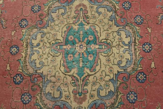 An authentic vintage traditional Tabriz rug hand-knotted with fine wool and natural dyes. This oriental rug features a central medallion surrounded by floral motifs set against a pink background. It has a low wool pile, is worn and distressed, and has minor imperfections (see photos). However, it is in very good condition.