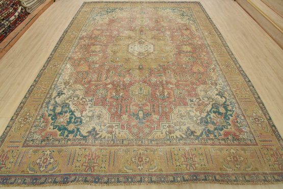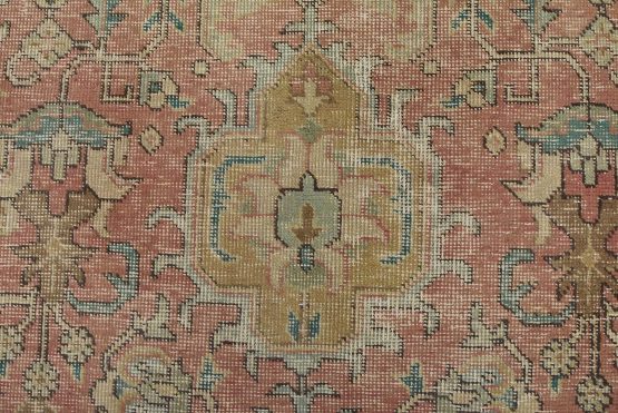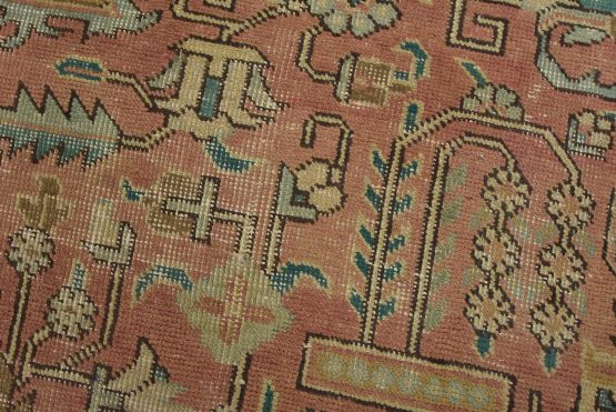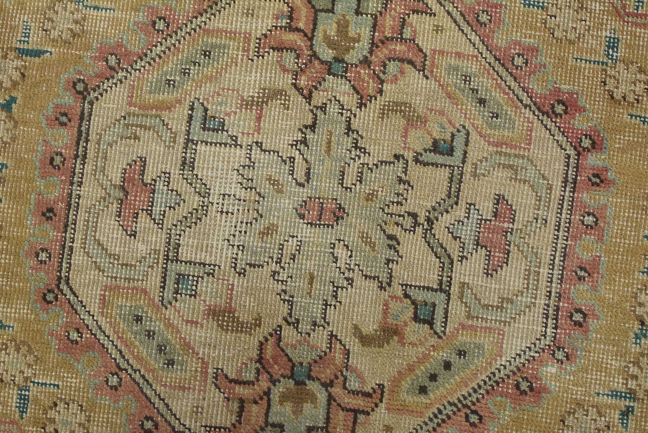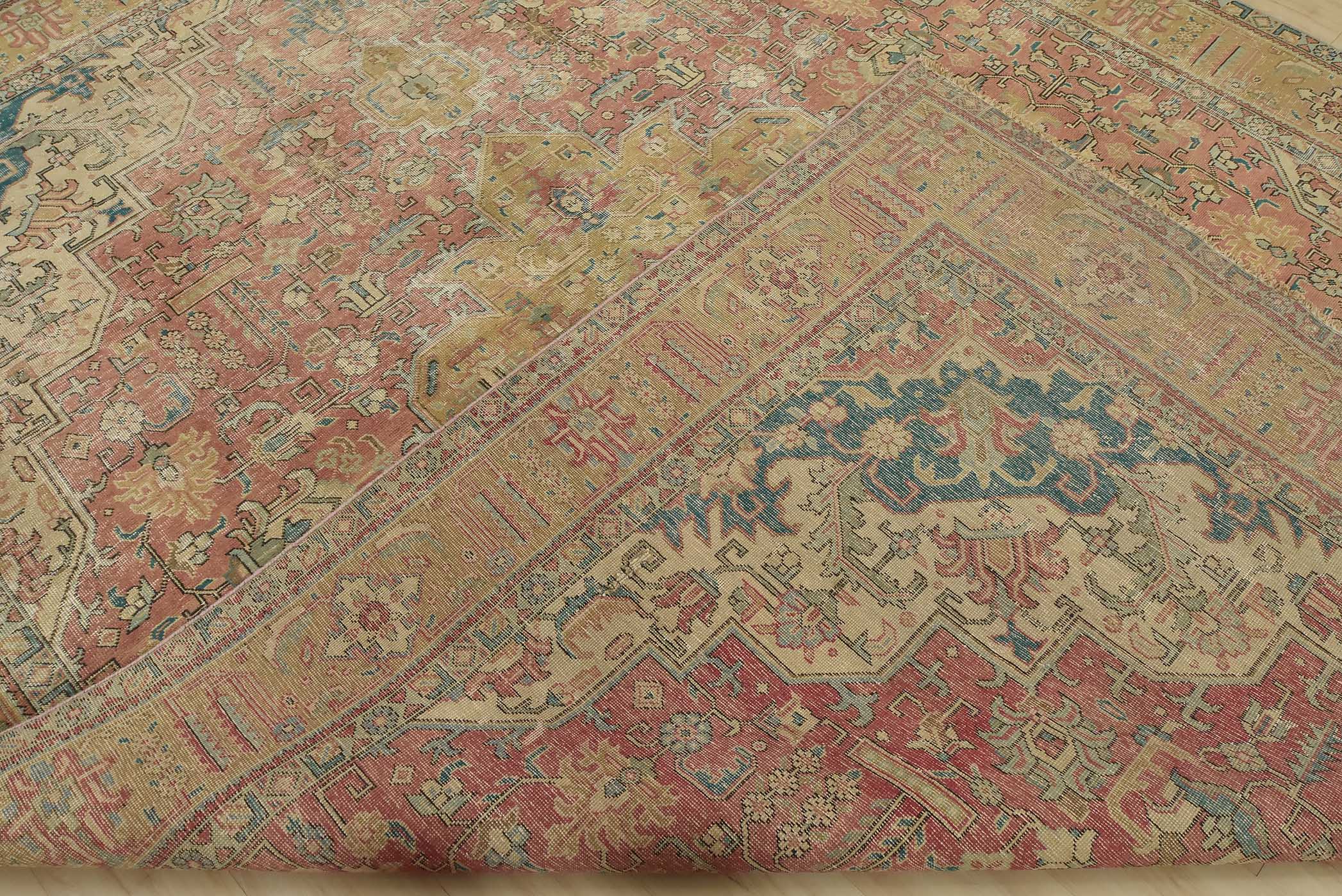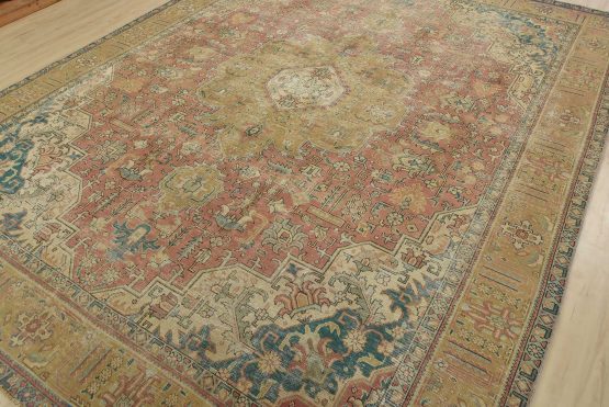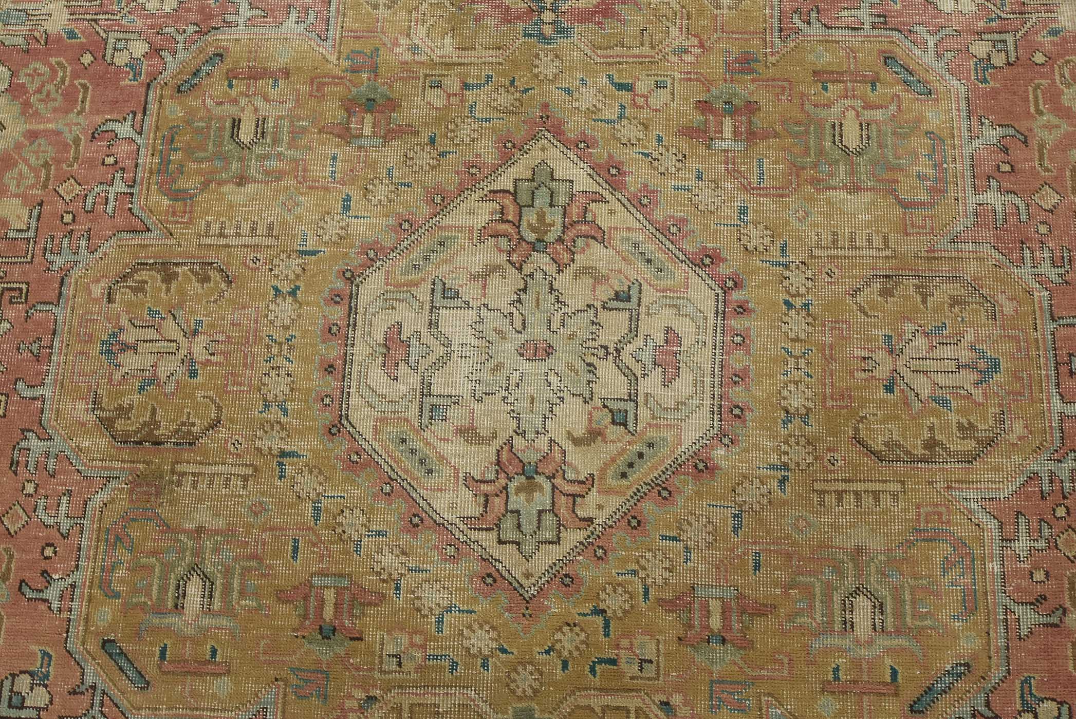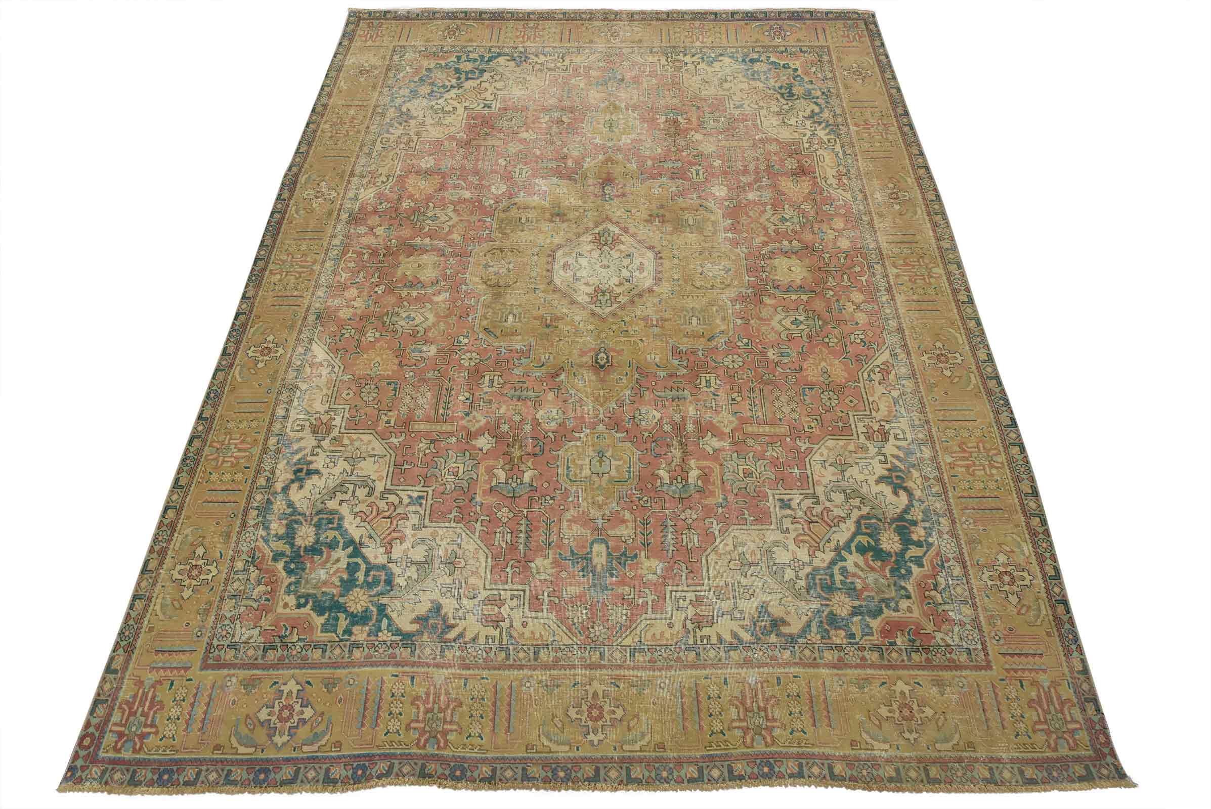 An authentic vintage traditional Tabriz rug hand-knotted with fine wool and natural dyes. This oriental rug features a central medallion surrounded by a botanical design with flowers set against a pink background. It has a low wool pile, is worn and distressed, and has minor imperfections (see photos). However, it is in very good condition.