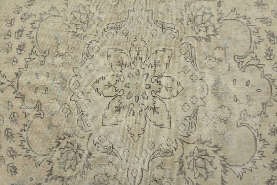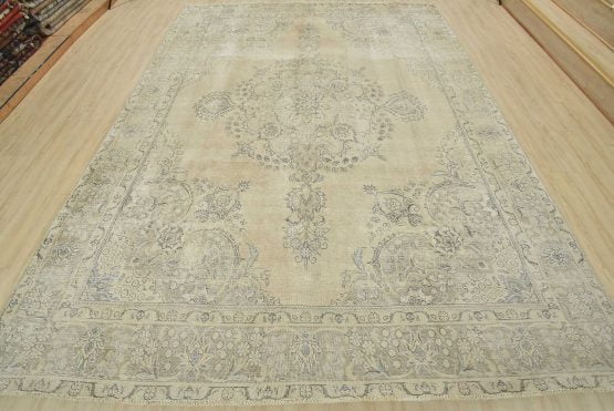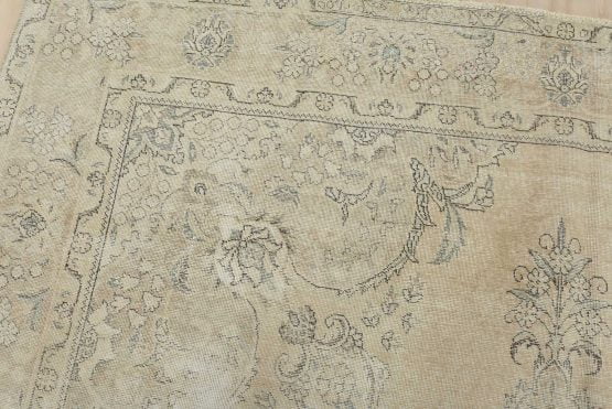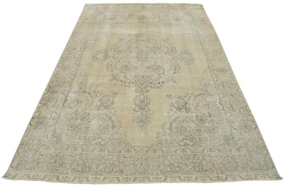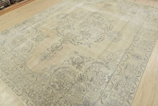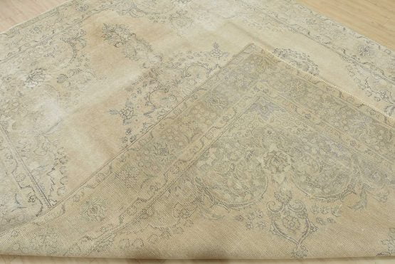 An authentic vintage traditional Tabriz rug hand-knotted with an all-wool pile on a cotton foundation. This oriental rug features a central floral medallion set against a beige background. It has a low wool pile, is worn and distressed, and has minor imperfections (see photos). However, it is in very good condition.