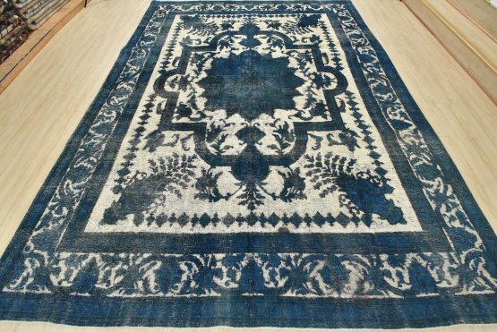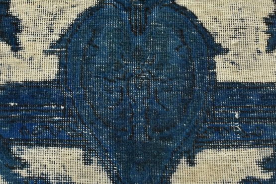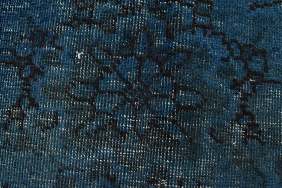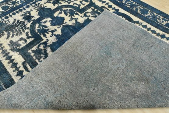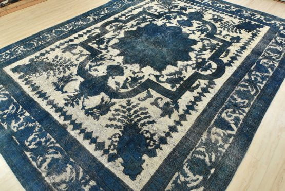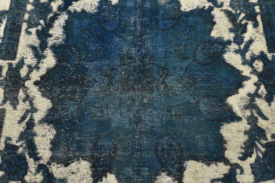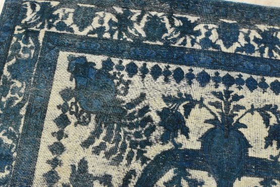 An authentic vintage traditional Overdyed Tabriz rug hand-knotted with an all-wool pile on a cotton foundation. This beautiful Oriental rug features a central medallion surrounded by botanical and floral motifs, accompanied by vases. It has a low wool pile, is worn and distressed, with threadbare areas and minor imperfections (see photos). However, it is in very good condition.