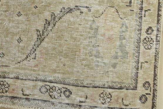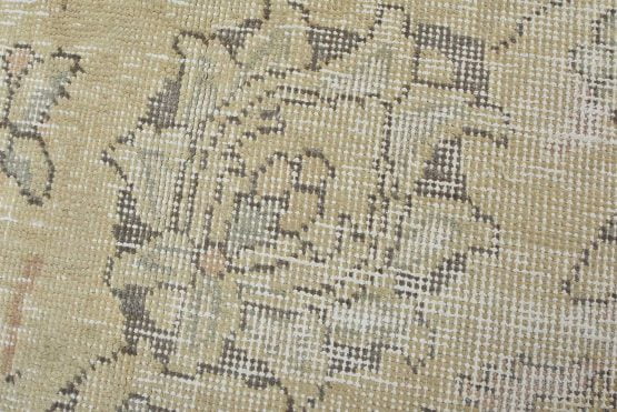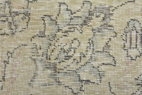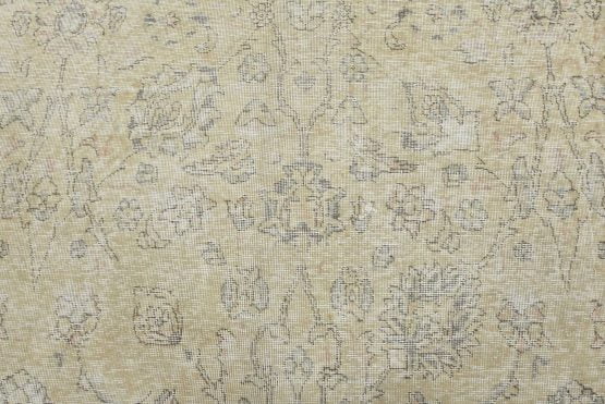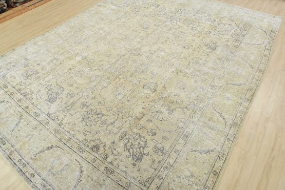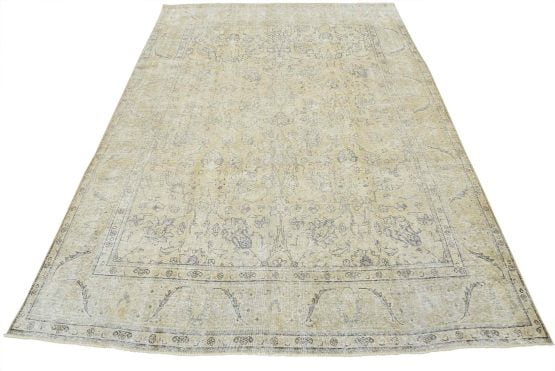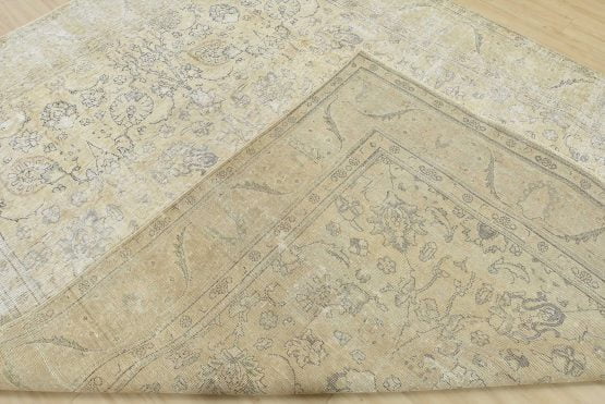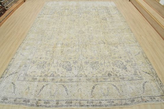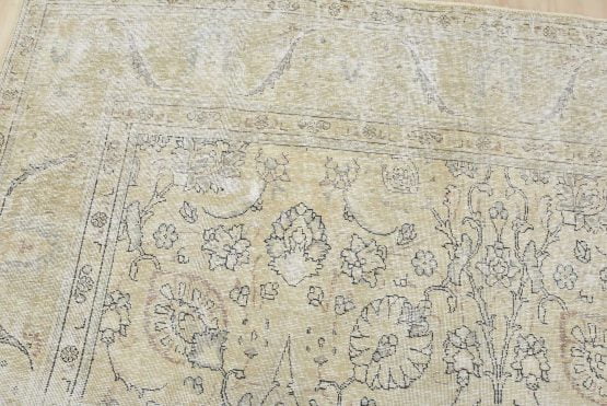 An authentic vintage traditional Tabriz rug hand-knotted with an all-wool pile on a cotton foundation. This oriental rug features a muted all-over floral design set against a beige background. It has a low wool pile, is worn and distressed, and has minor imperfections (see photos). However, it is in very good condition.