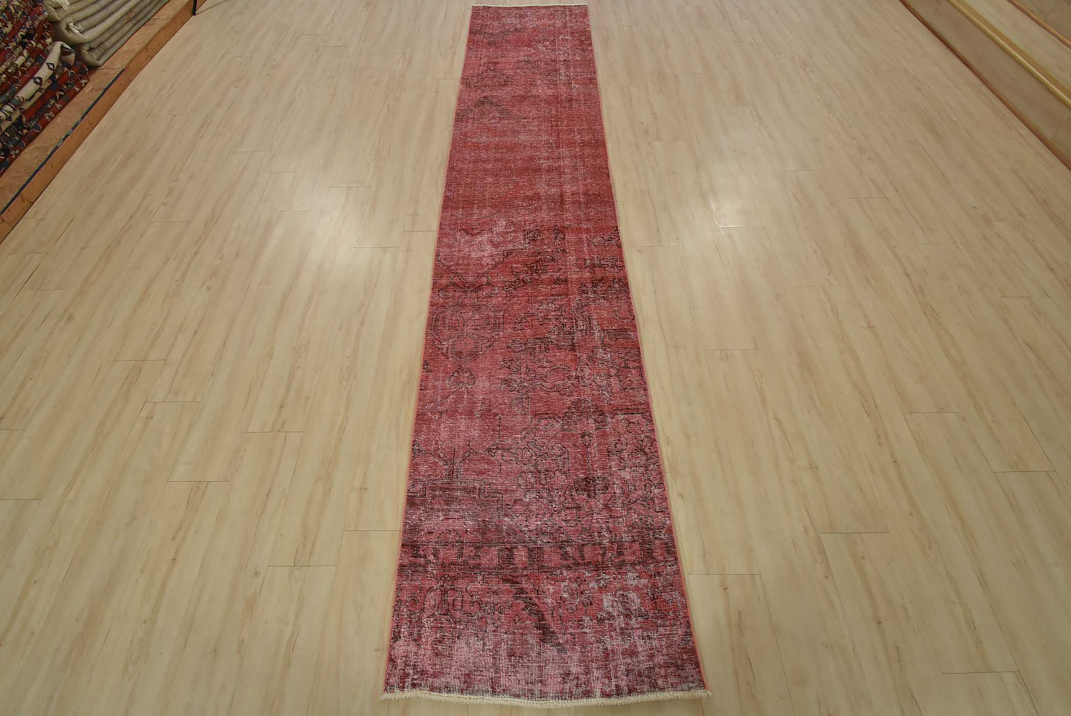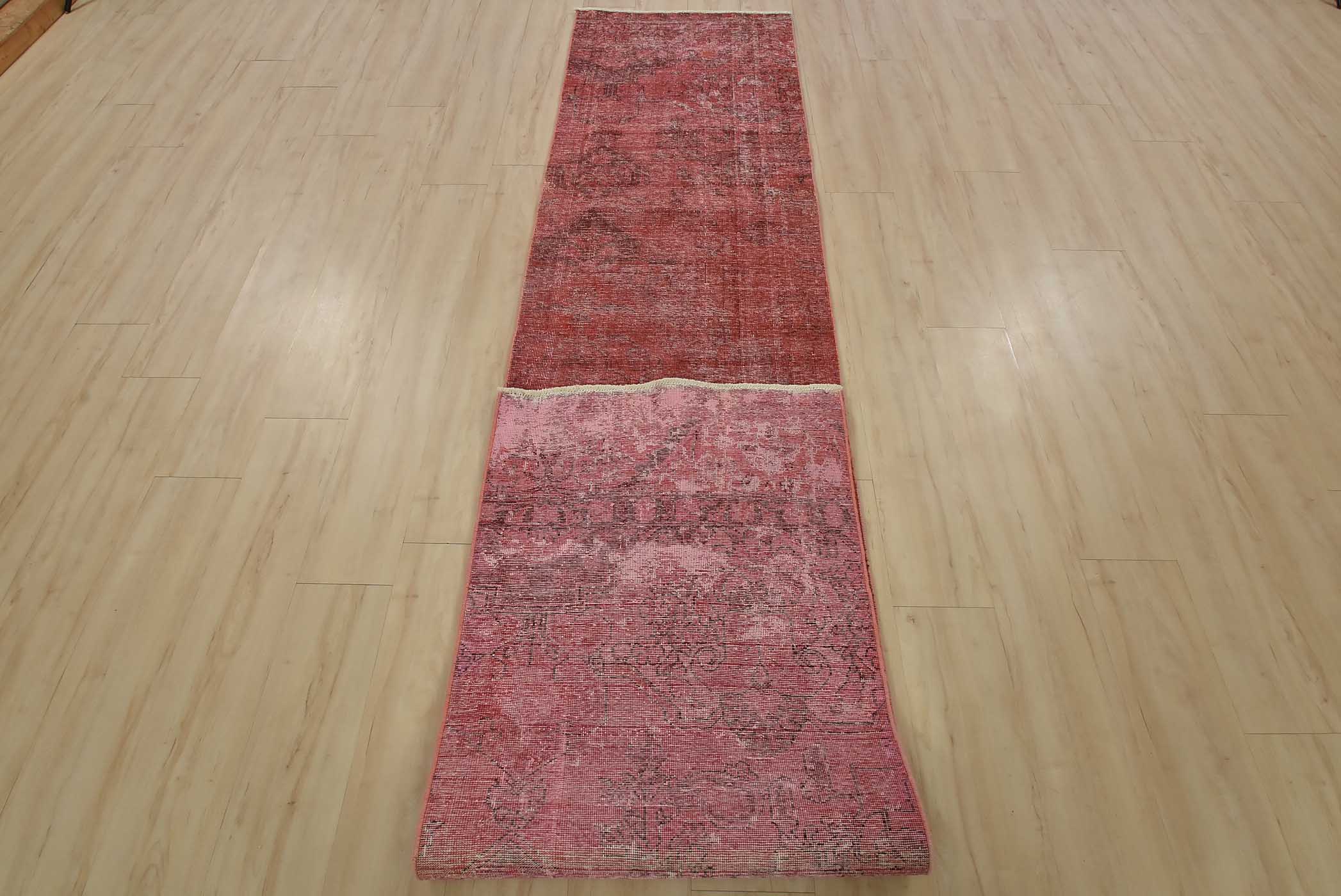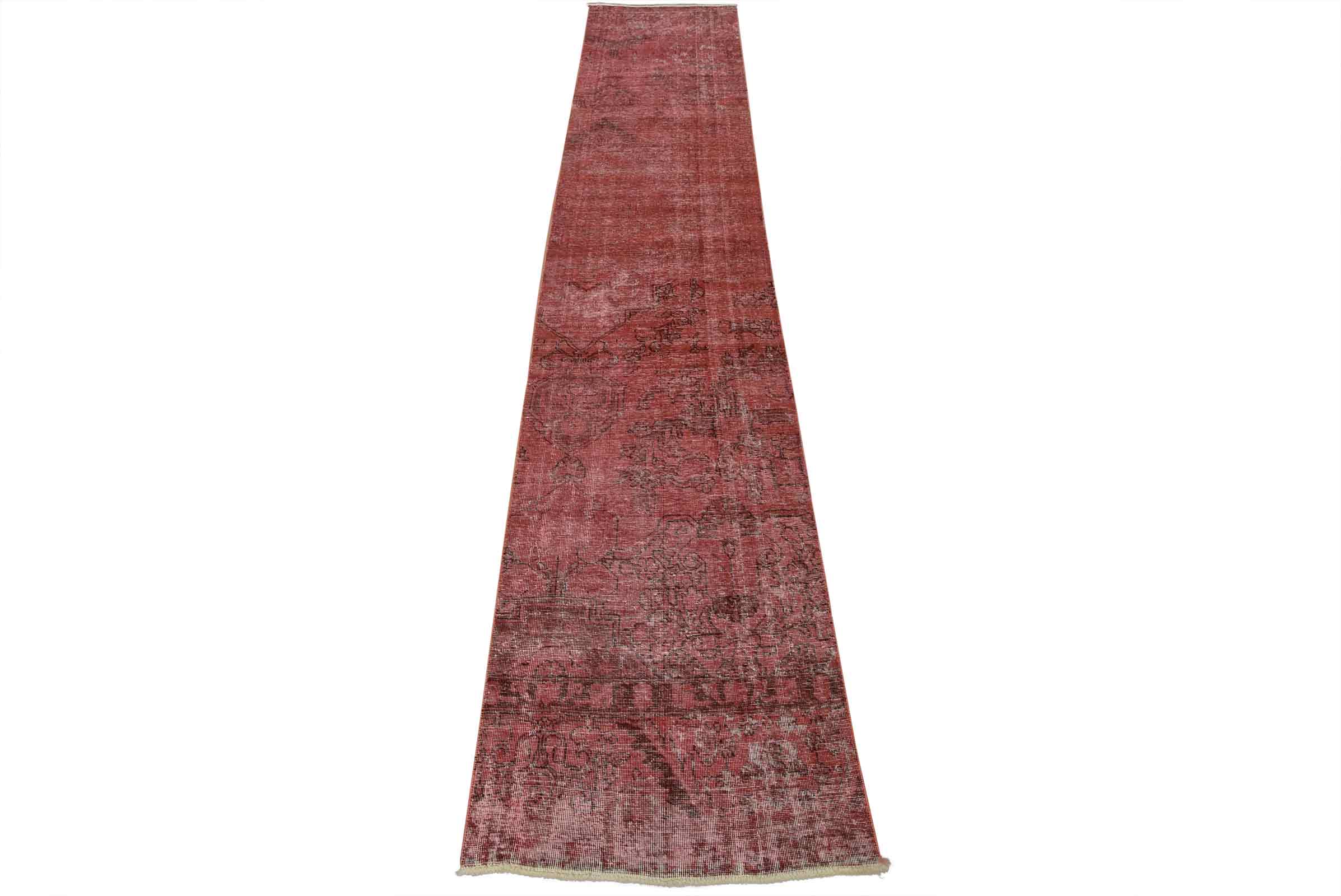 An authentic vintage traditional overdyed Tabriz runner hand-knotted with fine wool and natural dyes. This oriental rug features a botanical design set against a pink background. It has a low wool pile, is worn and distressed, and has minor imperfections (see photos). However, it is in very good condition.