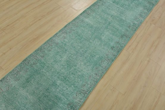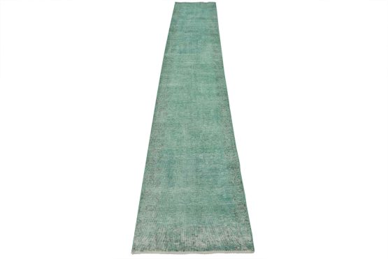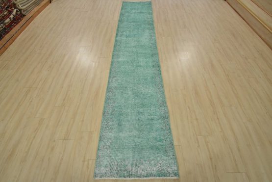 An authentic vintage traditional overdyed Tabriz runner hand-knotted with fine wool and natural dyes. This oriental rug features a blue background. It has a low wool pile, is worn and distressed, and has minor imperfections (see photos). However, it is in very good condition.