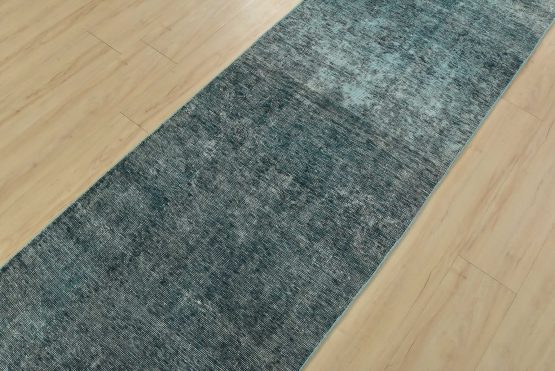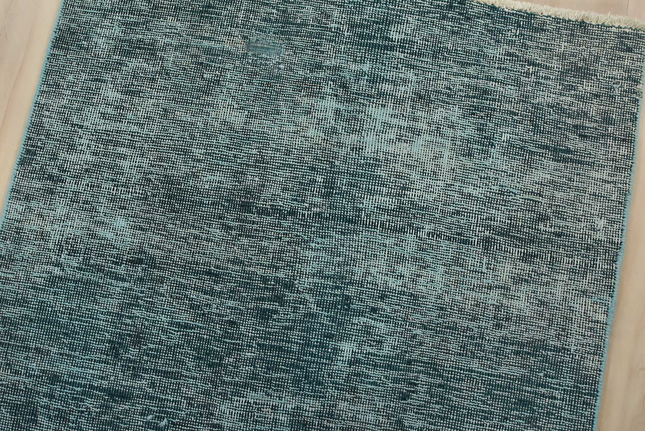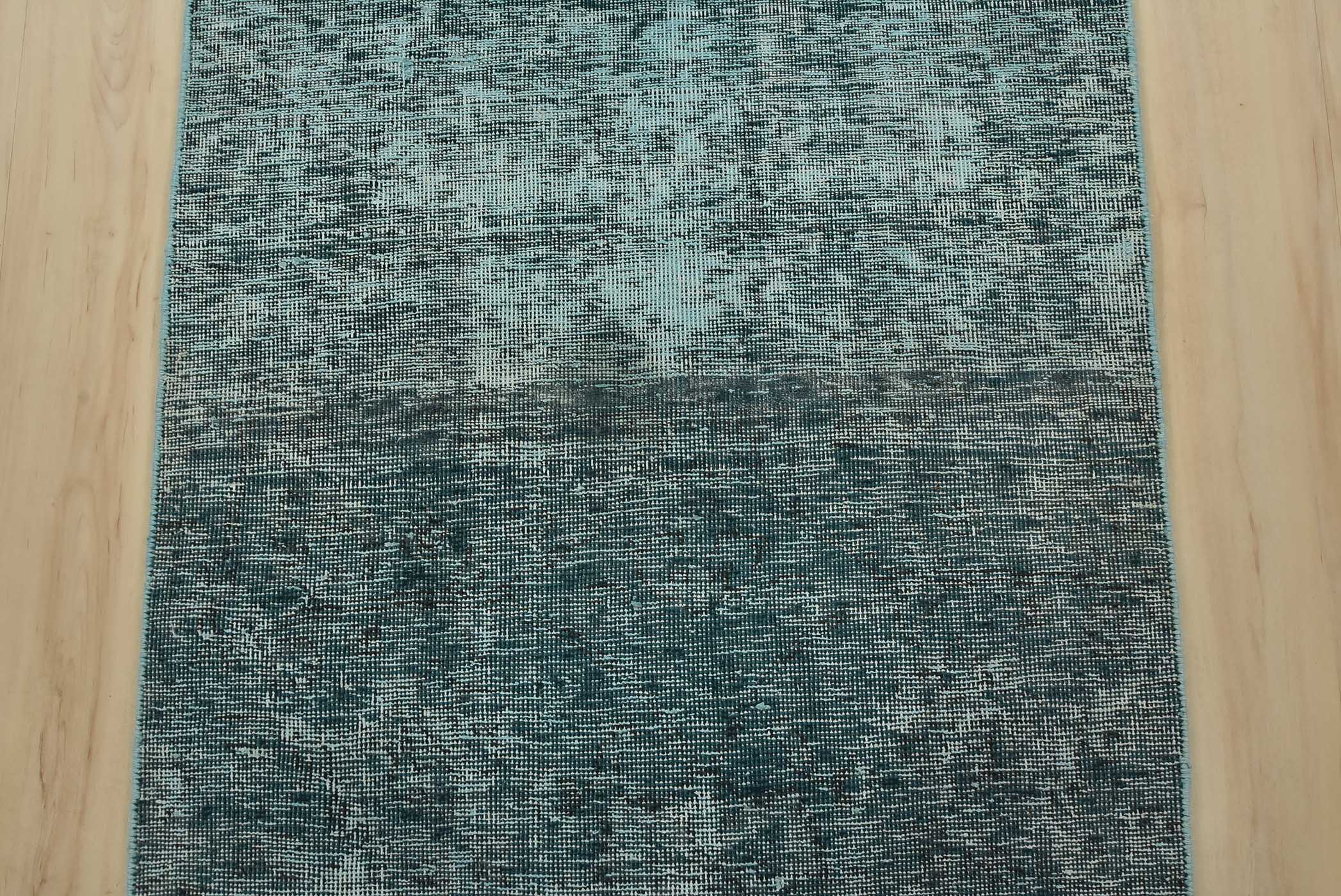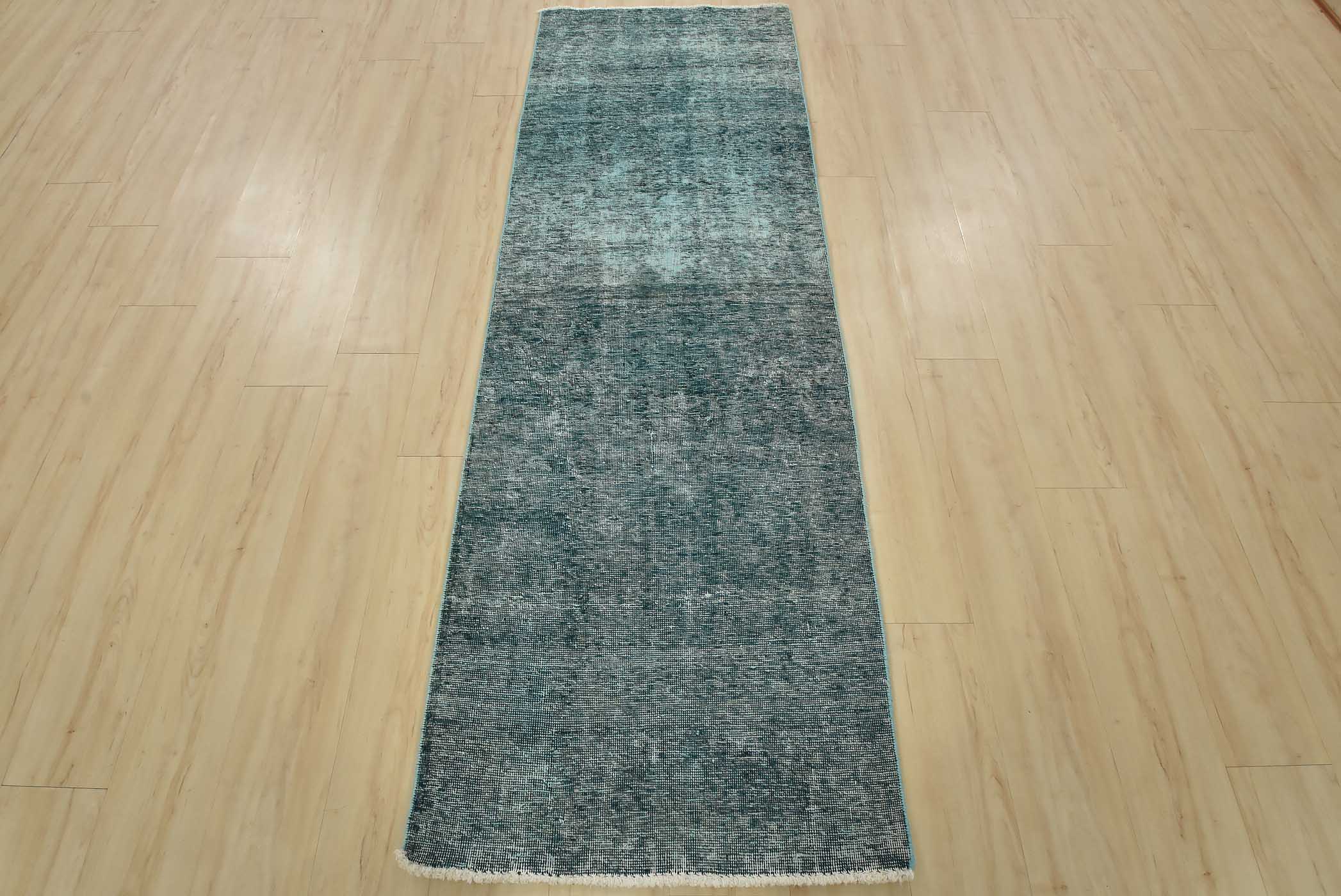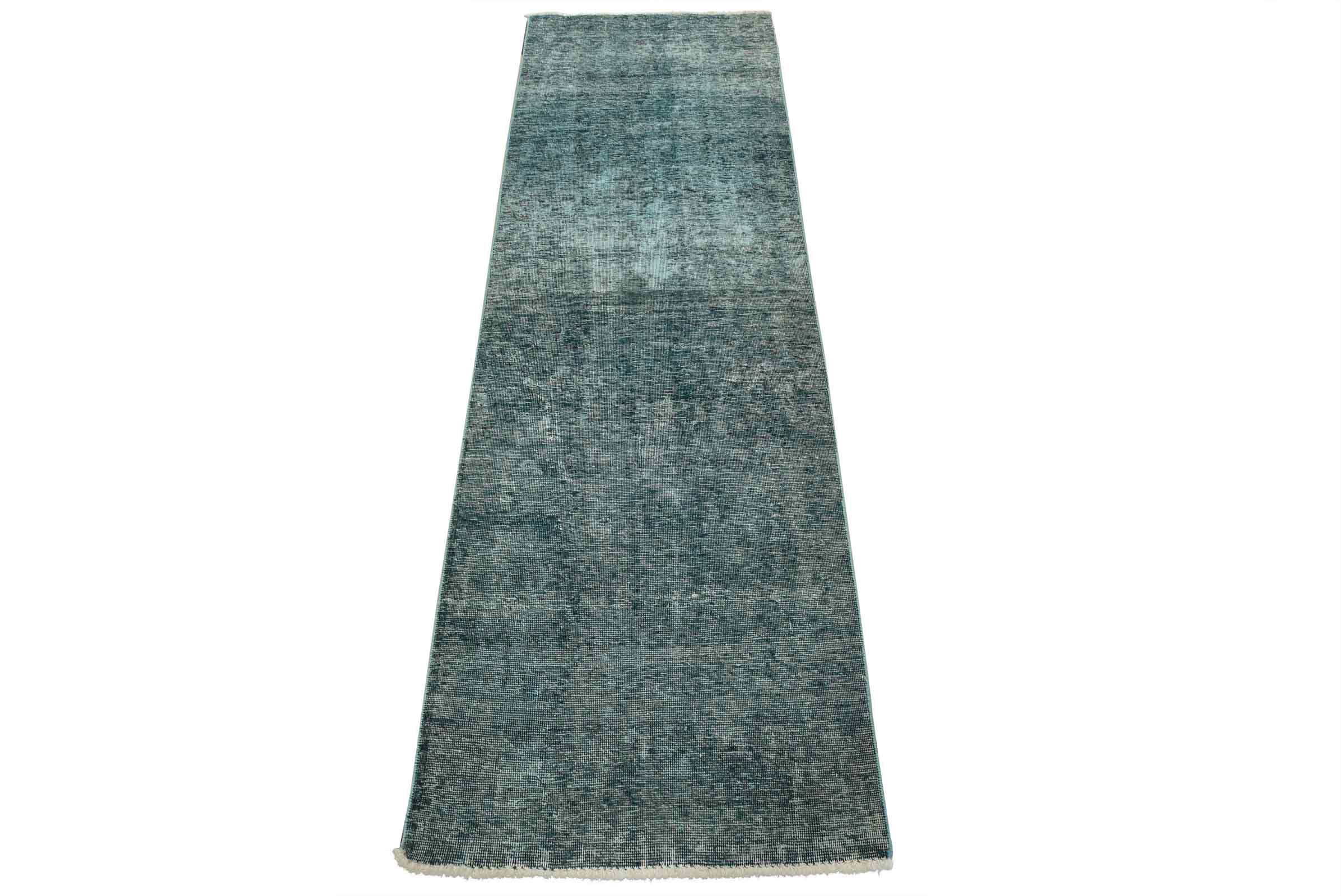 An authentic vintage traditional overdyed Tabriz runner hand-knotted with fine wool and natural dyes. This oriental rug features a blue background. It has a low wool pile, is worn and distressed, and has minor imperfections (see photos). However, it is in very good condition.