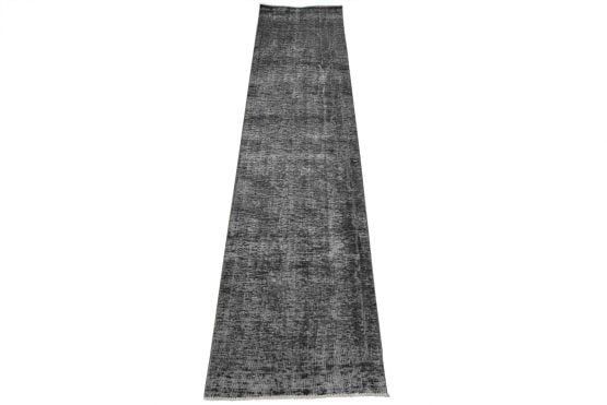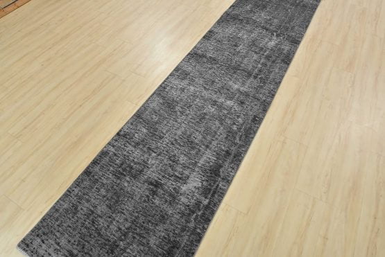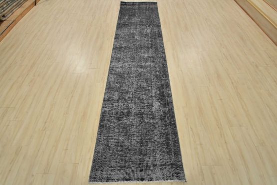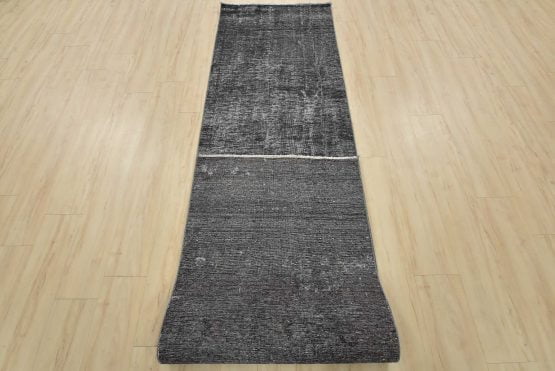 An authentic vintage Overdyed Tabriz runner hand-knotted with an all-wool pile on a cotton foundation. This oriental rug features a plain background with no pattern. It has a low wool pile, is worn and distressed, and has minor imperfections (see photos). However, it is in very good condition.