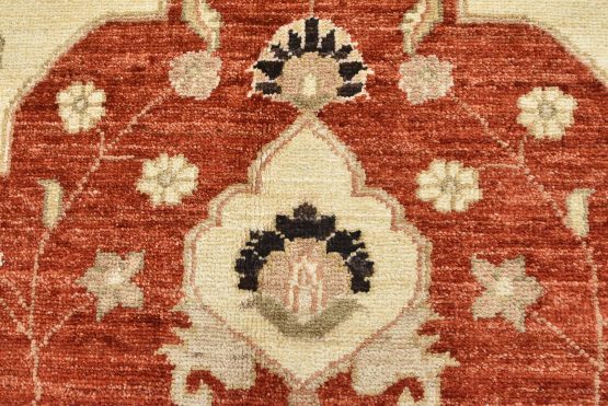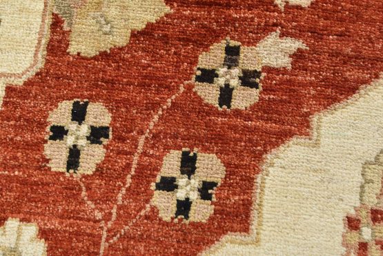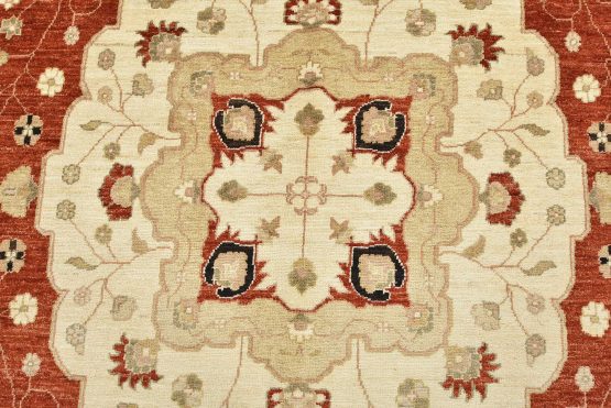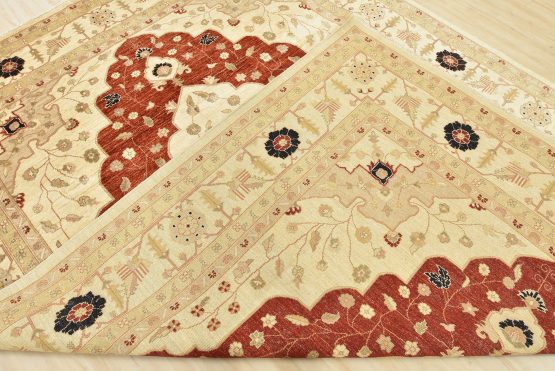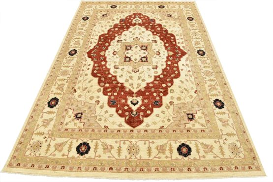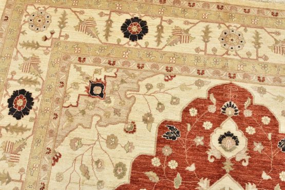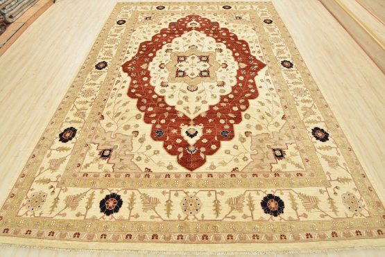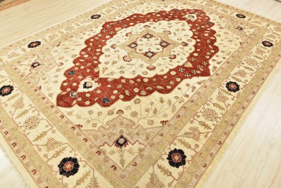 A traditional Tabriz Ziegler rug hand-knotted with an all-wool pile on a cotton foundation. This oriental rug features a large central medallion surrounded by a floral design set against a red background. It is new and in excellent condition.