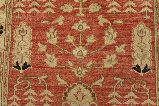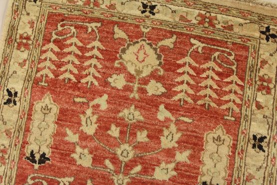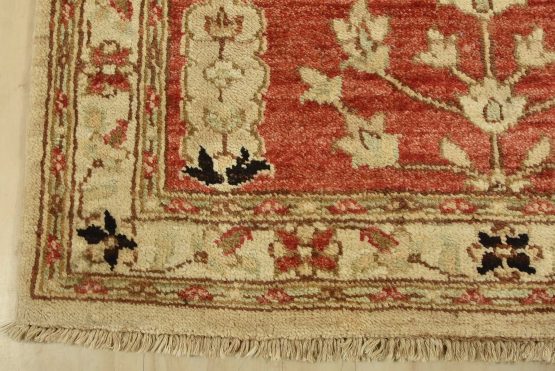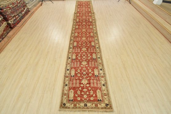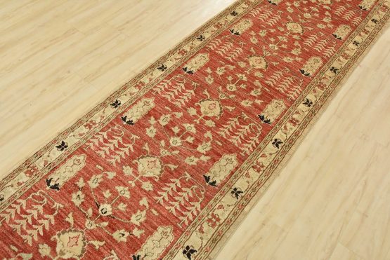 A traditional Tabriz Ziegler runner hand-knotted with an all-wool pile on a cotton foundation. This oriental rug features a botanical pattern set against a red background. It is new and in excellent condition.