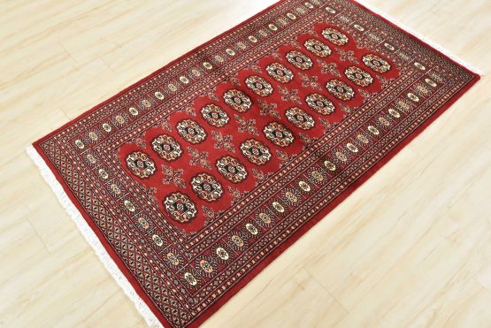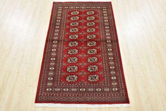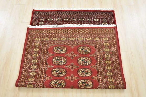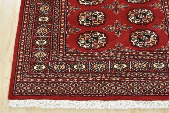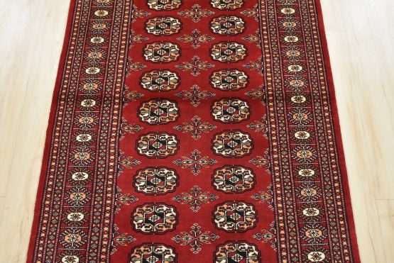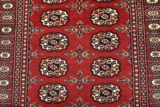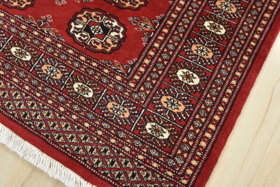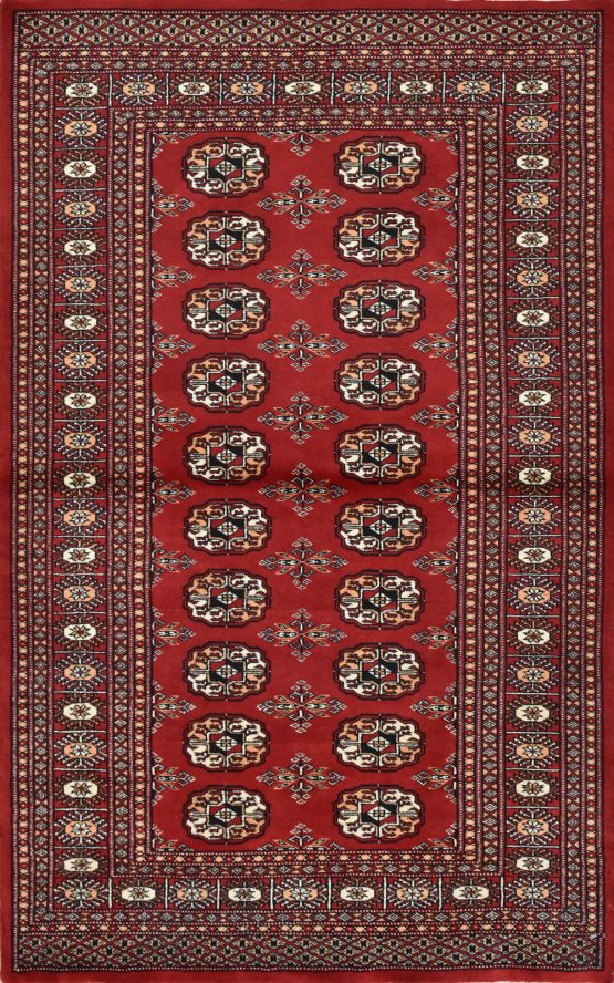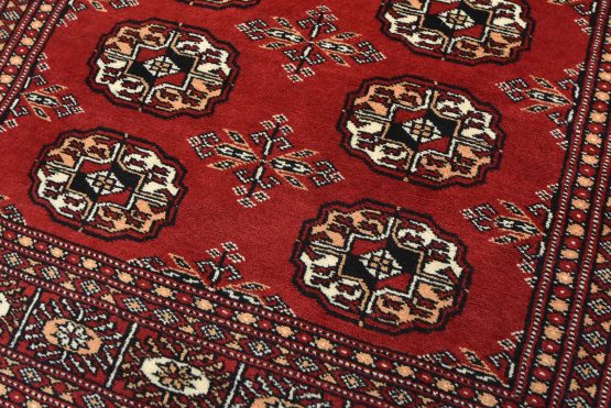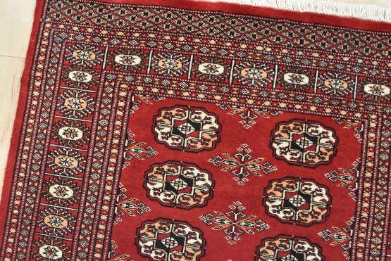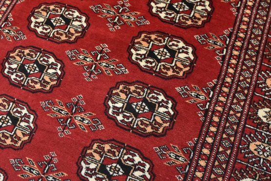 Bokhara rugs have small, repeating geometric designs woven with fine wool. The most common Bokhara design consists of rows of “Tekke” guls or medallions (the Tekkes were one of the Turkmen tribes). Bokhara rugs are made in Pakistan, Turkey, Uzbekistan, and Afghanistan.