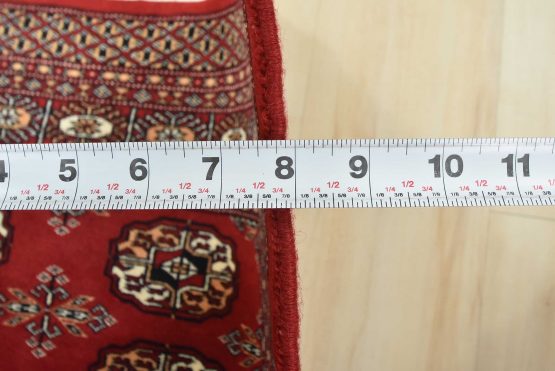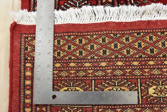A tribal Bokhara rug hand-knotted with an all-wool pile on a cotton foundation. This finely woven oriental rug features rows of repeating small medallions set against a red background. It is new and in excellent condition.