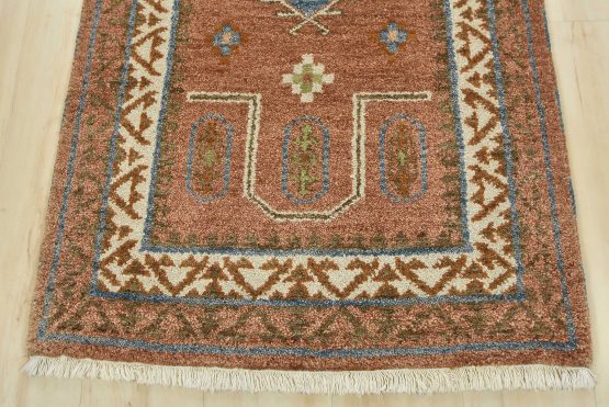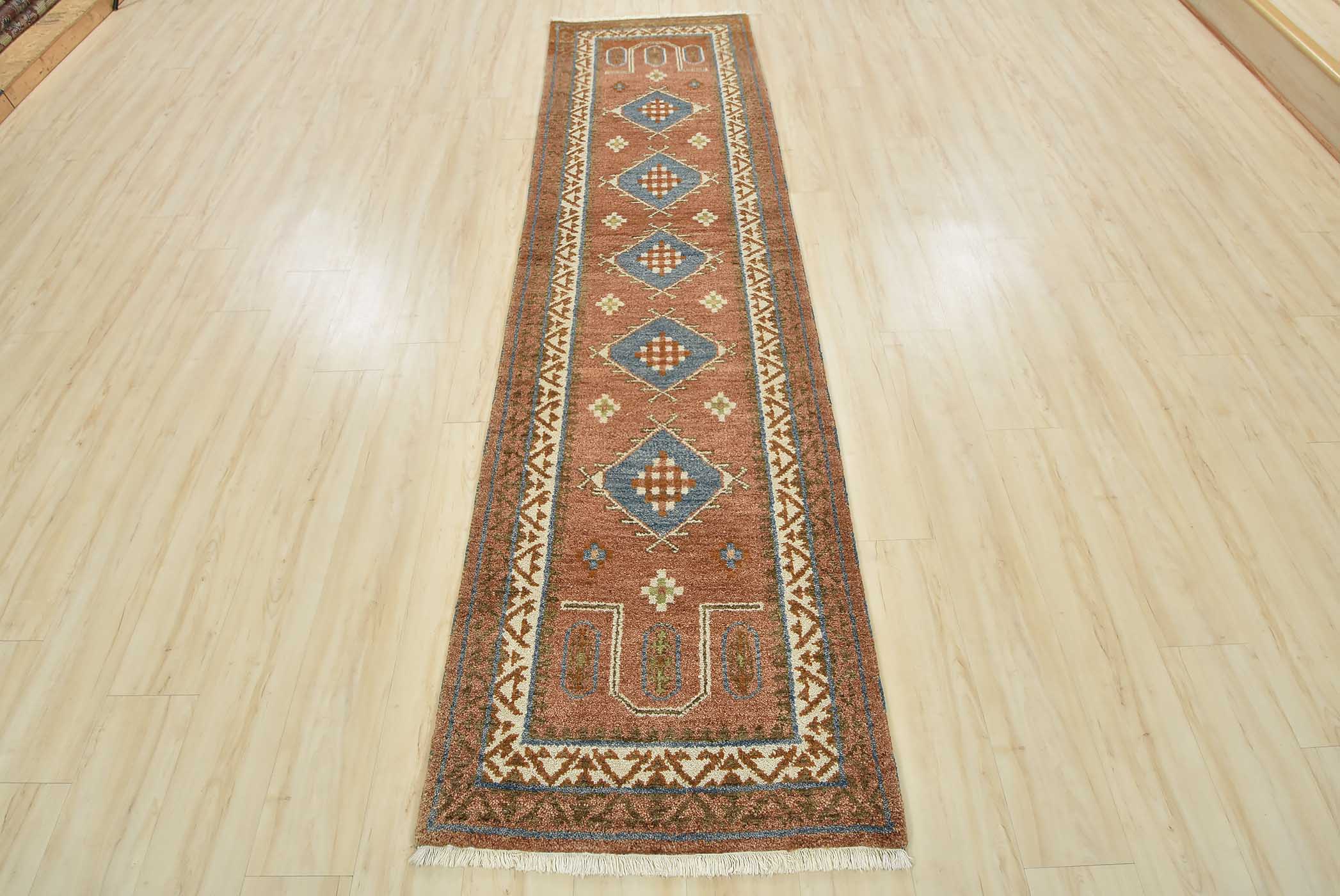 A tribal Caucasian Kazak runner hand-knotted with an all-wool pile on a cotton foundation. This oriental rug features diamond-shaped medallions surrounded by geometric motifs set against a brown background. It is new and in excellent condition.
