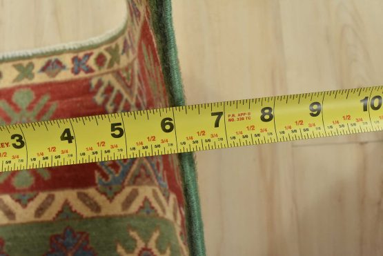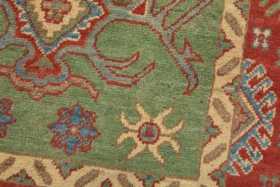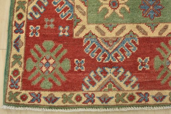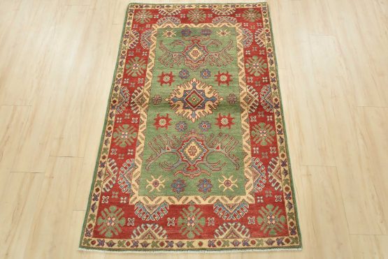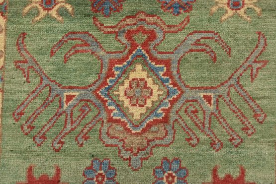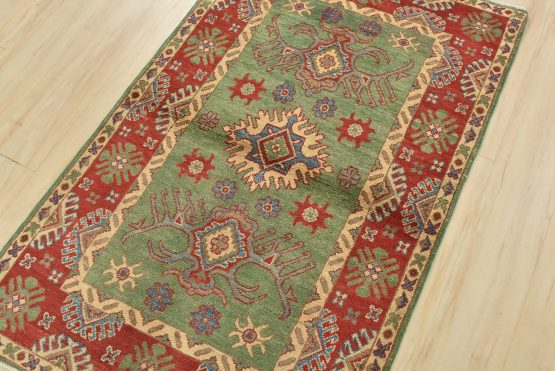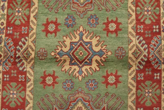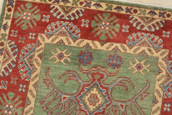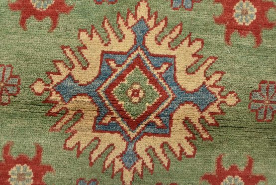 A tribal Caucasian Kazak rug hand-knotted with an all-wool pile on a cotton foundation. This oriental rug features geometric medallions surrounded by geometric motifs set against a green background. It is new and in excellent condition.