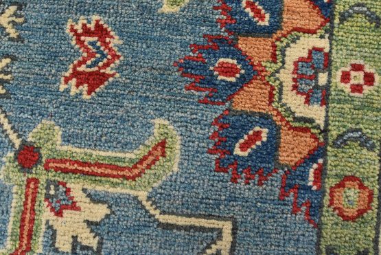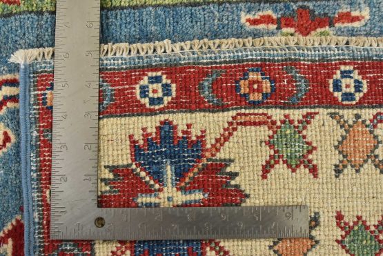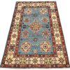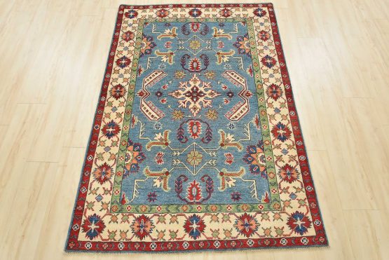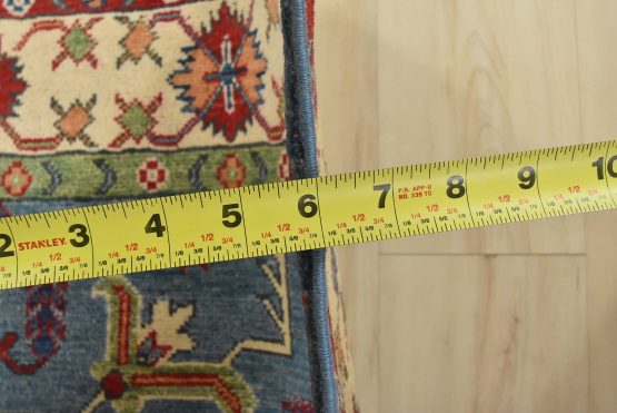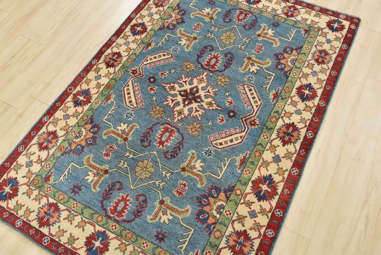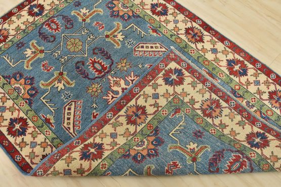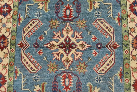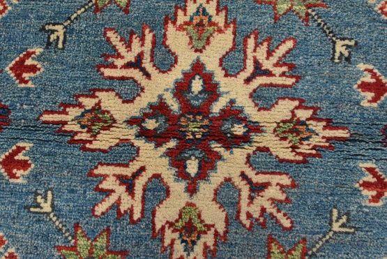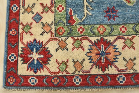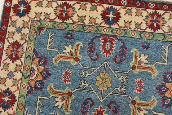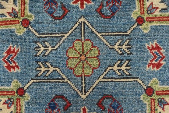 A tribal Caucasian Kazak rug hand-knotted with an all-wool pile on a cotton foundation. This oriental rug features a central geometric medallion surrounded by geometric motifs set against a blue background. It is new and in excellent condition.