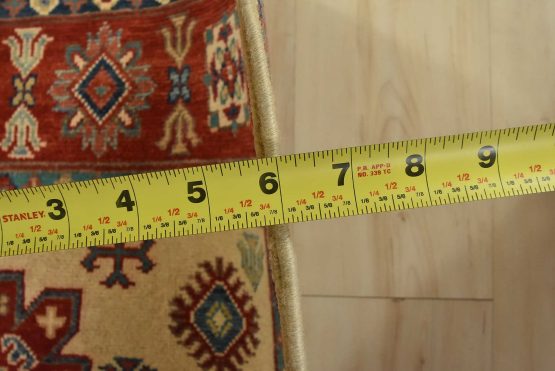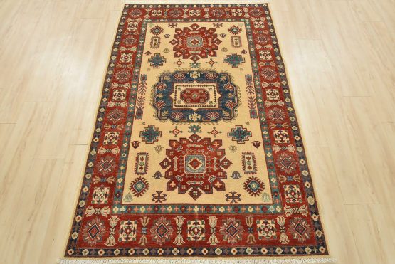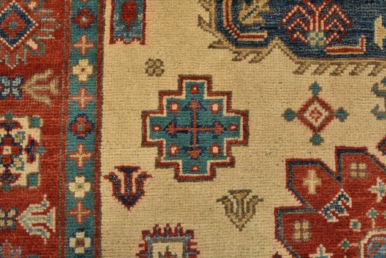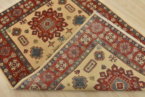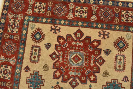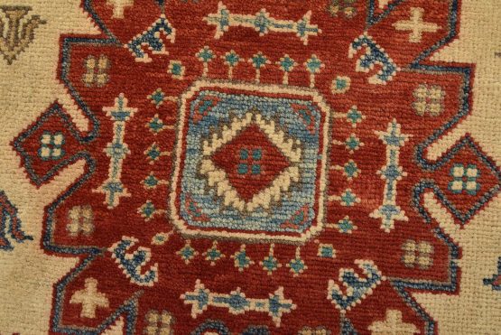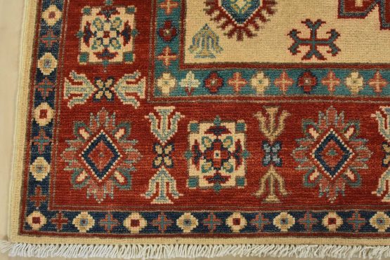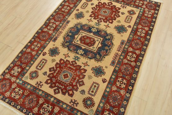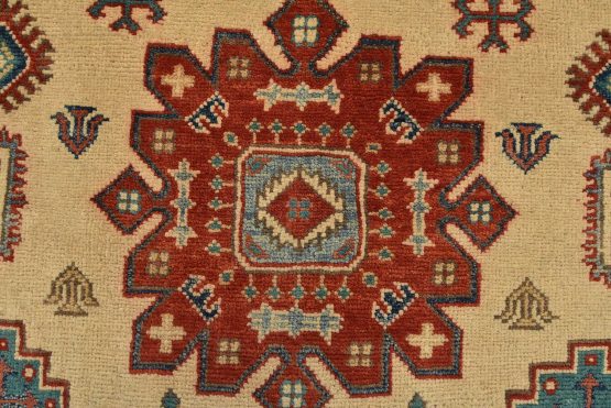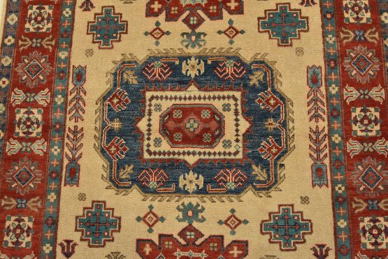 A tribal Caucasian Kazak rug hand-knotted with an all-wool pile on a cotton foundation. This oriental rug features geometric medallions surrounded by geometric motifs set against a beige background. It is new and in excellent condition.