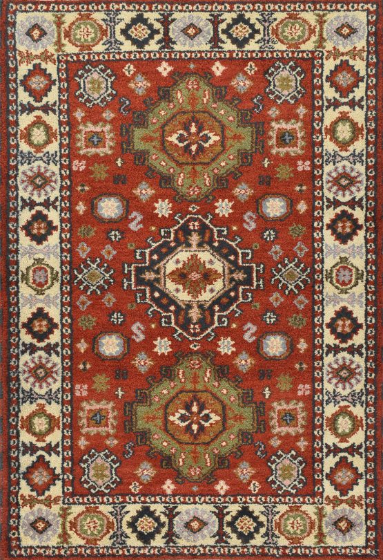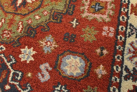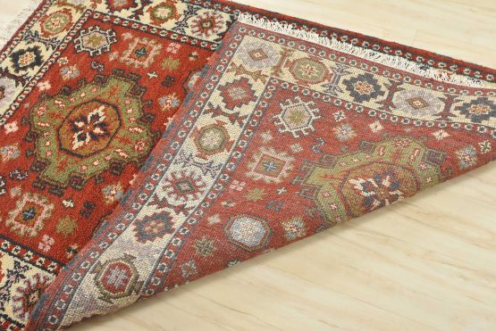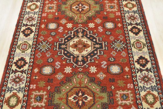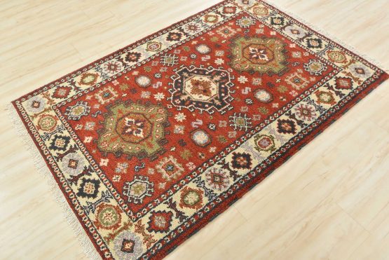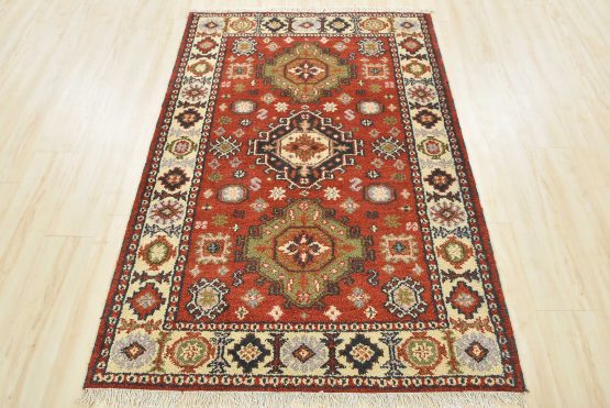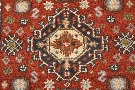 A tribal Caucasian Kazak rug hand-knotted with an all-wool pile on a cotton foundation. This oriental rug features geometric medallions surrounded by geometric motifs set against a rust-colored background. It is new and in excellent condition.