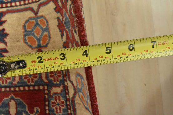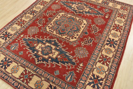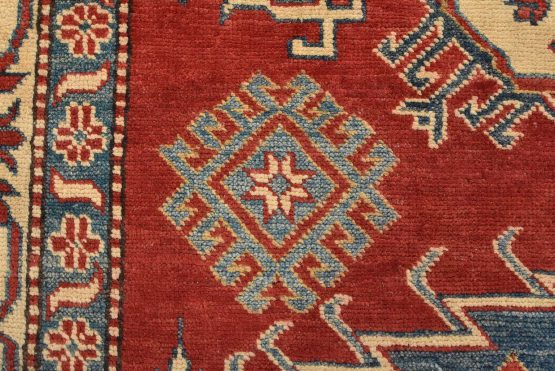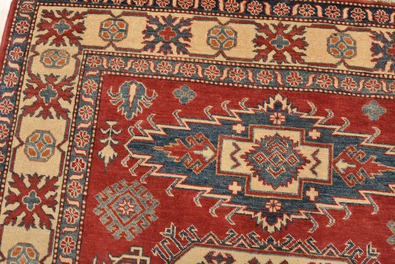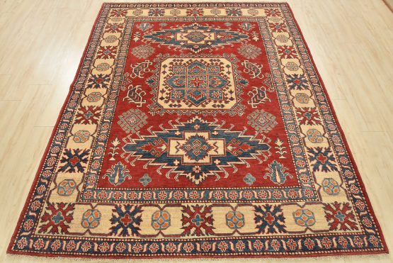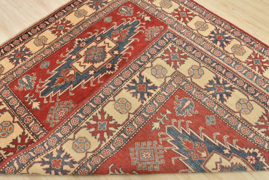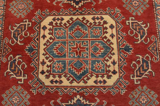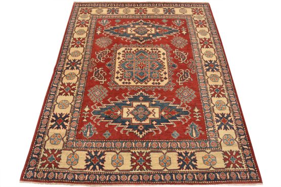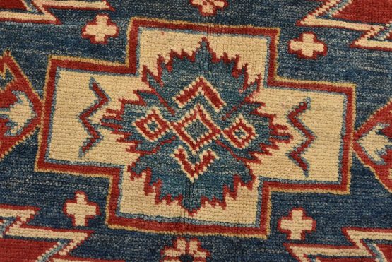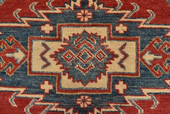 A tribal Caucasian Kazak rug hand-knotted with an all-wool pile on a cotton foundation. This oriental rug features three medallions surrounded by geometric motifs set against a red background. It is new and in excellent condition.