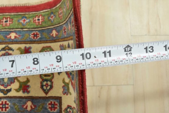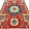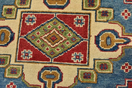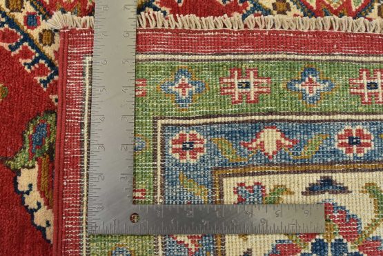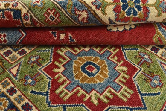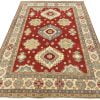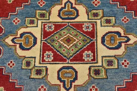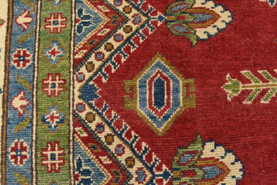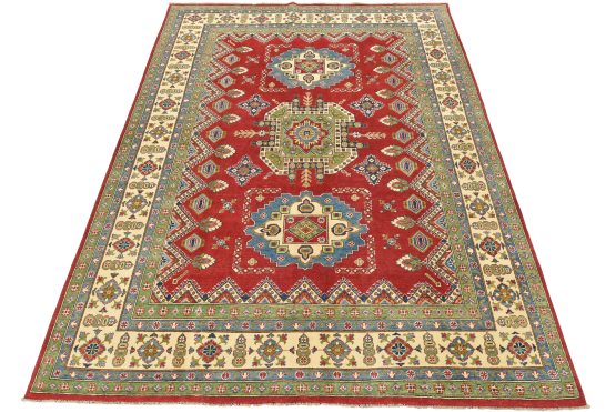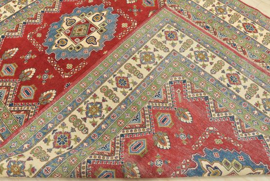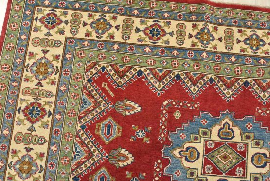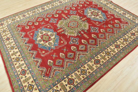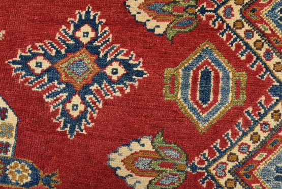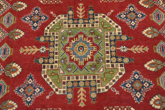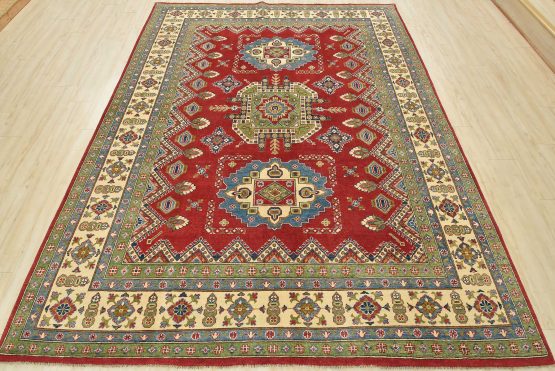 A traditional tribal Caucasian Kazak rug hand-knotted with an all-wool pile on a cotton foundation. This oriental rug features geometric medallions surrounded by geometric and floral motifs set against a red background. It is new and in excellent condition.