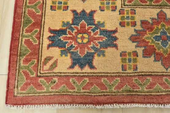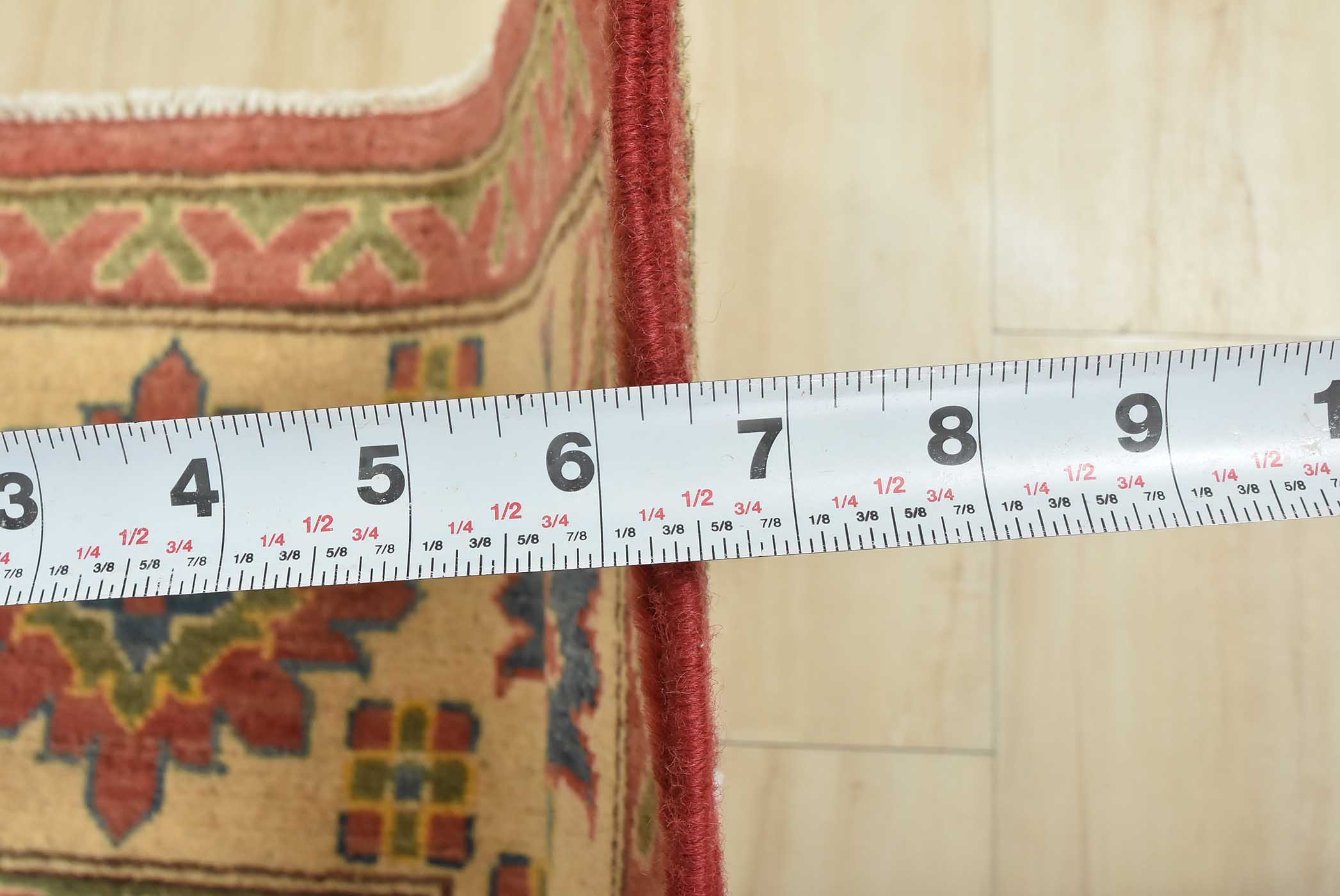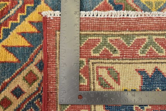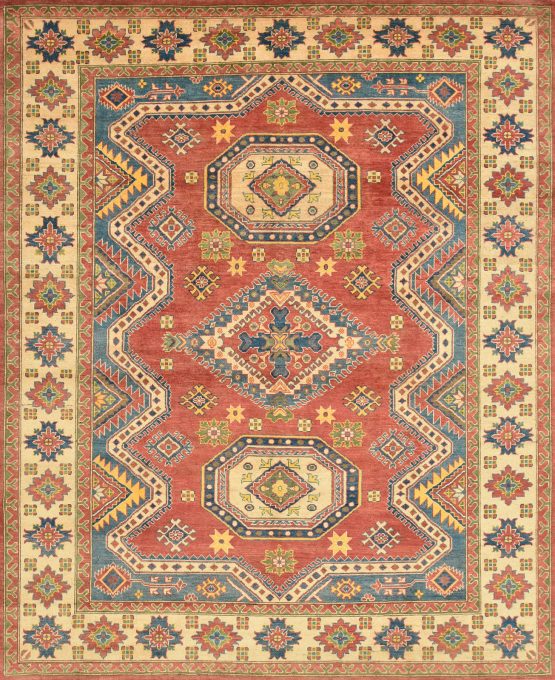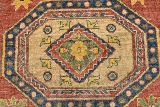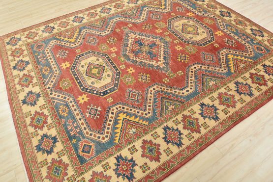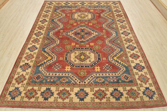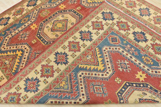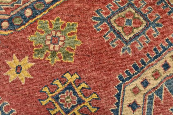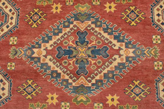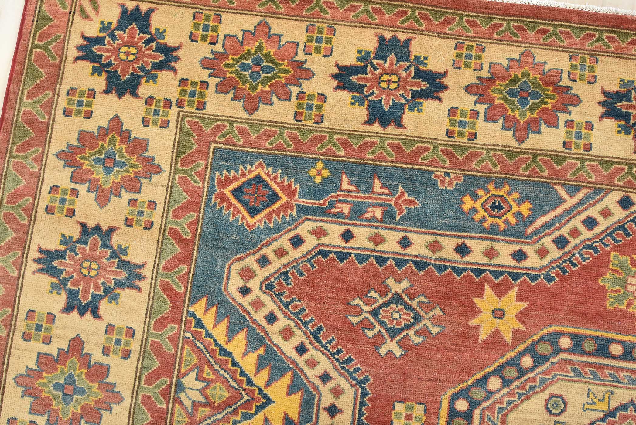 A tribal Caucasian Kazak rug hand-knotted with an all-wool pile on a cotton foundation. This oriental rug features geometric medallions surrounded by geometric motifs set against a red background. It is new and in excellent condition.