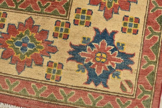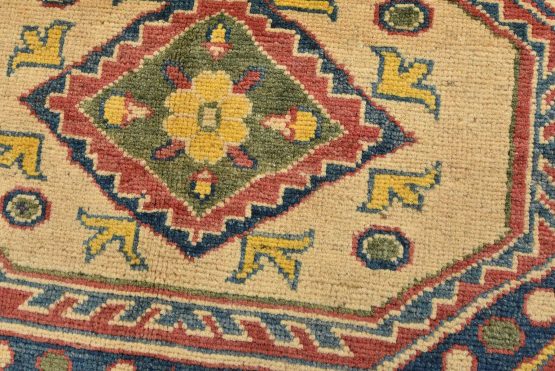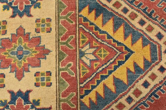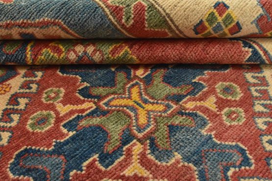 Original antique Kazak rugs from the Caucasus region inspire the creation of new Kazak rugs. These rugs are woven with fine wool using traditional Kazak patterns and finished with a low-cut pile, giving them an authentic vintage look.