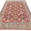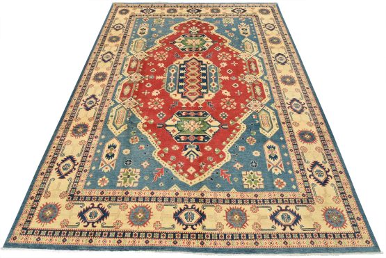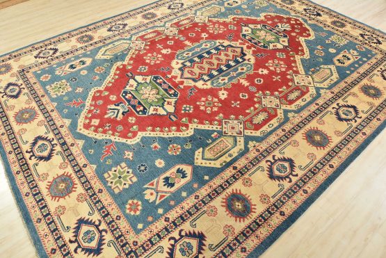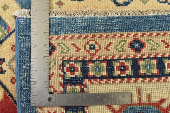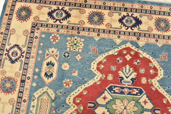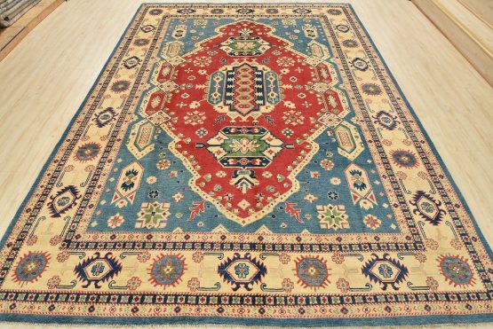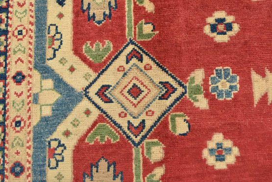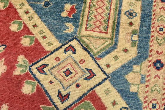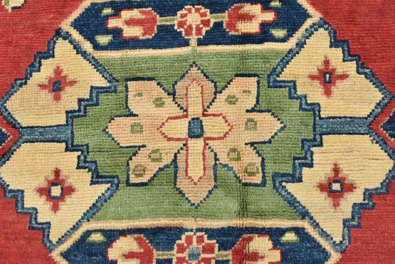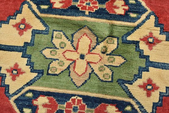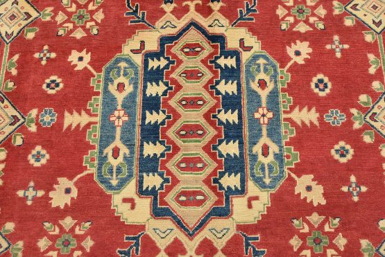 A tribal Caucasian Kazak rug hand-knotted with an all-wool pile on a cotton foundation. This oriental rug features a central geometric medallion surrounded by geometric motifs set against a red background. It is new and in excellent condition.