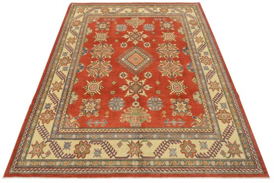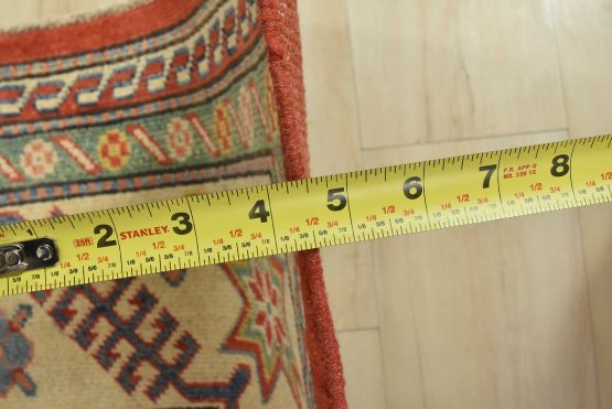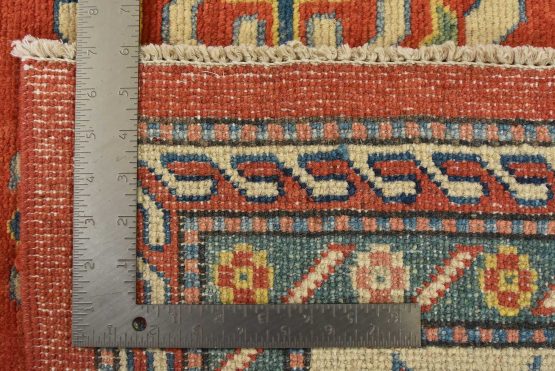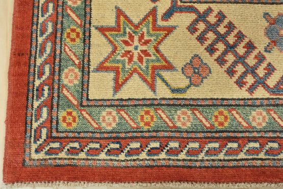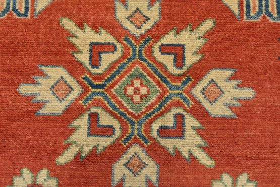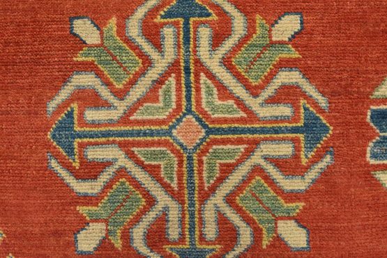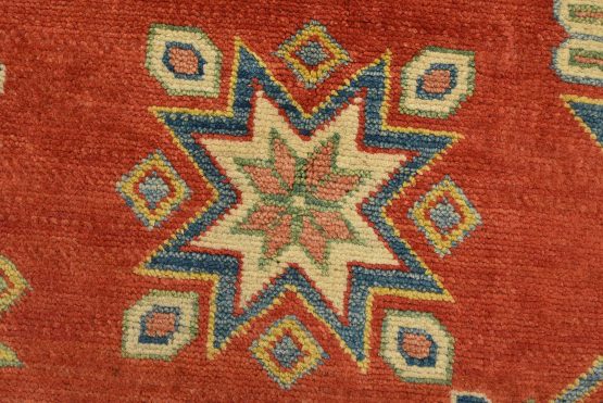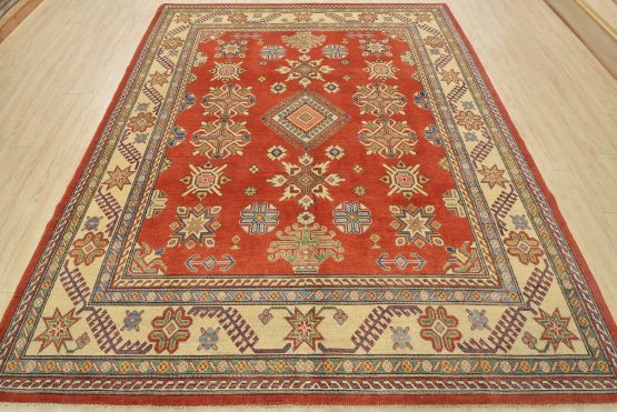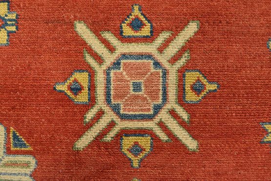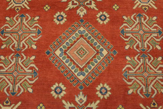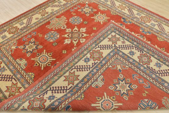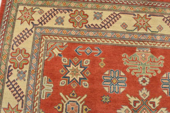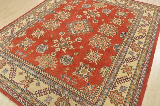 A tribal Caucasian Kazak rug hand-knotted with an all-wool pile on a cotton foundation. This oriental rug features an all-over design with geometric motifs set against a red background. It is new and in excellent condition.