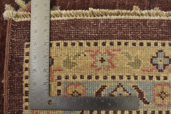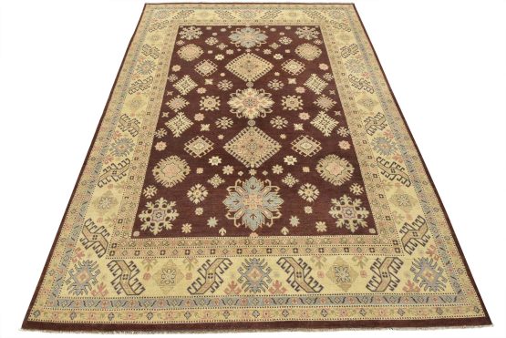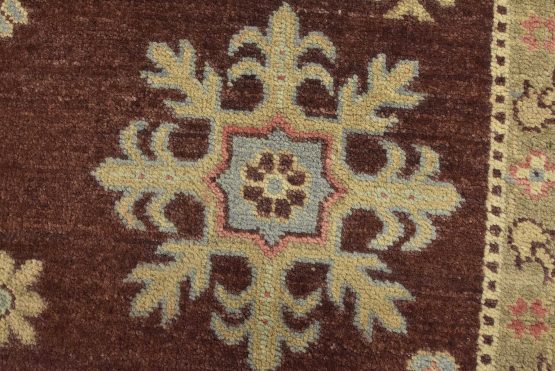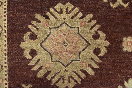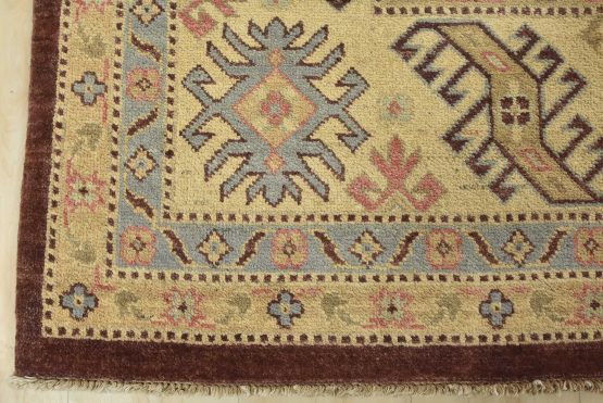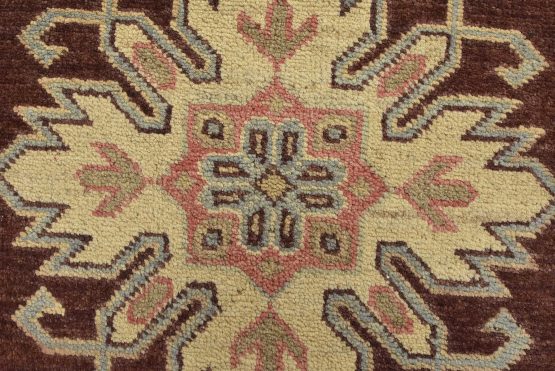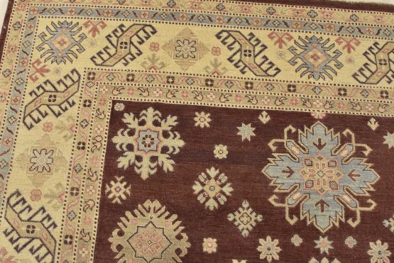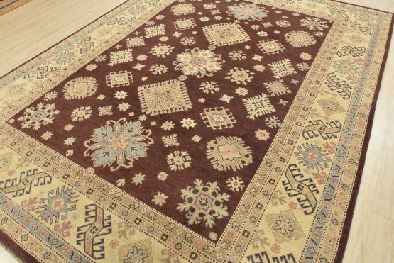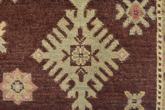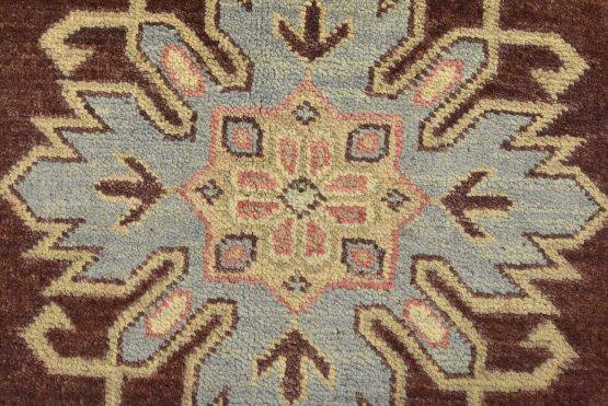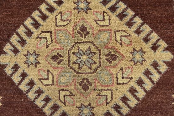 A tribal Caucasian Kazak rug hand-knotted with an all-wool pile on a cotton foundation. This oriental rug features a row of geometric medallions down the middle surrounded by small geometric motifs set against a brown background. It is new and in excellent condition.
