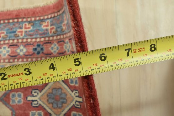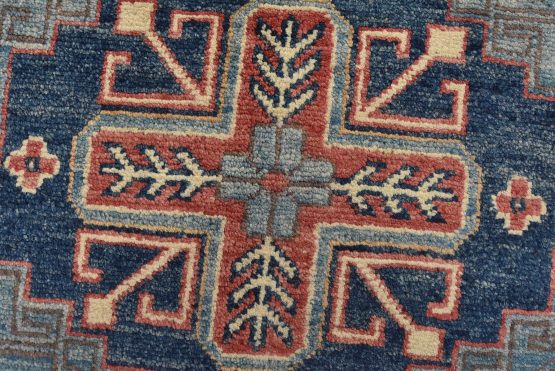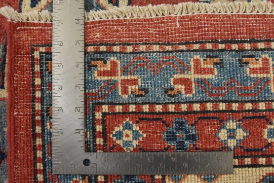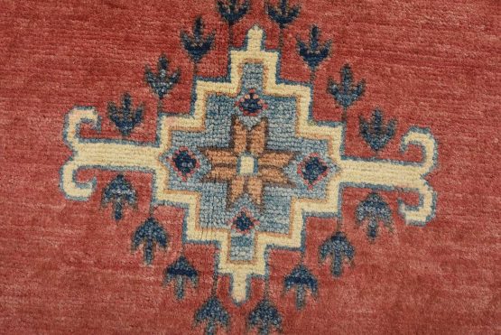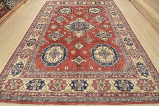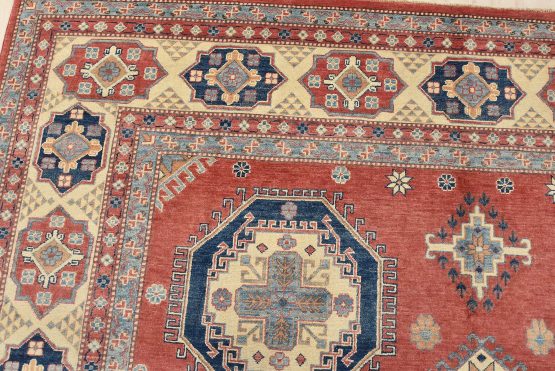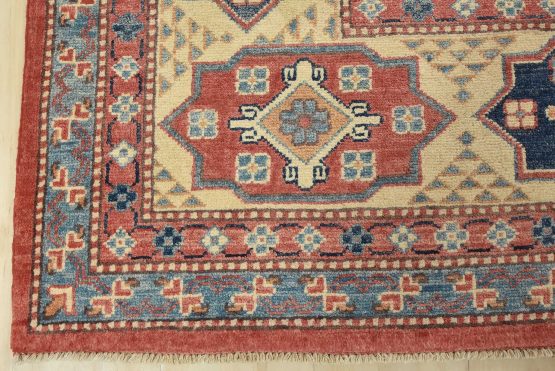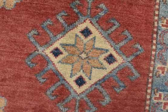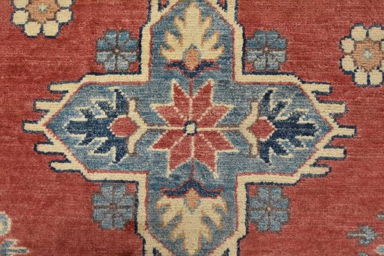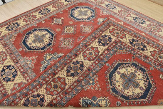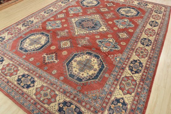 A traditional tribal Caucasian Kazak rug hand-knotted with an all-wool pile on a cotton foundation. This oriental rug features a central geometric medallion surrounded by other medallions and geometric motifs set against a red background. It is new and in excellent condition.