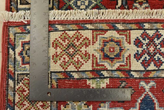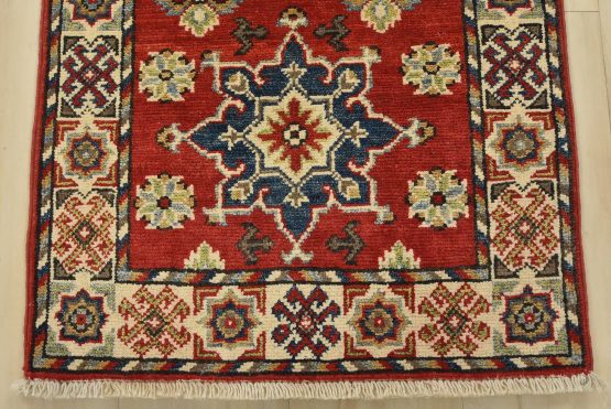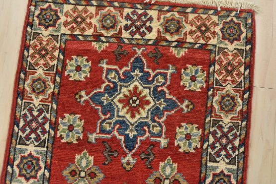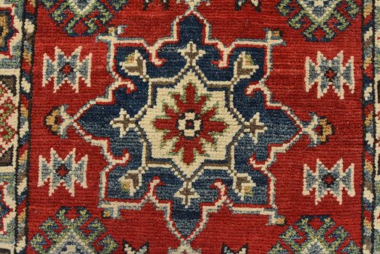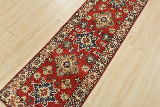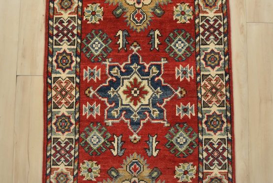 A tribal Caucasian Kazak runner hand-knotted with an all-wool pile on a cotton foundation. This oriental rug features a row of geometric medallions set against a red background. It is new and in excellent condition.