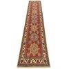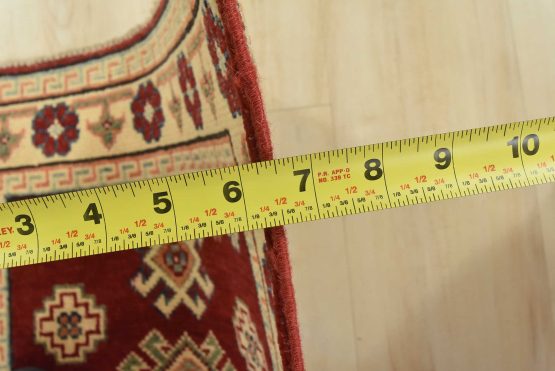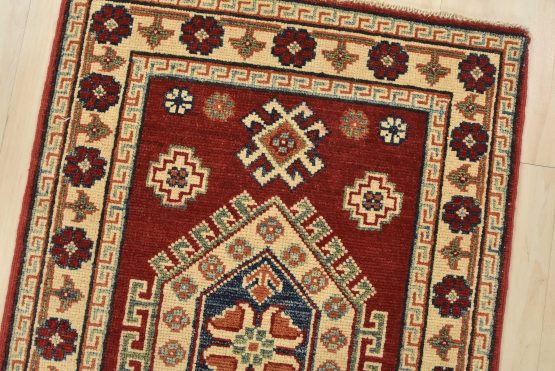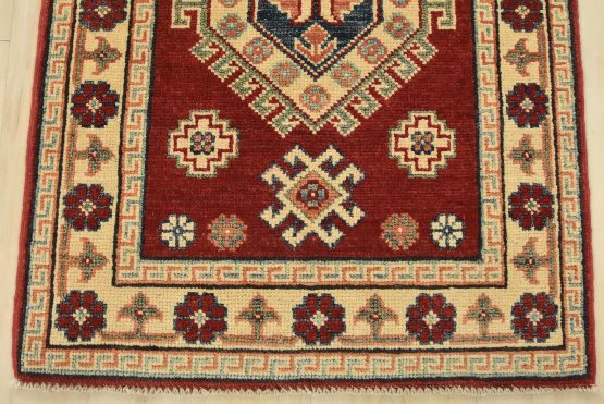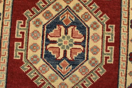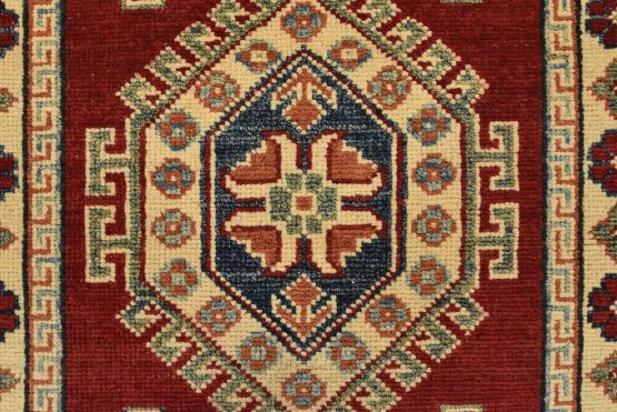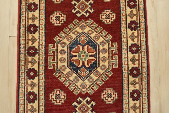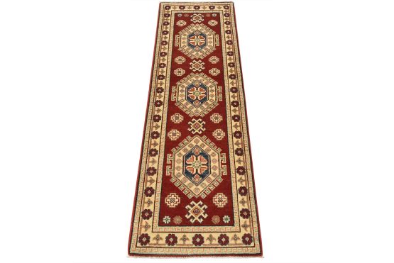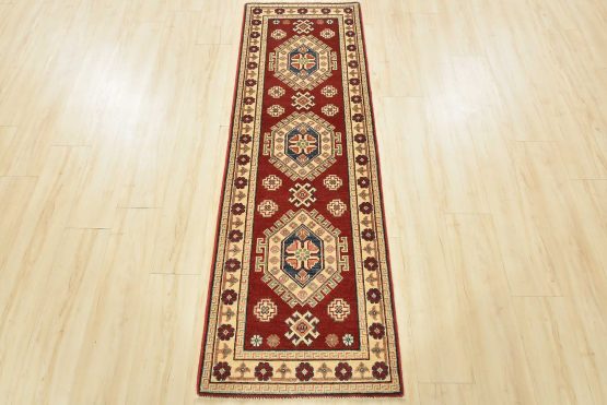 A tribal Caucasian Kazak runner hand-knotted with an all-wool pile on a cotton foundation. This oriental rug features a row of geometric medallions surrounded by small geometric motifs set against a red background. It is new and in excellent condition.
