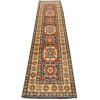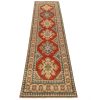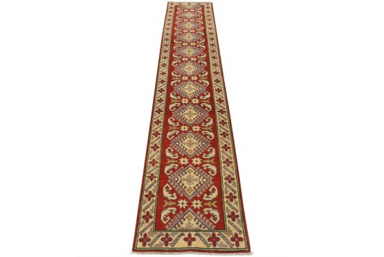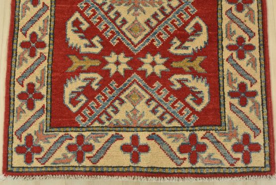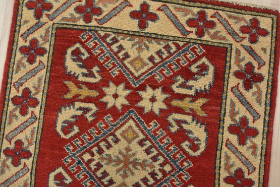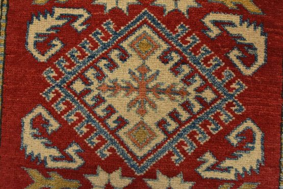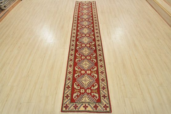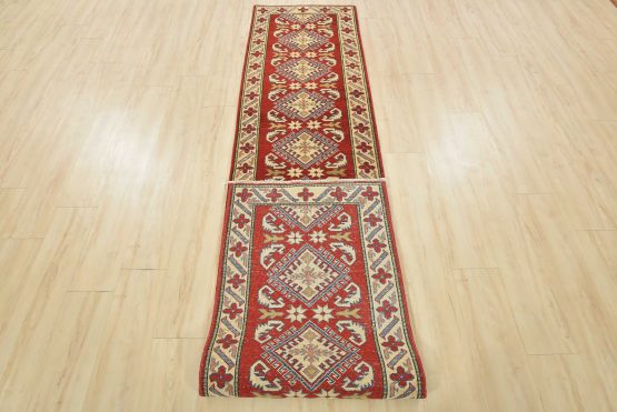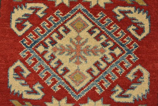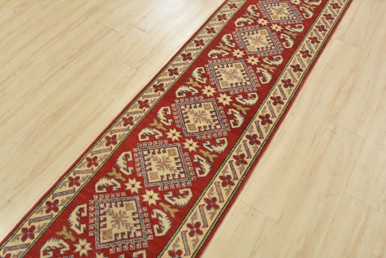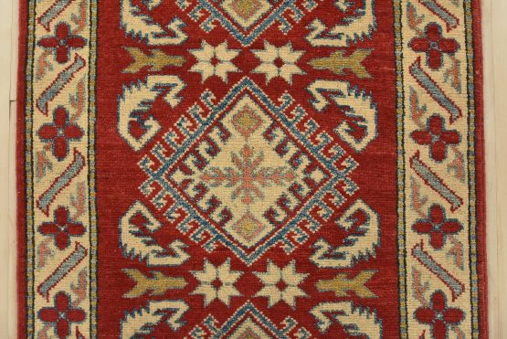 A tribal Caucasian Kazak runner hand-knotted with an all-wool pile on a cotton foundation. This oriental rug features a row of geometric medallions surrounded by small botanical motifs set against a red background. It is new and in excellent condition.