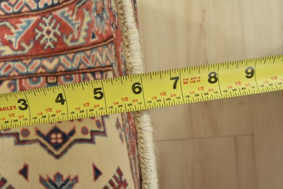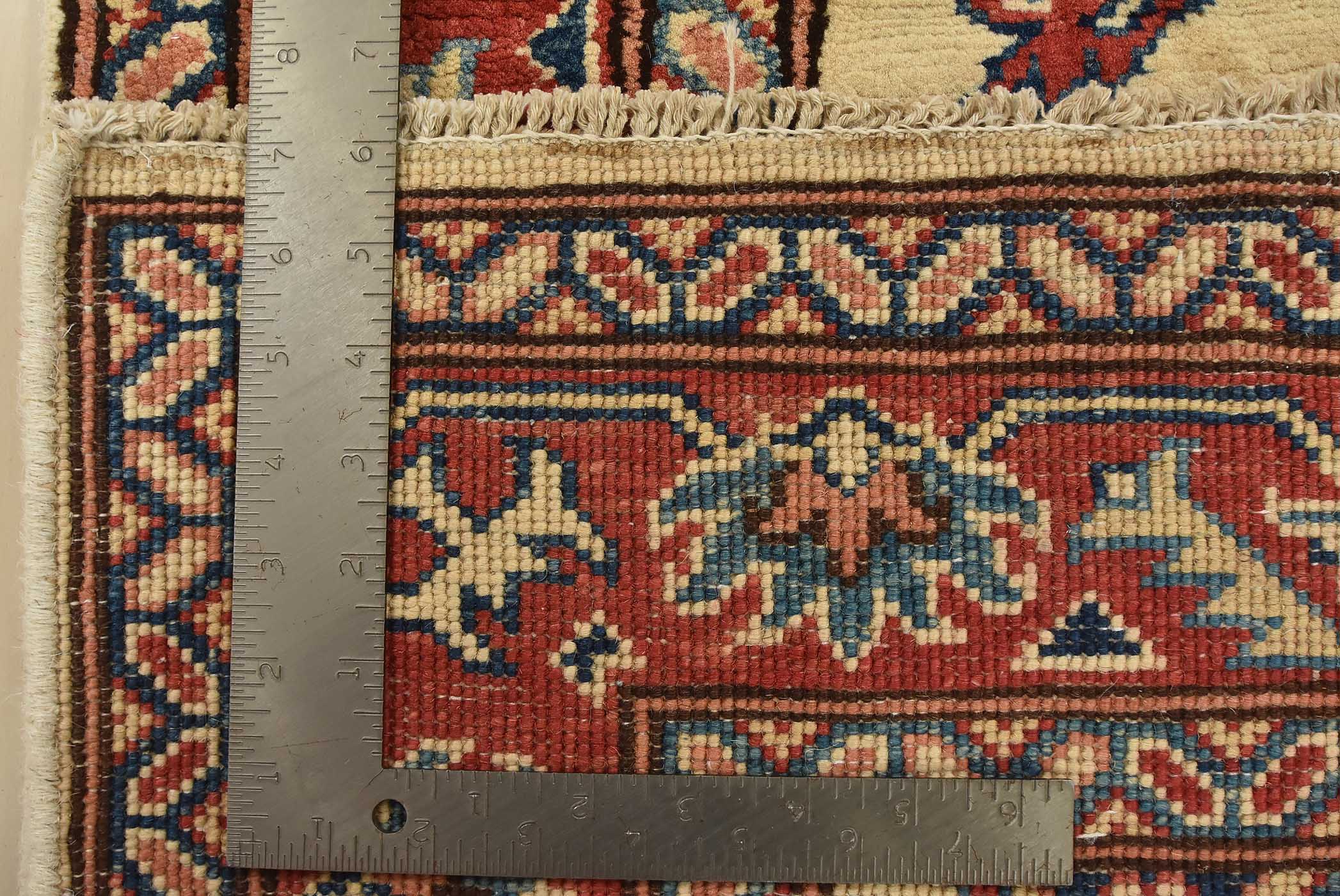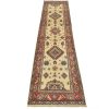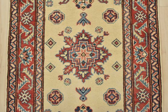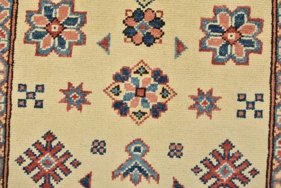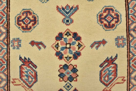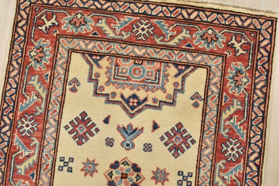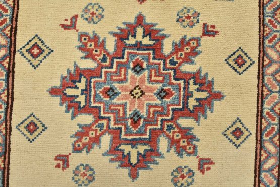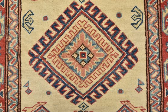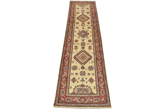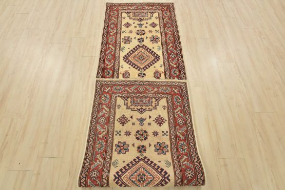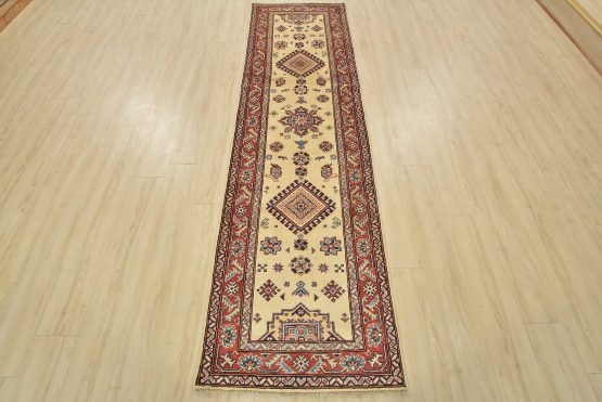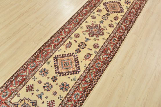 A tribal Caucasian Kazak runner hand-knotted with an all-wool pile on a cotton foundation. This oriental rug features geometric medallions surrounded by geometric motifs set against a beige background. It is new and in excellent condition.