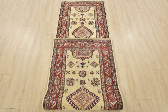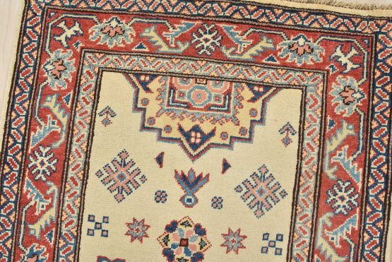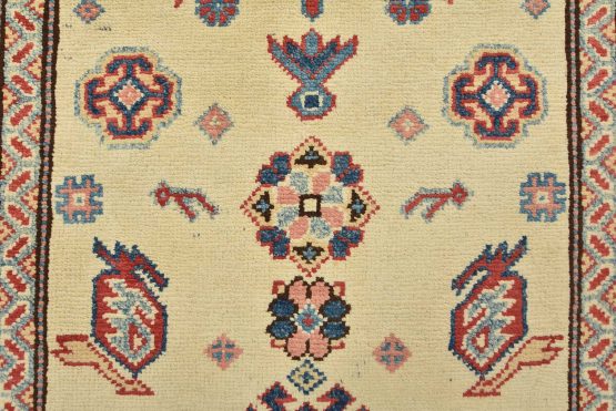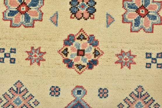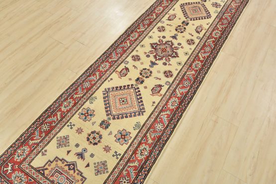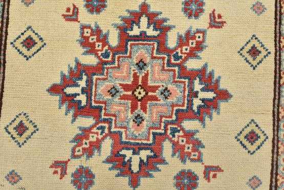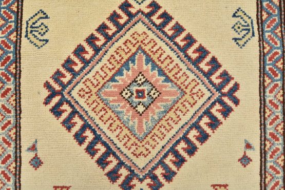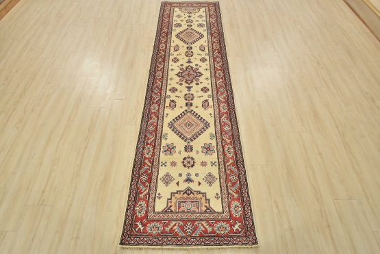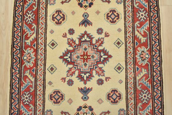 A tribal Caucasian Kazak runner hand-knotted with an all-wool pile on a cotton foundation. This oriental rug features geometric medallions surrounded by geometric motifs set against a beige background. It is new and in excellent condition.