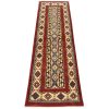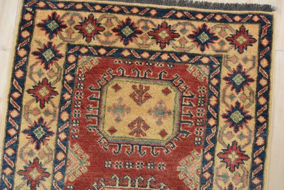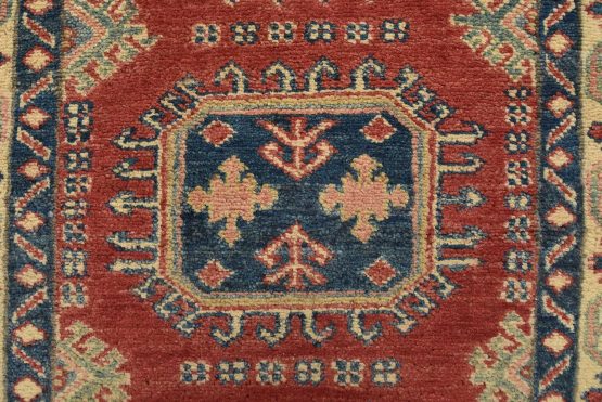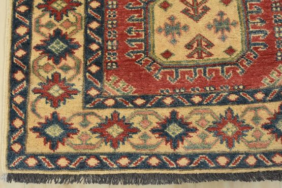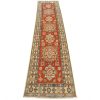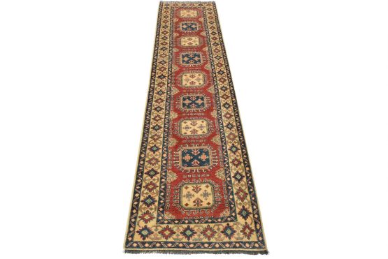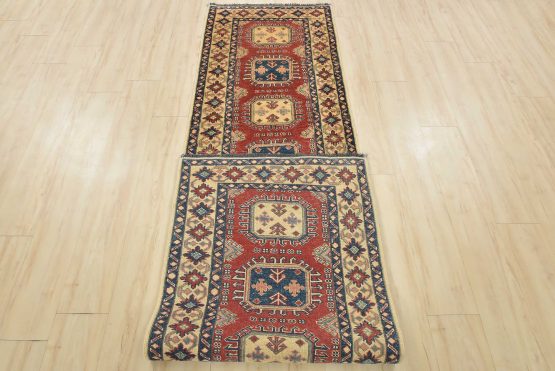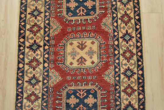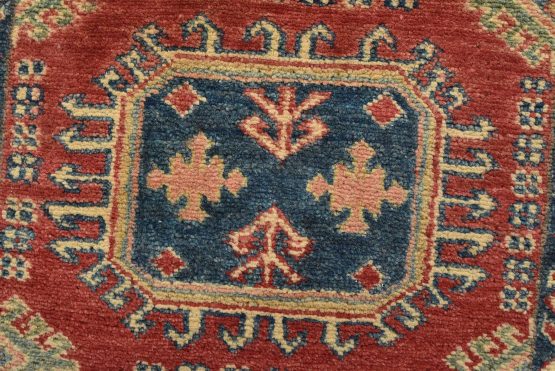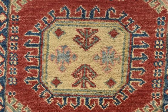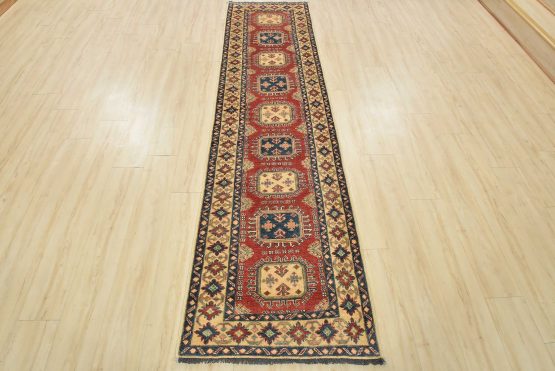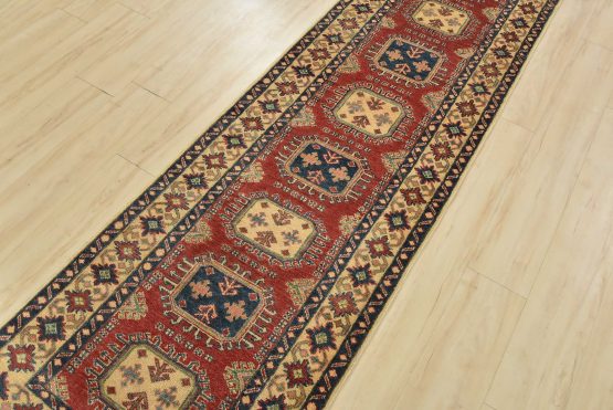 A tribal Caucasian Kazak runner hand-knotted with an all-wool pile on a cotton foundation. This oriental rug features a row of geometric medallions set against a red background. It is new and in excellent condition.
