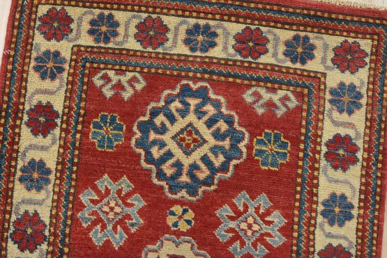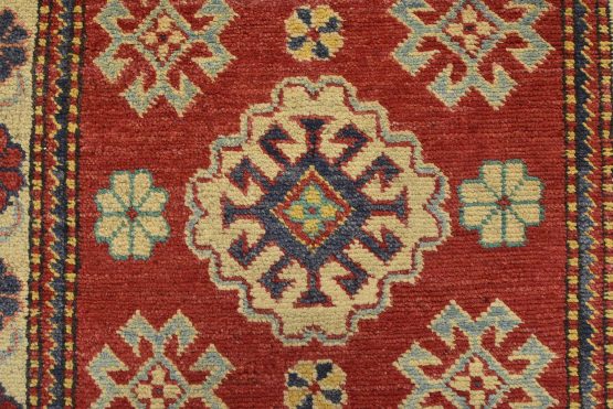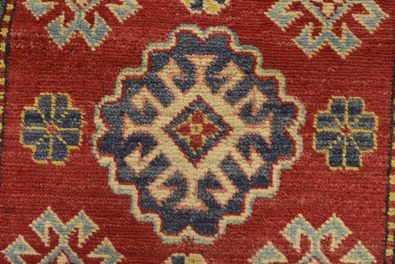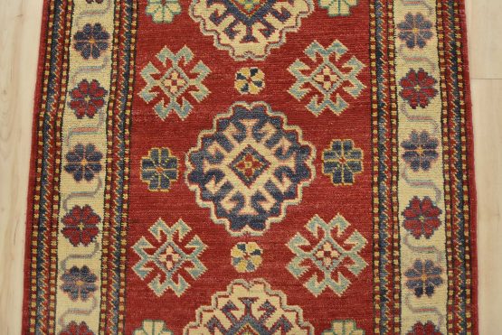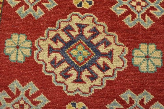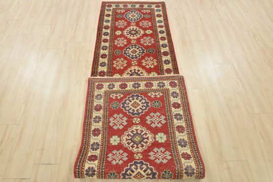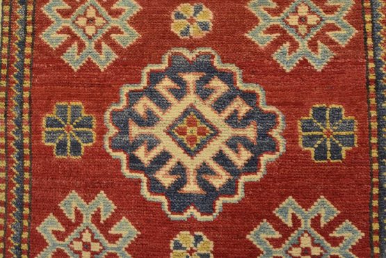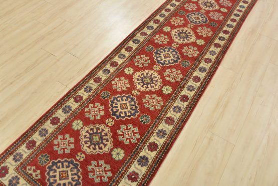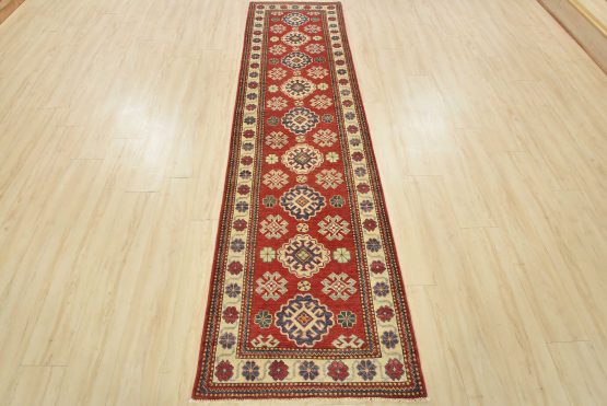 A tribal Caucasian Kazak runner hand-knotted with an all-wool pile on a cotton foundation. This oriental rug features a row of medallions surrounded by small geometric motifs set against a red background. It is new and in excellent condition.
